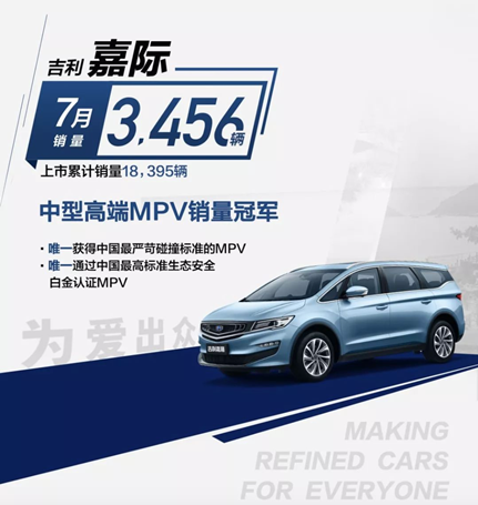 近日,吉利汽车发布7月销量数据,其7月总销量达91375台,再度蝉联中国品牌月销量冠军宝座。目前,吉利汽车1-7月累计销量743055辆,完成136万年销目标的54.6%。其中,作为吉利旗下首款MPV车型,嘉际销量颇为亮眼,7月销量3456台,环比上升10.7%,超越多款合资竞品,领跑中型高端MPV销量冠军,俨然成为吉利汽车新一增长点。