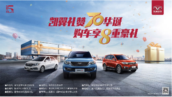金九银十黄金季,凯翼品牌五周年。8月28日,凯翼迎来了五周年品牌日,时逢中华人民共和国70华诞,凯翼以此为契机,开启钜惠大促活动,为各位消费者奉上8重购置豪礼,既是为了答谢社会对于凯翼的信任与支持,也是切实地为广大消费者送福利。