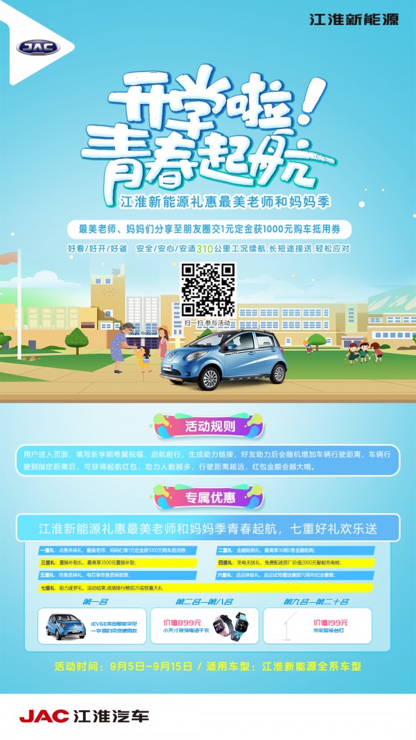 9月初至,江淮新能源喜迎开学季,携好看、好开、好省的“全能三好生”iEV6E青春版及全系车型前来报到,青春起航,礼惠最美老师和妈妈季。 即日起至9月15日,用户可扫描上方图片中的二维码参与活动,赢取红包,活动结束后排行榜前20名更有iEV6E青春版豪华型一学期的免费使用权、小天才视频电话手表、米家智能台灯相送。除此之外,全系车型还有专属优惠欢乐送:点亮未来礼,最美老师、妈妈们享1元定金获1000元购车抵用券;金融助购礼,最高享36期0息金融助购;置换补贴礼,最高享3500元置换补贴;充电无忧礼,免费配送原厂价值2000元的智能充电桩;终身质保礼,非营运车辆电芯享受终身质保政策;进店体验礼,进店试驾赠送建国70周年纪念徽章。 好看:颜值即正义,多彩青年换装大不同 在这个看脸的时代,没有颜值便失去了发言权。江淮iEV6E青春版在典雅白配色的基础上,推出全新的法兰红和星空蓝配色,搭配黑色车顶,双色潮派设计尽显运动风范。典雅白——儒雅书生;法兰红——魅力少女;星空蓝——逐梦青年,你是哪一款? 逐梦青年——星空蓝iEV6E青春版 iEV6E青春版整体设计突出“人本”理念,前脸造型酷似人脸形态:“萌眼”大灯、梯形中网“大嘴”、与江淮新能源专属logo融为一体的“鼻型”充电口,“酒窝”雾灯以及“胡须”金色裙边,萌态尽显。 内外兼修的iEV6E青春版在内饰设计上也别具一格。皮质平底式多功能方向盘、7英寸中控屏、旋钮式换挡旋钮、机械式手刹以及带反差色缝线的软质内饰和仿皮座椅让车内质感有着10万元级别的越级感受。 好开:行稳且易驾,并不只是说说而已 对于微型车来说,总有人怀疑这么小的车开起来到底稳不稳,高速行驶下会不会很飘?如果你亲自试驾过iEV6E青春版,相信你一定不会再有这种疑虑。和大众成立江淮大众合资公司后,江淮新能源的产品在底盘调校上总能带给人们非常大的惊喜,新车采用的是前麦弗逊独立悬架+后扭力梁半独立悬架的常规化配置,但是整体的底盘滤震性和操控感都带给驾驶者非常优秀的反馈,江淮新能源全新的第八代技术的调校功力尽显。 行稳易驾,实力见证 这么小巧的车,续航靠谱吗?很多消费者看到新款iEV6E青春版后脑海中会出现这个疑问。诚然,对于小尺寸纯电动车来说,主要是用于城乡间的代步,对于续航里程实际需求没有那么高,但是消费者总是希望续航越高越好,以备不时之需。这点上,新车用高达310km的综合工况续驶里程回应了用户的高期望。优异的快充性能,让30%SOC充到80%仅需40分钟,充电10分钟即可带来40km的续航里程。除此之外,独家专利技术的单踏板能量回收系统,还能够提升17%的续航,畅行无忧,告别里程焦虑。 小车马力足,新车搭载永磁同步电机,最大功率45kW,最大扭矩150N.m,0-50km加速时间仅为5.5s,同级别最强动力。全新换装的六合一电驱动集成度更高,带来更强的性能和更低的能耗。 好省:省钱又省心,经济适用车居家必选 选老公要选经济适用男,选车也要选经济适用车。iEV6E青春版补贴后售价仅为6.55万元起,且免除车辆购置税和车船税。每公里使用成本低至7分钱,相比燃油车保养成本更低,用车、养车无负担。 经济适用车,省钱又省心 想要省钱又省心,安全性能必不可少。新车采用磷酸铁锂电池,热稳定性高,且循环寿命长,全新质保升级后,电芯享受终身质保政策。整车经受过九大极端工况验证,外加丰富的主被动安全配置,超越同级别的车型,小车享受大安全! 有一种人每天醒来第一件事不是吃早餐,而是查今天车辆限号情况;还有一种人口袋里揣足了钱却久久摇不到一张车牌。选择江淮iEV6E青春版,你将告别这两种人生,安享自由绿色出行。 好看、好省又好开,江淮新能源这样的“全能三好生”,你爱吗? |