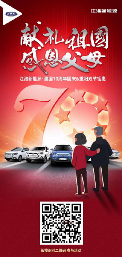 光砍价还不够,9-10月抢购江淮新能源全系车型即可尊享新中国成立70周年献礼价,最高立省6000元,更有五重豪礼欢乐送,你还在等什么!