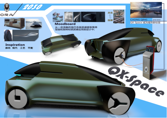 经过两个月的征集,欧拉携手青春BANG共同开启“全球青年共创计划”进入评选阶段。欧拉是广受年轻人关注的新能源汽车品牌,青春BANG是中国首个推动年轻成长与社会创新孵化的前瞻性、国际化平台。此次跨界强强联手,在设计圈和大众圈引起了不小的轰动。大赛聚集汽车工业设计类、汽车平面设计类、汽车文案策划类三大类别,大赛共计收到投稿1260件,其中大众组1000件,专业组260件。由此可见,大众参与热情极高,同时,赛事在专业领域也引发了热烈回应。 作为深受年轻人喜爱的新能源汽车品牌,欧拉的产品始终以用户需求为核心,欧拉的创意市场活动始终坚持与用户打成一片,与粉丝共同经营“欧拉试验田”,共同促进欧拉乃至新能源汽车行业的发展。这1000余组天马行空、脑洞大开的作品不仅是参与者的创意,更反映了他们对美好交通的期待,下面让我们一起穿越时空去创意者的未来空间旅行。 拓展无限可能,重新定义“空间” “2030QX-space”是一个突破性作品,它将汽车这个概念延展到“空间”,这与欧拉“开放”的品牌理念相一致:汽车不仅仅是一个代步的工具,它还是探索另一种生活可能的“通道”。