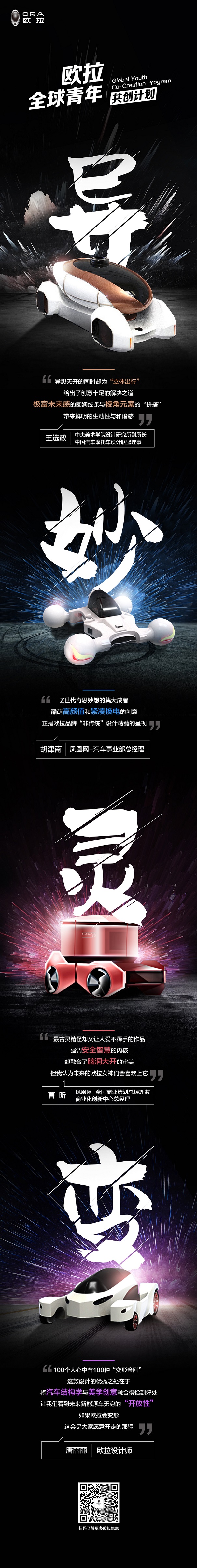 欧拉全球青年共创计划大赛评审阶段落下帷幕,千余位海内外参赛设计师们大开脑洞,凭借优秀作品俘获众多评委老师的“芳心”。一些优秀作品更是让大咖评审团都感叹“爱了爱了”。大咖评审团究竟被哪些作品圈粉呢?让我们一起来康康这些“未来车”到底是什么亚子吧! |