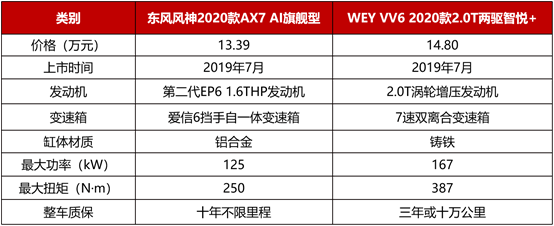 每一次的旅行,都让一家人的陪伴更有意义。而旅行,并不是长假或黄金周的专利,每个目的地、每个季节都有它独特的美。找一个周末,带着家人去呼吸新鲜的空气,也是一家人充电、放松的好选择。自驾游,不同于日常通勤代步,对一辆车在动力、空间、安全和舒适度方面都有着较高的要求,SUV车型凭借更好的通过性和空间等优势,更受自驾消费者的青睐。 在自主品牌领域12万级的价格区间里,可选车型很多,以最近很抢镜的东风风神2020款AX7来说,自上市以来表现不俗,而售价略高的2020款长城WEY VV6也有着很好的口碑。那么,我们就以东风风神2020款AX7 AI旗舰型(简称2020款AX7)同WEY VV6 2020款2.0T两驱智悦+(简称2020款VV6)进行对比,看看它们的真正实力如何? 实力过硬,动静自如每一程 相信每个买车的人最感兴趣的还是这车的三大件水平,一辆具备了靠谱三大件的车,在驾控方面自然能带来不俗的体验。今天要来对比的2020款AX7与WEY VV6也是如此,二者作为国产SUV中的精品车型,其实在三大件方面都各有优势。 尽管售价更为实惠,2020款AX7的“硬实力”却一点也不弱,在这个价位下,为用户提供了具备合资水平的三大件。动力系统由来自PSA、并以宝马TVDI技术加持的1.6T发动机+日本爱信三代变速箱组成。它的最大马力为170Ps,最大功率为125kW,最大扭矩为250N·m,在平顺灵敏的爱信三代6AT变速器助力下,这款尺寸越级的SUV实测油耗仅8L左右。再搭载精细调教后的CR-V底盘,让这款车享有了成熟稳定的动力输出之余,在油耗经济性与驾乘舒适性上,都更加有所保障。 在焕新后,2020款WEY VV6搭载的是长城全新一代2.0t电控双流道涡轮增压直喷发动机,并搭配7速双离合变速箱。从参数上来看,动力性能很强劲,不仅最大马力达227Ps,其最大功率为167kW,最大扭矩为387N·m。不过值得注意的是,在铝合金缸体已成为大势所趋的当下,这款发动机的缸体材料却是铸铁打造的,当然在重量及导热性上没有什么优势。尽管它标注的工况油耗不算高,可从这款发动机之前的记录来看,实际驾驶中的综合油耗基本要到9-10L/100km左右。 当然,无论追求稳定成熟的动力保障,还是想要更强劲的动力输出,都要看消费者自己在出行时的喜好,而这两款自主品牌SUV就给出了不同的选择,可以说各自都有着一定优势。 有容乃大,大空间大享受 作为家用车而言,空间也是很多消费者尤为看重的一个考量。同样的预算,更大的车身尺寸,意味着更舒适的驾乘享受和储物空间,消费者更愿意选择体型和空间更大的车型。 2020款AX7和2020款VV6,在外观造型上各有千秋。车身数据上,2020款AX7以1880mm同级最宽车身和2715mm的超长轴距,领先2020款VV6,车身长度也超出20mm,使得2020款AX7拥有更为宽敞的车内空间。乘坐空间宽敞,不拥挤,后排地板无凸起,脚下舒适,使得长途自驾游更轻松惬意;951mm超长行李箱长度,行李、玩具、土特产,统统装下无压力。 即刻出发,安全比什么都重要 相对于日常市区出行,自驾游的路况复杂、路程和驾驶时间更长,对驾驶者而言,是体力和驾驶技术的综合考验。这两款车都配备了百万像素的超清360°全景影像,在低速行车、通过狭窄空间和倒车时提供3D视角的360度清晰视野,避免剐蹭发生。现在的路上,新手司机、二把刀司机特别多,紧急刹车造成后车追尾屡见不鲜,在行车过程中,与前车保持安全距离,特别重要。这两款车均搭载FCW前碰撞预警系统和AEB自动紧急刹车系统,以周全的主动安全防护手段,更大程度避免追尾,让自驾旅程更安心。 以“Collie牧羊犬全维智能安全系统”技术品牌为主打的2020款VV6,很多高级别的安全配置在该对比车型中并未出现。而2020款AX7越级搭载BSD盲点监测系统,在并线、超车或遇到其他车超车变线时,可智能提醒驾驶者注意两侧车辆,确保行车安全,可谓自驾游的得力伙伴。同时,2020款AX7配备TRW天合电子卡钳,百公里满载下刹车距离为37.15米,领先同级。另外,2020款AX7配备自动泊车系统,抵达休息区,一键停车,简单、省心、安全,这些越级的配置,使得2020款AX7性价比更高。 长途旅行,舒适永远不打折 有人说,汽车是现代人的第二空间,是一个移动的家。一场理想的自驾旅行,既要享受到沿途风景的美,也要最大化减少驾驶者和乘客的疲劳感,因此对座椅的舒适度有这着更高的期待。 相对于2020款VV6,2020款AX7对驾乘者更友好。它包含主座椅调节包含腰部支撑功能,给予司机在长途驾驶过程中更多的关爱。同时,驾驶位具有记忆功能,当需要更换司机需重新调节座椅高度等设置时,一键切换两组驾驶席座椅记忆,简单,便捷,拒绝繁琐设置。同时,2020款AX7具有前排座椅加热功能,配合比肩合资品牌的舒适座椅,在冬日出行将舒适进行到底。 2020款AX7对驾驶者的体贴,还不仅仅在座椅,更在很多细节方面加分。外后视镜带记忆功能,方便更换司机时,无需繁琐调节,一键切换;其后视镜倒车自动下翻功能,配合360度高清影像,带给驾驶者更安全放心的视野,更享贴心,这些配置在2020款VV6更高级别的配置中才有。 一路走走停停,大大小小的旅行所需,使得后备箱成为使用频率很高的一个储物空间,刚好抱了很多东西,碰到地上有水,内心会蹦出一个大写的无奈。2020款AX7搭载感应式电动尾门,通过脚踢感应方式开启、一按关闭,同时具备高度位置记忆、延时关闭和防夹功能,比2020款VV6更具诚意。 终端价格相近的2020款AX7和2020款VV6,不同的动力配置