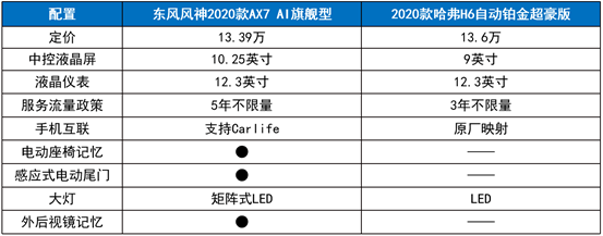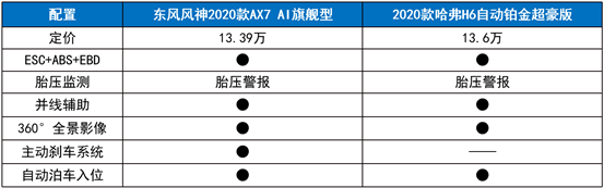 2019年已所剩不多,但中国SUV市场寒冬仍在持续蔓延,不少品牌的汽车销量再一步下降,其中常胜将军哈弗H6的销量也同比下滑了不少。在另一方面,今年又有不少车型都积极致力于车型焕新升级上市,其中有一款自主车型,在动力和安全上与哈弗H6比肩,在智能科技上更胜一筹,同时价格还更加优惠,那就是东风风神AX7。那么两款车的对比究竟能碰撞出什么样的火花?让我们一起同级PK,来看看老前辈2020款哈弗H6自动铂金超豪版和新秀东风风神2020款AX7 AI旗舰型,究竟谁的品质更对味。 注重“表面功夫”——时尚新标杆,车身高大威武 在现代潮流时尚文化的熏陶下,人们纷纷加入“颜值党”,化身为新时代颜控,并秉持外观也是品质的观念,对汽车的外在表现有了更高的要求。 东风风神2020款AX7 AI旗舰型颇具时尚锐动气质。前脸新增时下流行的点状星空格栅,层次性凹凸和流畅性线条完美结合,增添飘逸的动感,远近光一体LED矩阵式前大灯搭配流水式转向灯,更添一份凌厉和科技感,整体外观品质再次提升。与2020款哈弗H6自动铂金超豪版相比,车前大灯造型更加狭长,更显犀利,整体年轻感和时尚感更加明显。 不仅如此,东风风神2020款AX7车身长宽高分别为4645mm*1880mm*1690mm,而轴距长度更达到了2715mm;再来对比一下这款哈弗H6的车身尺寸,会发现哈弗H6仅在高度上超过了2020款AX7。越级的车身尺寸不仅让东风风神2020款AX7 AI旗舰型拥有更为霸气的造型,也让用户可以拥有更为宽绰自由的驾乘空间,无论是自驾出游还是商用载物,车主和乘客都能享受舒适宽敞的驾乘空间与轻松自如的载物空间。 远离“花拳绣腿”——合资三大件,动力更加领先 如果说动力是汽车的心脏,那么操控就是这辆车的灵魂,可以说三大件的水平高低在很大程度上决定了一款车的操控水平。与2020款哈弗H6自动铂金超豪版相比,东风风神2020款AX7 AI旗舰型具备合资血统的三大件,以领先的技术优势,为车主奉献极具质感的驾控体验。 东风风神2020款AX7 AI旗舰型采用新一代EP6 1.6THP发动机,和欧洲同步开发,新增宝马专利的TVDI发动机技术,最大功率125kW,最大马力170Ps,发动机整体动力、加速表现和输出稳定性配合更高于哈弗H6,而百公里综合油耗仅为7.0L,驾驶出行更加经济省钱;同时配东风风神2020款AX7 AI旗舰型备爱信第三代6AT变速箱,技术成熟,换挡迅速、操作便捷、可靠性好。 在仅13.39万的定价下,还新增电子换挡,让驾驶操作更加得心应手,减轻了手上的操作压力,驾驶顺畅感高人一等;更有全新底盘,在欧洲豪华品牌底盘专家评价指导下精细调教,它采用分段阻尼精细调校,能从容应对不同路面工况。具有高灵敏度阀系匹配,有效提升了轮胎接地稳定性。新增阻尼补偿模块,能提供更细腻转向手感,从而达到车身稳定性和舒适性进一步拔高。 相较之下,2020款哈弗H6自动铂金超豪版采用自主开发的1.5T涡轮增压发动机,最大功率124kW、最大扭矩285N·m,最大马力为169Ps,从整体的动力参数来看,虽然与东风风神2020款AX7不相伯仲,它却仅搭载了7速双离合变速器,相信在耐久度与平顺性方面远不及2020款AX7搭载的6AT。此外,哈弗H6的这款自主发动机还暂未公布工况综合油耗情况,相信在燃油经济性方面还有待验证。 享受“智在必得”——科技再升级,尽展真感智能 在“五化”发展如火如荼的当下,智能科技的应用逐渐成为了一款汽车的核心竞争力,不仅让驾乘中增添更多精彩,也能为驾驶者带来更多便利和保护;而判断一辆汽车的智能化水平,首先就得看看搭载的智能车机好用与否。 一如既往,面对新车频出的SUV市场,2020款神AX7的“智造”水平仍然值得我们惊叹。新一代WindLink人工智能车机系统被运用在全系2020款AX7车型上,它不仅具备超精准智能语音识别操控、智能导航、车载双向WIFI、在线音乐、酒店预订等等功能服务,更在原版的基础上实现了12项全新功能升级和6项功能优化。2020款哈弗智能生活云Hi-Life系统虽然是新开发的系统,但在自动铂金超豪版上仅搭载了9英寸中控屏,且仅支持原厂映射;相比之下,东风风神2020款AX7 AI旗舰型不仅多出了10.25英寸超清720P全贴合电容触摸屏、Carlife手机互联,更为用户提供五年不限量的服务流量(2020款哈弗H6全系仅提供三年不限流量),优惠力度和智能享受自然更胜一筹。 当然,不只是人性化车机系统让2020款AX7成为了领智先锋,一系列智能配置的运用,也让它的性价比远超同价位的哈弗H6。2020款AX7 AI旗舰型一口气配齐了远近光一体矩阵式大灯、驾驶席座椅迎宾记忆功能、感应式电动尾门、外后视镜倒车自动调节+记忆等越级配置,而这些功能却并没有在定价更高的2020款哈弗H6铂金超豪版上出现。 出行安然无恙——内外双加磅,保君一路平安 安全是车主最关心的地方,只有主动安全和被动安全的完美配合,行车安全才能落到实处。 作为全新的智慧生态SUV,智能先行的东风风神2020款AX7并不意味着对安全的忽视,相反,它在行车安全上也为用户考虑的相当周到。 东风风神2020款AX7 AI旗舰型搭载了全面的主动安全系统功能配置,与哈弗H6铂金超豪版一样将ESC+EBD+ABS、胎压监测系统列为标配的同时,更搭载有BSD盲点监测系统、百万级像素的超清360°全景影像、自动泊车等。除此之外,它还比2020款哈弗H6自动铂金超豪版多出了预主动刹车系统,能更有效帮助车主避免及减轻碰撞伤害,驾驶2020款AX7出行当然更加安全。 不