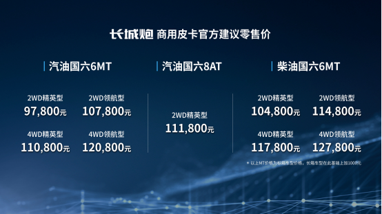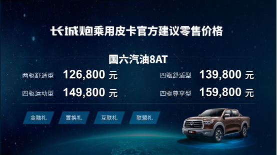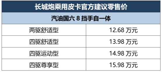 11月03日,长城炮乘用皮卡&商用皮卡在河北正式上市,发布“超级五星”计划,打造全场景皮卡车生活,未来长城炮将在全球市场全面发力,与福特、丰田等品牌正面竞争,剑指世界前三。 其中,长城炮乘用皮卡官方建议零售价区间为12.68-15.98万元,全系搭载2.0T汽油国六发动机,匹配8挡手自一体变速器;长城炮商用皮卡官方建议零售价区间为9.78-12.88万元,包括汽/柴油发动机、8挡手自一体/6挡手动变速器、两驱/四驱、标准货箱/长货箱、精英型/领航型共17个版本供消费者选择。 “超级五星”计划打造全场景皮卡车生活 长城炮基于长城汽车全新P71平台打造,分为乘用皮卡、商用皮卡、越野皮卡三款不同定位、不同配置的车型。长城炮越野皮卡已于今年十一期间的阿拉善英雄会正式亮相,该车标配三把锁、涉水喉、绞盘、蠕行模式、坦克调头等多项越野配置。 截止目前,长城皮卡在商用、乘用、越野三个皮卡细分领域的产品布局体系,已初步构建完成,以超级加细分的市场定位,掀起了一场皮卡热,大气的外观设计、舒适的内饰,以及多项乘用化、越野性配置的搭载,改变了国人对皮卡车的传统认知,并满足消费者的不同需求。 本次河北上市,长城炮以用户为中心,从超级符号、超级工厂、超级产品、超级服务、超级体验五大方面,发布“超级五星”计划,打造全场景皮卡车生活。 第一星“超级符号“:长城炮超级符号有三重含义,POWER力量与实力、PK挑战与创新、PERFECT完美与极致生活,代表着长城炮追求的精神内涵。 第二星“超级工厂”:重庆智慧工厂以“绿色环保、精益求精”的理念打造全球领先的智慧工厂,智能制造、智能物流、数字化运营,成就超级产品。 第三星“超级产品”:秉承乘用化、智能化、网联化、清洁化的“五化新生态”特点,引领中国皮卡进入3.0多用途乘用时代。家庭万能车=轿车+SUV+旅行车+轻型货车。 第四星“超级服务”:全国2000多家销售服务网络、皮卡专营店、异业合作共享空间、长城炮APP、网络商城等,为用户提供线上线下的一体化超级服务。 第五星“超级体验”:长城炮联盟,集结多方力量推动皮卡文化成为新国潮,打造全场景的皮卡车生活超级体验。 即日起,通过长城皮卡经销商渠道购买和订购长城炮的用户,均可享受多重豪礼: 金融礼:2年0息金融支持 置换礼:最高5000元置换补贴 互联礼:基础服务终身免费,娱乐服务3年及尊享服务1年免费(长城炮乘用皮卡专属) 联盟礼:长城炮联盟的一切服务权益(长期增值权益) 实力引领中国皮卡乘用化,让皮卡流行起来 随着长城炮乘用皮卡的正式上市,其12.68万元-15.98万元的诚意价格、时尚的外观设计、舒适的内饰、L2级别自动驾驶以及多项智能、安全配置,改变了国人对皮卡车的传统认识,赢得了众多消费者的青睐。 外观方面,长城炮乘用皮卡采用梯形大口式进气格栅,三横幅式镀铬装饰条使前脸更具张力,搭配宽大粗壮的前保险杠,使整车车头力量感十足。车身长宽高为5410*1934*1886mm,轴距为3230mm。值得一提的是,长城炮乘用皮卡标配全LED前后大灯、前后雾灯和流水转向日行灯,科技感十足。 长城炮货箱尺寸为1520*1520*538mm,标配阻尼后尾门、隐藏式踏板、坡道梯卡槽,可选装不同形式的货箱盖。 长城炮乘用皮卡搭载2.0T汽油国六发动机,最大功率140kW/4000-5500rpm,峰值扭矩360Nm/1800-3600rpm,传动系统方面,匹配来自采埃孚的8AT自动变速器,拥有标准、经济、运动、4L四种驾驶模式,结合TOD智能四驱、中央差速锁、后桥电子差速锁,以及国内皮卡首创的多连杆后悬架系统,给用户带来极致的驾乘体验。 作为全球化乘用大皮卡,长城炮乘用皮卡拥有诸多乘用化配置,该车标配无钥匙进入+一键启动,多功能真皮方向盘配备换挡拨片,9英寸触摸屏、真皮座椅、前排座椅加热、自动空调、空调后出风口、可开启天窗?专属香氛等乘用化配置一应俱全。 智能化配置方面,该车配备新一代智能网联系统,具有车机手机互联、智能语音控制、远程控制、智能动态信息服务等功能。 主被动安全方面,长城炮乘用皮卡搭载L2级别自动驾驶技术,匹配博世9.3版本ESP、AEB主动刹车系统、ACC自适应巡航、车道保持、半自动泊车、道路交通标识识别等配置,可实现智能辅助驾驶、环境感知、规划决策等功能。此外,该车还搭载360环视、倒车影像、并线辅助、智能前视、12雷达探头等安全配置。 新一代智能商用大皮卡,助力千行百业,开启商业创新全场景 长城炮商用皮卡是专为商务精英打造的新一代智商用大皮卡,是移动的生意之家、事业上的多面专家;既是“赚钱养家”的得力助手,又是“张弛有度”的生活伙伴,它拥有行业领先的超能动力,而且高效、智能、可靠,助力用户生意好、生活更好。 外观方面,长城炮商用皮卡采用黑色蜂窝状进气格栅、星云式科技中网,造型时尚前卫。长城炮商用皮卡可提供长货箱/标准货箱两种不尺寸的车型,长货箱(标准货箱)的轴矩为3470mm(3230mm),车身长宽高为5602(5362)×1883×1884mm。此外,该车拥有同级最深货箱,货箱尺寸为1760(1520)×1520×538mm,具有超强的装载力和无限改装的潜能,与各类商业场景高效适配。 长城炮商用皮卡内饰采用全黑设计,真皮方向盘、皮质座椅以及触手可及的软质材料包覆,9寸触控大屏可实现语音控制、车机手机互联等功能。长城炮在配置方面诚意十足,全系标配最新一代博世9.3版本ESP、无