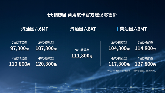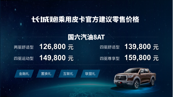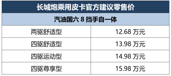 11月3日,长城炮乘用皮卡&商用皮卡在河北正式上市,发布“超级五星”计划,打造全场景皮卡车生活。未来,长城炮将在全球市场全面发力,与福特、丰田等品牌正面竞争,剑指世界前三。 其中,长城炮乘用皮卡官方建议零售价区间为12.68-15.98万元,全系搭载2.0T汽油国六发动机,匹配8挡手自一体变速器;长城炮商用皮卡官方建议零售价区间为9.78-12.88万元,包括汽/柴油发动机、8挡手自一体/6挡手动变速器、两驱/四驱、标准货箱/长货箱、精英型/领航型共17个版本供消费者选择。 “超级五星”计划打造全场景皮卡车生活 长城炮基于长城汽车全新P71平台打造,截止目前在商用、乘用、越野三个细分领域的产品布局体系已初步构建完成,以超级细分的市场定位,掀起了一场皮卡热,凭借大气的外观设计、舒适的内饰,以及多项乘用化、智能化配置,改变国人对皮卡车的传统认知,满足消费者的不同需求。其中,长城炮越野皮卡于今年十一期间的阿拉善英雄会正式亮相,标配三把锁、涉水喉、绞盘、蠕行模式、坦克调头等多项越野配置。 本次河北上市,长城炮以用户为中心,从超级符号、超级工厂、超级产品、超级服务、超级体验五大方面,发布“超级五星”计划,打造全场景皮卡车生活。 第一星“超级符号“:长城炮超级符号有三重含义,POWER力量与实力、PK挑战与创新、PERFECT完美与极致生活,代表着长城炮追求的精神内涵。 第二星“超级工厂”:重庆智慧工厂以“绿色环保、精益求精”的理念打造全球领先的智慧工厂,智能制造、智能物流、数字化运营,成就超级产品。 第三星“超级产品”:秉承乘用化、智能化、网联化、清洁化的“五化新生态”特点,引领中国皮卡进入3.0多用途乘用时代。家庭万能车=轿车+SUV+旅行车+轻型货车。 第四星“超级服务”:全国2000多家销售服务网络、皮卡专营店、异业合作共享空间、长城炮APP、网络商城等,为用户提供线上线下的一体化超级服务。 第五星“超级体验”:长城炮联盟,集结多方力量推动皮卡文化成为新国潮,打造全场景的皮卡车生活超级体验。 即日起,通过长城皮卡经销商渠道购买和订购长城炮的用户,均可享受多重豪礼: 金融礼:2年0息金融支持 置换礼:最高5000元置换补贴 互联礼:基础服务终身免费,娱乐服务3年及尊享服务1年免费(长城炮乘用皮卡专属) 联盟礼:长城炮联盟的一切服务权益(长期增值权益) 实力引领中国皮卡乘用化,让皮卡流行起来 随着长城炮乘用皮卡的正式上市,其12.68万元-15.98万元的诚意价格、时尚的外观设计、舒适的内饰、L2级别自动驾驶以及多项智能、安全配置,赢得了众多消费者的青睐。 外观方面,长城炮乘用皮卡采用梯形大口式进气格栅,三横幅式镀铬装饰条使前脸更具张力,搭配宽大粗壮的前保险杠,整车车头力量感十足。车身长宽高为5410*1934*1886mm,轴距为3230mm。值得一提的是,长城炮乘用皮卡标配全LED前后大灯、前后雾灯和流水转向日行灯,科技感十足。 长城炮乘用皮卡货箱尺寸为1520*1520*538mm,标配阻尼后尾门、隐藏式踏板、坡道梯卡槽,可选装不同形式的货箱盖。 长城炮乘用皮卡搭载2.0T汽油国六发动机,最大功率140kW/4000-5500rpm,峰值扭矩360N·m/1800-3600rpm,传动系统方面,匹配来自采埃孚的8AT自动变速器,拥有标准、经济、运动、4L四种驾驶模式,结合TOD智能四驱、中央差速锁、后桥电子差速锁,以及国内皮卡首创的多连杆后悬架系统,给用户带来极致的驾乘体验。 作为全球化乘用大皮卡,长城炮乘用皮卡拥有诸多乘用化配置,该车标配无钥匙进入+一键启动,多功能真皮方向盘配备换挡拨片,9英寸触摸屏、真皮座椅、前排座椅加热、自动空调、空调后出风口、可开启天窗?专属香氛等乘用化配置一应俱全。 智能化配置方面,该车配备新一代智能网联系统,具有车机手机互联、智能语音控制、远程控制、智能动态信息服务等功能。 主被动安全方面,长城炮乘用皮卡搭载L2级别自动驾驶技术,匹配博世9.3版本ESP、AEB主动刹车系统、ACC自适应巡航、车道保持、半自动泊车、道路交通标识识别等配置,可实现智能辅助驾驶、环境感知、规划决策等功能。此外,该车还搭载360环视、倒车影像、并线辅助、智能前视、12雷达探头等安全配置。 新一代智能商用大皮卡,助力千行百业,开启商业创新全场景 长城炮商用皮卡是专为商务精英打造的新一代智商用大皮卡,是移动的生意之家、事业上的多面专家;既是“赚钱养家”的得力助手,又是“张弛有度”的生活伙伴,它拥有行业领先的超能动力,而且高效、智能、可靠,助力用户生意好、生活更好。 外观方面,长城炮商用皮卡采用黑色蜂窝状进气格栅、星云式科技中网,造型时尚前卫。长城炮商用皮卡可提供长货箱/标准货箱两种不尺寸的车型,长货箱(标准货箱)的轴矩为3470mm(3230mm),车身长宽高为5602(5362)×1883×1884mm。此外,该车拥有同级最深货箱,货箱尺寸为1760(1520)×1520×538mm,具有超强的装载力和无限改装的潜能,与各类商业场景高效适配。 长城炮商用皮卡内饰采用全黑设计,真皮方向盘、皮质座椅以及触手可及的软质材料包覆,9寸触控大屏可实现语音控制、车机手机互联等功能。长城炮在配置方面诚意十足,全系标配最新一代博世9.3版本ESP、无钥匙进入、一键启动、定速巡航、胎压监测、倒车影像等多项先进配置,具有明显的性价比优势,是一款智慧舒适之车。 动
