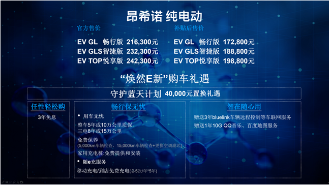 11月4日,北京现代首款纯电SUV——昂希诺纯电动上市发布会在北京举办。定位于“全球品质智酷纯电SUV”,昂希诺纯电动致力为消费者缔造高品质纯电出行生活。昂希诺纯电动此次上市共发布3款车型,官方指导价21.63-24.23万元,补贴后售价17.28-19.88万元。 与此同时, 昂希诺纯电动“焕然E新”购车礼遇:凡购车用户均可以享受3年免息贷款,整车5年或10万公里质保,三电8年或15万公里质保,还可免费获赠家用充电桩及安装服务。
