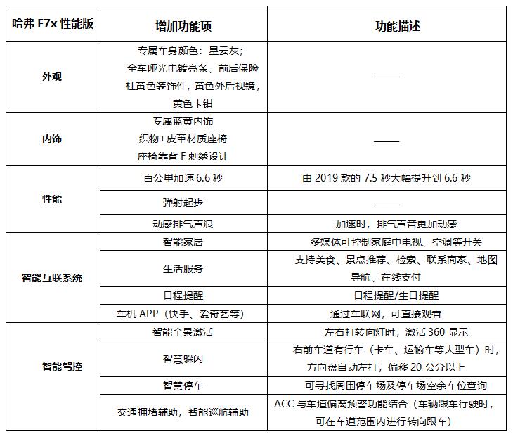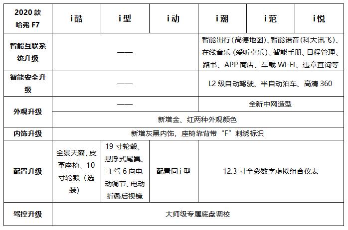 11月6日,“无乐不Friends”哈弗全球社交战略发布会暨全球粉丝盛典在北京长城品牌体验中心举行,发布会现场,哈弗F系三款新车齐亮相。作为哈弗F系的旗舰车型,2020款哈弗F7增配了L2级自动驾驶,并实现了五大升级,售价为11.18-15.18万元,性价比大幅提升;作为哈弗的首款轿跑SUV,哈弗F7x性能版将0-100km/h加速时间从7.5秒大幅提升到6.6秒,可谓是真正的性能猛兽,售价仅15.49万元;作为哈弗F系的首款车型,2020款哈弗F5首次搭载Fun-Life智能网联系统正式亮相,并首次搭载微信车载版。 升级后的哈弗F系三款车型全部具备了OTA在线升级功能,可以根据消费者的实际使用需求和习惯,通过互联网实现远程迭代升级。值得一提的是,近期哈弗GW4C20B 2.0T汽油机荣获了“中国心”2019年度十佳发动机,以中国智造的闪亮名片创领未来!此次发布会,哈弗F系一门三杰,三车齐发,以领潮市场的“极智科技”刷新着人们对智能出行的认知,以卓越的产品硬实力“亮剑”年轻SUV市场。 售价11.18-15.18万 2020款哈弗F7五大升级 此次上市的2020款哈弗F7共推出7款车型,分别搭载1.5GDIT、2.0GDIT两种版本动力总成。1.5GDIT车型包括i秀、i酷、i型、i潮四款车型,2.0GDIT车型包括i动、i范、i悦三款车型。 哈弗F7定位于“AI智能网联SUV”,以太空科技美学外观、强大的智能科技配置引领着新生代SUV的未来发展趋势。2020款哈弗F7实现了“五大升级”,为年轻人带来智能出行新体验。 1大升级:智能网联升级,最懂你 2020款哈弗F7首先在年轻人最为关注的智能网联系统上实现了迭代升级,将智能网联系统升级到V2平台,V2平台在智能语音、智能娱乐、智能出行、日程管理、路书、APP商店、车载Wi-Fi、违章查询等方面实现了30余项升级。在AI智能语音识别系统上,2020款哈弗F7搭载了行业领先的科大讯飞智能语音识别系统,语音识别率高达97%,为同行业最高,可实现车辆多项应用控制,特有的声源定位、听歌识曲等功能,不仅能准确识别语音,还能根据上下语义关联自动识别语意,十分智能。V2平台的应用,将为用户带来更为便捷、智能的操作体验。 在智能娱乐系统上,2020款哈弗F7的“在线音乐”搭载了腾讯的“爱听卓越”车载音乐系统,作为领先的数字音乐内容及内容服务整合商,“爱听卓越”汇集近百家唱片公司的版权资源,千万级曲库,让你尽情听,放肆听。 在智能出行系统上,2020款哈弗F7搭载了高德地图,比拟手机地图导航的智能车机地图,不仅能为你合理规划行程,更能提供3D地图展示的实时路况。为了让用户的用车生活更加精彩,2020款哈弗F7增加了APP商城,设有资讯类、音乐类、生活服务类、视频类等热门APP供用户下载使用,当用户不使用该软件时,又可以及时卸载,十分方便。新增的路书功能,可为车主提供游前出行规划,游中旅途提醒,游后经历分享,且路书的资源均来自资深的旅行达人 、旅游机构或者专门做定制出游的公司,保证安全性。 2大升级:颜值升级,更炫酷 一眼动情始于“颜值”,2019款哈弗F7凭借潮流炫酷的外观,让无数年轻人为之倾心。2020款哈弗F7在外观上再升级,AF金,G7红两种配色。鎏金色彩,恰如年轻生命发出的耀眼光芒;激情红色,专为年轻那颗“躁动”的心而来,两款专属颜色的加入,势必再次引发年轻人追捧热潮。在内饰上,座椅靠背处独特“F”刺绣字标的设计,不仅彰显着2020款哈弗F7专为年轻人而来的满满诚意,更给用户带来独一无二的专属感与尊崇感。2020款哈弗F7将智能电动全景天窗搭配至低配车型,将质价比再次提升。 3大升级:智能安全升级,呵护备至 在智能安全系统上,2020款哈弗F7增配了L2级别自动驾驶,可实现车道居中保持、车道偏离预警、TJA交通拥堵辅助、ICA智能巡航辅助等功能,同时,高清360环视影像、半自动泊车辅助等驾驶辅助功能的增配,不仅有效缓解驾驶疲劳,还进一步提升了行车安全系数。 4大升级:配置升级,便捷稳定 在全系车型配置上,2020款哈弗F7将7寸液晶仪表盘升级到12.3寸全彩数字虚拟组合仪表,炫酷感十足。仪表可显示导航地图、音乐播放、电台、蓝牙电话等多功能信息,不仅极具科技感、豪华感,而且让行车更加便利安全。 5大升级:驾控升级,乐享驾趣 在驾控性能上,2020款哈弗F7 搭载1.5GDIT与2.0GDITT两款发动机,最大功率分别为124kW(169Ps)和145kW(197Ps),峰值扭矩分别为285N·m和345N·m,传动部分与之匹配的是7速双离合变速箱,换挡速度快,传动效率高。在底盘调校方面,2020款哈弗F7作为一款全球车,综合车主调研数据,采用大师级水准的专属底盘调校,并经过俄罗斯-40℃极寒天气,多路况情况下2000多小时耐久性试验,悬架的支撑性与舒适性都更加优秀,在过弯的时候悬架能够更好的支撑车辆,减少车辆侧倾,让乘坐更舒适。 零百加速仅需6.6秒 哈弗F7x性能版售价15.49万 作为哈弗F系的首款轿跑SUV,哈弗F7x定位为“AI极智轿跑SUV”,此次上市的哈弗F7x性能版较2019款哈弗F7x也有五大升级。 1大升级:性能升级,百公里加速6.6秒同级最强 哈弗F7x性能版表现出的强劲动力和加速性能成为最大看点。作为“15万价位区间唯一进入百公里加速6秒俱乐部”的轿跑SUV,哈弗F7x性能版搭载了2.0GDIT +7DCT黄金动力总成,并通过强大的动力总成垂直整合能力,使得所有部件都能得到充分的发挥,实现了整车动力响应提升25%的目标。新增的弹射起步加速阶段可获得更大动力输出,0-100km/h加速时间为6.6秒,成为同级加速性能最强的SUV。