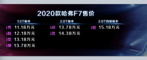 11月6日,2020款哈弗F7在“无乐不Friends”哈弗全球社交战略发布会暨全球粉丝盛典荣耀上市。2020款哈弗F7在2019款基础上实现了五大升级,以极智科技为年轻用户带来全新出行体验。此次上市的2020款哈弗F7共推出7个版本,搭载1.5GDIT/2.0GDIT+7DCT黄金动力组合。1.5GDIT车型包括i秀、i酷、i型、i潮四款车型,2.0GDIT车型包括i动、i范、i悦三款车型,新车的售价区间为11.18万-15.18万元。 哈弗F7是哈弗以全球化思维打造的首款全新旗舰车型,自上市以来广受好评,它集中展现了哈弗F系年轻化、智能化和科技化的品牌形象。哈弗F7定位“AI智能网联SUV”,以太空科技美学设计、强大智能科技配置定义了新生代SUV的潮流趋势,而这一点在2020款哈弗F7身上再次得到强化。 颜值升级 撩动年轻用户心弦 2020款哈弗F7在原有智感美学造型的基础上,新增AF金、G7红两种配色,极具视觉感染力。鎏金色彩,迸发出荣耀尊贵之感;激情红色,随时“撩动”年轻用户的心。在内饰上,整车新增灰黑内饰配色,彰显沉稳精致的品质感,座椅增设“F”字标刺绣,给用户带来独一无二的专属感与尊崇感。 值得一提的是,2020款哈弗F7智能电动全景天窗下延至低配版本,外观造型更加时尚靓丽之外,整车的质价比也再次提升,展现了一款新车“为年轻而来”的满满诚意。 2020款哈弗F7由来自路虎、凯迪拉克的国际大师西蒙斯操刀设计,设计灵感来源于太空和航天科技,引领着当今SUV设计的潮流趋势。恒星矩阵式LED光源,六边形繁星式中网,彗星尾翼日间行车灯,使前脸极具震撼力;驾驶座舱采用环抱式设计,双子星智慧显示系统,云台中控、星云挡把等彰显了无与伦比的科技范。 智联升级 劲享AI智能人车生活 2020款哈弗F7在年轻人最为关注的智能网联系统上给足了诚意,将智能网联系统迭代升级到V2平台。V2平台以安卓8.0为操作系统,在智能语音、智能娱乐、智能出行、日程管理、路书、APP商店、车载Wi-Fi、违章查询等方面实现了30余项升级,将为用户带来更为便捷、智能的操作体验,更贴心也更“懂你”。 在AI智能语音识别系统上,2020款哈弗F7搭载了科大讯飞的智能语音识别系统,语音识别率高达97%,为同行业最高,在实现车辆语音控制和应用控制的同时,还支持非全时免唤醒、声源定位、听歌识曲、语音打断、二次交互、上下文语音理解等功能,智能程度令人惊叹。 在智能娱乐系统上,2020款哈弗F7的“在线音乐”搭载了腾讯的爱听卓越车载音乐系统,作为领先的数字音乐内容及内容服务整合商,“爱听卓乐”汇集近百家唱片公司的版权资源,拥有千万级曲库,可支持多端联通,如实现“同步歌单”、“收藏歌曲”、“用户听歌习惯至车机端”等功能。 在智能出行系统上,2020款哈弗F7搭载了高德地图,具备在线地图、实时交通、天气限行、3D地图、路线规划、周边搜索、组队出行等功能。比拟手机地图导航的智能车机地图,能为你合理规划行程,让你最快到达目的地。新增的路书功能,可为车主提供游前出行规划,游中旅途提醒,游后经历分享,且路书的资源均来自资深的旅行达人 、旅游机构或者专门做定制出游的公司,保证安全性。 2020款哈弗F7还增加了APP商城,设有资讯类、音乐类、生活服务类、视频类等热门APP供用户下载使用,当用户不使用该软件时,又可以及时卸载,实现个性化定制。除了在上述功能上实现了升级外,2020款哈弗F7智能网联系统还增加了违章查询、在线新闻、预订服务、天气、日程等亮点功能,让用户的一路旅程更加智能便捷、丰富多彩。 智能安全升级 驾驶尊享便捷安心 除了拥有完备的常规被动安全配置外,在智能主动安全配置方面,2020款哈弗F7实现了L2级自动驾驶,增配了TJA交通拥堵辅助、ICA智能巡航辅助及LCK车道居中保持辅助等智能安全配置,比肩豪华品牌,进一步提升了驾驶的便捷性和安全性。在城市环路或长途驾驶时,进一步放松手脚,缓解驾驶疲劳,同时获得安全保障。除此之外,高清360全景影像、半自动泊车辅助也是新车升级后的一大亮点。即使你是位新手或者女司机,在倒车、泊车的时候,也将不再发怵。 配置升级 诚意满满物超所值 从哈弗公布的售价我们可以看到,2020款哈弗F7跟2019款在指导价上基本持平,但增加的配置确是物超所值。2020款哈弗F7 i潮及以上配置,增加了智能网联V2平台、L2级自动驾驶、半自动泊车、高清360度全景影像、12.3寸全彩液晶仪表等智能科技配置,诚意满满。2020款哈弗F7的增配举措对于低配车型也给予了全面照顾,比如低配的i酷,就增加了全景天窗和皮质座椅这两项重量级的配置,用户还可选装19寸动感大轮毂。 除了上文重点介绍的智能网联系统和L2级自动驾驶外,新增的炫酷12.3寸全彩数字虚拟组合仪表也很值得一说,它可显示导航地图、音乐播放、电台、蓝牙电话等多功能信息,不仅极具科技感、豪华感,而且减少扭头去看中控大屏的机率,让行车更加便利安全。 另外需要关注的是,在中高配和顶配车型上,2020款哈弗F7搭载的CTA倒车侧向警告、手机无线充电、智能适时四驱系统、双温区自动空调、PM2.5过滤等配置,很多都是其他同级车型罕见的配置。 驾控升级 智驭品质出行 在动力总成上,2020款哈弗F7采用了"中国十佳发动机"+“世界十佳变速器”的双十佳黄金动力组合,所搭载的1.5GDIT与2.0GDIT两款发动机,采用了多项国际领先技术,最大功率分别为124kW和165kW,峰值扭矩