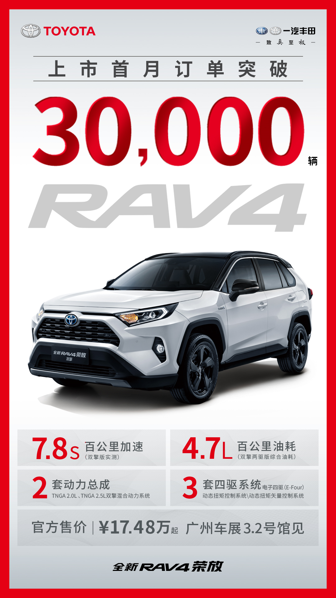 自上市以来,全新RAV4荣放备受消费者追捧,风头无两!上市首月订单突破3万台,充分展现爆款实力!2019年的秋末,以“颠覆者”为主题,全新RAV4荣放上市发布会,用一场沉浸式感官盛筵,彰显了其硬核实力与独有魅力,点燃了大批国内消费者的购车热情。如今,优异的成绩印证了这款越级而生的中级SUV极具压倒性的硬核实力! 全新RAV4荣放购车群体更加年轻化,大批的年轻用户将这款新车列为购车首选。谈及前四代RAV4,选择它的人大多都是年近40岁的中年男性用户,他们更注重实用、更顾及家人的感受。而今,全新RAV4荣放颠覆了这一现状,其更具辨识度的造型,迸发出了更年轻的姿态,全面革新的实力,激发了用户的热血与激情。 爆款驾临!全新RAV4荣放实力为王 凭借颠覆新生的价值感与体验感,全新RAV4荣放为消费者带去了前所未有的出行体验。满足了人们对于造型潮酷的先锋感、强悍四驱无惧复杂地形的成就感、B级车品质的优越感以及可靠、高效混动系统带来的安心感。不仅如此,新车极具棱角的硬派SUV设计已经不再是男性用户的专属,而是开始成为更多女性用户的钟情之选。可见,全新RAV4荣放独具一格的设计,更能表达主流消费者的审美与个性诉求。 越级的平台,让全新RAV4荣放得以脱胎换骨,造型设计极富冲击力与突破感,一副“硬汉”形象跃然而出。大量直线的应用,棱角分明的车身设计,展现强悍、霸气的同时,让整车充满了精准、犀利的工业风。这与上一代居家风格气息浓郁的RAV4荣放形成了鲜明的反差,这也改变了人们长期以来对于城市SUV存在的认知偏差。城市SUV并非只需要“城市风格”,是时候打破“传统”了。全新RAV4荣放在设计方面将自己从流线、轿车化的造型跳脱出来,转变成为硬朗、霸气的形象。颠覆自我的全新RAV4荣放不仅重新定义了城市SUV,更成为引领城市SUV从“舒适区”走向狂野户外模式的风向标。 除了更具辨识度的造型,全新RAV4荣放的强悍性能也是俘获众人心的制胜因素。新车共有两种动力、三种四驱,尽管用户经常说对于城市SUV而言,两驱已经足够,但适用环境更广的四驱版本,还是令喜爱SUV的用户钟情。与当前部分城市SUV提供的单一四驱模式不同,全新RAV4荣放为用户提供了动态扭矩控制系统、全球首创的动态扭矩矢量控制系统、New E-Four电子四驱系统两项全新系统,三种四驱系统各具特色,可实现用车场景全方位覆盖,满足不同地区用户的需求。 另一方面,用户对于全新RAV荣放全系标配TSS 2.0智行安全系统、7安全气囊纷纷点赞。TSS 2.0智行安全系统集PCS预碰撞安全系统、DRCC动态雷达巡航控制系统、LTA车道循迹辅助系统、AHB自动调节远光灯系统于一体,有效降低事故发生机率同时,全车有前排双气囊、前排侧气囊、两侧头部气帘和主驾膝部气囊,无论是驾驶员还是乘客,都能得到周全的保护。如今在售的同级车型,只在中、高配车型上才搭载主动安全科技与6气囊,全新RAV4荣放在这方面远超对手,配置可谓极富诚意。 全新RAV4荣放赋能,一汽丰田高歌猛进 从首月销量来看,全新RAV4荣放没有辜负大家的期待,外观造型的变化很有吸引力,三种四驱系统也能更好地满足用户的需求,丰富的安全配置进一步提升竞争力。加以更实惠的价格,不论是“城市时尚控”,还是“越野性能咖”,都能找到最适合自己的那一款全新RAV4荣放。未来,全新RAV4荣放将以更优异的成绩,为更多消费者,带去美好的出行生活。 今年,一汽丰田的表现依旧喜人。截至2019年10月底,合计批售597,842台,已顺利完成销量目标的82%。今年上市的亚洲龙AVALON整体销量已达到45,741台,第十二代卡罗拉10月销量高达38868台,创出年内月度销量新高。SUV阵营销量同样喜人,普拉多3.5L在国内市场截至10月总销量30,346辆,延续“越野神车”辉煌。奕泽IZOA累计销售46,437台,同比增长276%。此次,全新RAV4荣放的上市,不仅是对一汽丰田在SUV细分市场的补强,更昭示着其全新的使命与领军重任,带领品牌续写荣耀。 说起一汽丰田的品质,自进入中国市场以来,收获了大批消费者的认可。其中,RAV4三年保值率超过66%,在国内SUV中排行中位列前三。可靠的品质,正是得益于丰田QDR造车理念。QDR即:品质(Quality)、耐用性(Durability)、可靠性(Reliability),是丰田汽车一贯秉承的造车理念。长期坚持QDR的严格标准,正是丰田汽车一直屹立于全球汽车界领先位置的重要因素。而在中国市场,一汽丰田也一直在坚持贯彻这一标准。从研发到采购再到生产层面,一汽丰田都严格把关,保证产品从开发之初到生产、制造以及品控方面都做到精益求精。 为保证车辆质量,在采购环节一汽丰田会对每一个零部件进行严格测试,确保零部件品质100%符合丰田全球品质保准。在新车推向市场前,每一辆一汽丰田的汽车也都要经过涉水测试、低温测试、高温测试、电波障碍测试、台架测试、恶劣路况耐久性测试等多重的测试和考验。不仅如此,一汽丰田推陈出新,将丰田QDR的高制造标准延伸至销售及服务环节,不断为用户带来更好的体验。 在2018年,一汽丰田成立15年之际,一汽丰田发布了“致真 至极”的全新品牌口号。其中,“真”代表着一汽丰田真诚、真实、真心听取消费者需求的价值观,“极”则代表了一汽丰田要提供极致产品、极致品质甚至是极致用户体验的方法论,这一理念,不仅使一汽丰田的服务受到用户的广泛认可,也得到了业内的关注