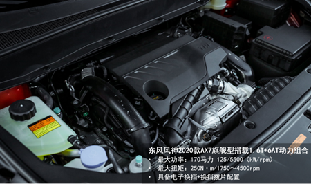 东风风神2020款AX7搭载采用宝马核心TVDI专利技术的第二代EP6 1.6THP发动机,作为该发动机的升级版,它在涡轮效率、燃料利用率、发动机响应速度和雾化颗粒控制方面,均有不俗表现;动力系数更有所提升,最大功率为125kW,最大扭矩250N.m,满足国六b排放法规之余,更带来7.0L/100km的超低油耗表现,节省开支更顾家。 另外,2020款AX7更采用爱信第三代6速手自一体变速箱,该变速箱已在宝马X1、标致4008等众多车型上得到应用,产品技术成熟,品质有保障。在中、高配车型上更越级搭载高大上的电子换挡系统,通过D档换挡拨片,可以享受超车的快感,同时具备操作失误提示和一键回P功能,真可谓是超值的配置。