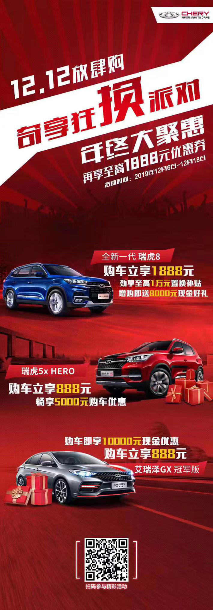 2019年,奇瑞迎来了“丰收”的时刻。1-11月,奇瑞集团累计销售汽车65.18万辆,其中自主品牌车型同比增长6.8%。11月份,奇瑞集团共销售汽车74701辆,环比增长6.2%。其中,全新一代瑞虎8销量13549辆,环比增长3%,同比增长78.6%,连续四个月销量过万。艾瑞泽系列销量12057辆,环比增长7.67%,同比增长8.87%,连续三个月销量过万。 为了回馈广大用户多年来的支持与厚爱,奇瑞特地在一年一度的“双十二购物节”来临之际,为消费者推出了“12.12放肆购”年终大聚惠活动。 购全新一代瑞虎8,再享1888元优惠券;购艾瑞泽GX Pro、艾瑞泽GX冠军版、艾瑞泽5 Pro(超值版除外)、瑞虎5x HERO(都市版除外)再享888元优惠券。详情请登录奇瑞汽车天猫旗舰店。其中,全新一代瑞虎8最高可享1万元置换补贴,艾瑞泽GX冠军版可享受10000元现金优惠。 具体优惠如下: 【全新一代瑞虎8】 ?购车立享1888元,另有至高1万元置换购车补贴,增购即送8000元现金好礼。 【瑞虎5x HERO】 购车立享888元,另享5000购车优惠。 【艾瑞泽GX冠军版】 购车立享888元,另享10000元现金优惠。 洞察到消费者的需求,奇瑞汽车针对旗下瑞虎和艾瑞泽两大系列产品,进行了全方位的升级。经过升级后的车型,在动力性能、智能配置、外观设计、内饰细节、空间表现等方面更加契合当下消费者的喜好和诉求。 全新一代瑞虎8在保留前代“大空间”、“舒适性”等优势的基础上,不仅升级了动力总成,搭载有奇瑞自主研发的“中国心”ACTECO 1.6TGDI涡轮增压发动机,而且在智驾安全辅助系统上也进行了大幅升级,整体更为丰富,并拥有多达14项超越同级竞品的功能。此外,智能化方面,全新一代瑞虎8还在原有三项智能核心技术的基础上进行进化,融入“AI智云管家”黑科技,带来更加出色的用车体验。 瑞虎5x HERO继续沿用瑞虎5x经典设计,其造型设计承袭“Life in Motion”家族式设计理念,运动流线造型配以极富潮流质感的内饰设计,极大满足主流年轻的审美口味。同时,新增的潮流双色车身设计,更让整体呈现出运动化个性元素,配合率先满足国VI排放标准的全新发动机,瑞虎5x HERO致力于让年轻人活出自我,创造自我潮流,打造年轻专属SUV。 艾瑞泽GX冠军版作为一款高颜值智慧舒适座驾,在原有车型的基础之上,针对外观、内饰、智能舒适、底盘操控等方面进行了全方位升级。外观方面,艾瑞泽GX冠军版新增莱茵蓝车色及红灰双色车身,以及黑红内饰等个性化选装,更时尚、动感,也更符合年轻化潮流。 多年以来,奇瑞汽车始终坚持为消费者提供优质的产品和服务,受到了全球近800万消费者的支持与信赖。此次,奇瑞汽车推出“双十二”优惠购车政策,切实降低汽车消费的门槛,将进一步助力消费者拥抱高品质的用车生活。 |