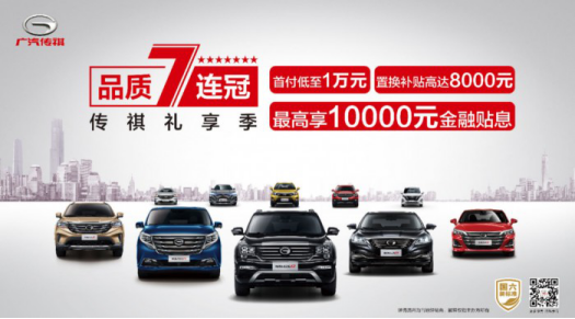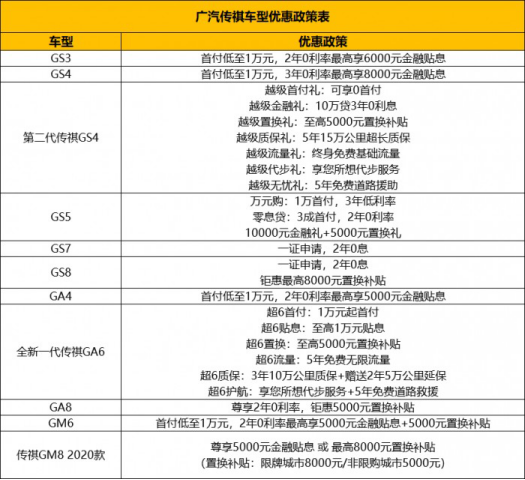 2019即将结束,辛苦了一年,不考虑买辆车犒劳一下自己吗?不如借此机会,选购一辆品质好车,既能享受到自己忙碌一年的丰硕成果,还能带家人出游旅行,让家人一同享受,一举两得。这个冬天,广汽传祺推出“年终派福利,亿元真实利”购车大礼包,首付低至0元,置换补贴高达8000元,最高享12000元金融贴息,让你购车无忧, 尽享实惠! 年终派福利,亿元真实利 开好车,享豪礼。广汽传祺携旗下SUV、MPV及轿车全系重磅车型为广大消费者奉上亿元购车福利,即刻走进广汽传祺全国经销店,开启属于你的购车大礼包吧! “百万信赖,耀世焕新”,第二代传祺GS4王者归来。11月15日,全球首款搭载“车载微信”的SUV——第二代传祺GS4正式上市。 第二代传祺GS4是基于全新广汽跨平台模块化架构GPMA打造的首款SUV,作为布局紧凑型SUV市场的全新力作,广汽传祺汇聚其全球汽车优势资源进行开发,从设计、动力到互联技术等方面,都进行了焕新升级,满足用户对高档SUV品质和品位的追求。 越级7重礼,尊享为您。只需在2020年1月31日前订购第二代传祺GS4,即可尊享越级7重礼:享受0首付,10万贷3年0利息,至高5000元置换补贴;更有5年15万公里超长质保,终身免费基础流量,享您所想代步服务以及5年免费道路救援。 全场景奢享大型MPV——传祺GM8今年开展“升舱计划”,于11月重磅推出传祺GM8 2020领航款,给消费者带来超越头等舱享受的极致待遇。 传祺GM8 2020领航款是在传祺GM8 2020款的基础上进行的“头等舱再升级”,第二排尊崇头等舱座椅,不仅配有电动腿托、通风加热、按摩功能,更进一步优化座椅发泡工艺,采用更柔软、更细腻的真皮和PVC面料,致最爱的人以“超越头等舱”的极致享受。 传祺GM8凭借其出众的全能实力倍受消费者追捧,据2019年MPV市场销量最新数据显示,传祺GM8以16447辆的销量荣获中国品牌20万级高端MPV第一。现在购买传祺GM8 2020领航款或传祺GM8 2020款的客户,可享受:尊享5000元金融贴息或最高8000元置换补贴。 开一辆颜值、科技、智能全在线的车回家过年,不论是与家人一同出游,还是去亲朋好友家拜年,都再合适不过了。极智魅力中高级轿车——全新一代传祺GA6就是这么一辆颜智俱佳的好车,其凭借高颜值、高智能和高品质驾控获得了广大消费者的一致好评。 全新一代传祺GA6运用了凌云翼3.0设计语言,搭载270T高性能发动机,配合爱信6AT变速器,动力强劲。此外,全新一代传祺GA6还配备双12.3英寸超大连体屏、腾讯车联智慧系统、全覆盖L2级自动驾驶、超广角生态座舱和人体工程学舒适座椅等多种配置,带给消费者前所未有的智能驾驭体验。 凡是在12月31日前购买全新一代传祺GA6的客户即可享6大尊享政策:不仅有低至万元首付,三年0息,最高1万元贴息和5000元置换补贴可享,还能享受3年10万公里质保+2年5万公里延保,享您所想代步服务+5年免费道路救援。 旗舰级硬核豪华SUV——2020款传祺GS8破尘归来。2020款传祺GS8搭载了390T发动机,采用GCCS燃烧控制专利技术、缸内直喷GDI技术、50bar高压直喷系统、单涡管双流道和电控废气旁通阀增压器等与全球同步的技术配置,做到了动力更强劲,油耗更低,且符合国六标准,节能又环保。 现在购买2020款传祺GS8即可享受:一证申请,2年0息,钜惠最高8000元置换补贴。 新世代驾享先锋SUV——传祺GS5,天赋全掌控。传祺GS5搭载广汽传祺第三代1.5T缸内直喷涡轮增压发动机,配备Ti-Power 3.0,完美实现燃油经济性与强劲动力的平衡,同时搭载祺云概念智联系统以及多项主动安全配置,给消费者带来从未体验过的科技享受。 现在购买即可尊享:首付低至1万元,3年低利率,零息贷:3成首付,2年0利率,最高可享10000元金融礼和5000元置换礼。 过年了,免不了要买上大大小小一堆年货,担心买的太多,车内间不够?不用担心,传祺GM6帮你忙!全能宽享MPV——传祺GM6凭借“锐动大气外观、越级宽享空间、祺云AI智慧互联、舒适安全畅行”四项核心产品力,为消费者带来乐趣非凡的出行体验。 现在购买传祺GM6的用户,即可享受:首付低至1万元,2年0利率,最高享5000元金融贴息和5000元置换补贴的优惠。 除了以上几款重磅车型外,广汽传祺的其他车型同样也有超级钜惠等你来享。不管选购哪一款,都有巨额优惠等着你! 匠心造匠品,品质铸品牌 目前中国汽车市场逐渐饱和,“微增长”已经成为了常态,市场竞争进入了存量市场的竞争阶段。消费者对品质服务的要求愈发严格,“品质实力”成为了品牌间竞争的关键。 为进一步提升产品品质,广汽传祺整合众多全球顶尖供应商,搭建全球顶级供应链战略联盟,在零部件配套、产品开发、技术共享等多方面深化合作。秉持“工业4.0”理念全面升级的广汽生产方式(GPS 3.0),以动心的设计品质、放心的零件品质、安心的制造品质、暖心的服务品质打造“四心”品质支柱,从源头开始,确保产品品质的出众。 基于优越的品质,广汽传祺——一个仅成立十一年的中国品牌,赢得了广大消费者的信赖和市场的认可。以高品质造就辉煌,广汽传祺连续7年蝉联J.D. Power中国新车质量研究(IQS)报告中国品牌第一,而未来,广汽传祺将继续坚持以客户价值为中心,深耕品质领域,以更加出众的品质推动品牌升级,广汽传祺致力为消费者打造更加精彩的移动新生活。 品越级服务,享尊贵人生 服务方面,广汽传祺秉持“客户第一”的理念,以智能化、人性化、便捷化为核心,围绕车主从选