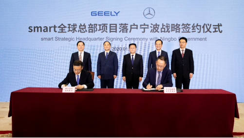 【2020年1月8日,中国杭州、德国斯图加特】今天,浙江吉利控股集团(以下简称“吉利控股”)和梅赛德斯-奔驰股份公司(以下简称“梅赛德斯-奔驰”)宣布:经相关监管部门批准,双方组建的smart品牌全球合资公司“智马达汽车有限公司”(smart Automobile Co., Ltd.)正式成立, 在全球范围内联合运营和推动smart品牌转型升级。 smart合资公司全球总部落户宁波战略签约 宁波杭州湾新区管委会副主任蔡世杰(右一)与吉利控股集团常务副总裁、CFO李东辉(左一)分别代表双方签约,浙江省委副书记、宁波市委书记郑栅洁(后中),宁波市委常委、常务副市长陈仲朝(左一),宁波杭州湾新区管委会主任、党工委副书记杨勇(右一);吉利控股集团董事长李书福(左二),吉利控股集团总裁,吉利汽车集团CEO、总裁安聪慧(右二)见证签约。 合资公司注册资金54亿元人民币,双方将各出资27亿元人民币,梅赛德斯-奔驰股份公司主要以smart品牌出资的形式获取相应股份。双方将在研发、制造和供应链等领域发挥协同效应,致力于将smart打造成为全球领先的高端电动智能汽车品牌。合资公司全球总部设在中国宁波杭州湾新区,在中国及德国分别设立营销中心。 全新一代纯电动smart将由梅赛德斯-奔驰的全球设计部门负责设计,吉利控股全球研发中心负责工程研发。新车型将在中国的全新工厂生产,预计2022年开始投放市场并销往全球。根据新车型开发规划,smart未来产品阵容将扩展到快速增长的紧凑型细分市场,与smart品牌定位非常吻合。 合资公司董事会将由6名成员组成,双方各委派3名。吉利控股方代表为吉利控股集团董事长李书福先生,吉利控股集团总裁、吉利汽车集团CEO、总裁安聪慧先生,吉利控股集团常务副总裁、CFO李东辉先生;戴姆勒方代表为戴姆勒股份公司董事会成员、负责大中华区业务的唐仕凯先生(Hubertus Troska),戴姆勒股份公司董事会成员、梅赛德斯-奔驰股份公司董事会成员、负责销售与市场营销的贝思格女士(Britta Seeger),戴姆勒股份公司董事会成员、梅赛德斯-奔驰股份公司董事会成员、负责集团研发和梅赛德斯-奔驰乘用车研发的马库斯·谢弗先生(Markus Sch?fer)。 合资公司决定任命佟湘北先生为smart合资公司全球CEO,他将统筹市场、销售、研发等smart品牌所有业务模块,向smart合资公司董事会汇报。他在汽车行业有超过20年的从业经验,曾在中国和美国等地多个世界领先的汽车公司任职。 戴姆勒股份公司董事会主席兼梅赛德斯-奔驰股份公司董事会主席康林松(Ola K?llenius)表示:“经相关监管部门批准,我们与合作伙伴吉利控股共同筹备数月的合资公司现已蓄势待发。合资公司将在中国及全球市场推出下一代零排放smart电动车型。我们期待双方继续紧密合作,将优秀的产品与服务带给全球客户。” 浙江吉利控股集团董事长李书福表示:“smart具有独特品牌魅力、核心价值和全球影响力,是全球城市出行与时尚交通的领导者。吉利控股将把研发、制造、供应链等领域的优势及对中国市场的深刻理解注入合资公司,促进双方在平等互利的基础上发挥协同效应,推动smart品牌向电动化、智能化方向转型,实现smart汽车在全球市场的商业成功。” 媒体垂询: 吉利控股集团: 宋兆桓 +86 136 5431 3232,zhaohuan.song@geely.com <mailto:zhaohuan.song@geely.com> 戴姆勒大中华区投资有限公司: Martin Sauber,+86 10 8417 8573,martin.sauber@daimler.com <mailto:martin.sauber@daimler.com> 曾华,+86 10 8417 3106,hua.zeng@daimler.com <mailto:hua.zeng@daimler.com> 如需了解吉利控股或戴姆勒的更多信息,请访问: www.zgh.com 或www.media.daimler.com 关于吉利控股集团 浙江吉利控股集团始建于1986年,1997年进入汽车行业,一直专注实业,专注技术创新和人才培养,不断打基础练内功,坚定不移地推动企业健康可持续发展。现资产总值超过3300亿元, 员工总数超过12万人,连续八年进入世界500强。2019年,吉利控股集团在《财富》世界500强中排名220位,较2018年提升47位。 吉利控股集团现已发展成为一家集汽车整车、动力总成和关键零部件设计、研发、生产、销售和服务于一体,并涵盖出行服务、数字科技、金融服务、教育等业务的全球创新型科技企业集团。集团总部设在杭州,旗下拥有吉利、领克、几何、沃尔沃、极星、宝腾、路特斯、伦敦电动汽车、远程新能源商用车、太力飞行汽车、曹操出行、钱江摩托、盛宝银行、铭泰等品牌,在新能源科技、共享出行、车联网、无人驾驶、车载芯片、低轨卫星、激光通讯等前沿技术领域不断提升能力,积极布局未来智慧立体出行生态。吉利控股集团是沃尔沃集团第一大持股股东和戴姆勒股份公司第一大股东。 吉利控股集团在中国上海、杭州、宁波,瑞典哥德堡、英国考文垂、西班牙巴塞罗那、美国加州、德国法兰克福、马来西亚吉隆坡等地建有造型设计和工程研发中心,研发、设计人员超过2万人,拥有大量发明创新专利。在中国、美国、英国、瑞典、比利时、白罗斯、马来西亚建有世界一流的现代化整车和动力总成制造工厂,拥有各类销售网点超过4000家,产品销售及服务网络遍布世界各地。 关于梅赛德斯-奔驰股份公司 梅赛德斯-奔驰股份公司负责梅赛德斯-奔驰乘用车和梅赛德斯-奔驰轻型商务车的全球业务,在全球拥有175,000名员工。 康林松(Ola K?llenius)任梅赛德斯-奔驰股份公司董事会主席。该公司专注于乘用车、轻型商务车
