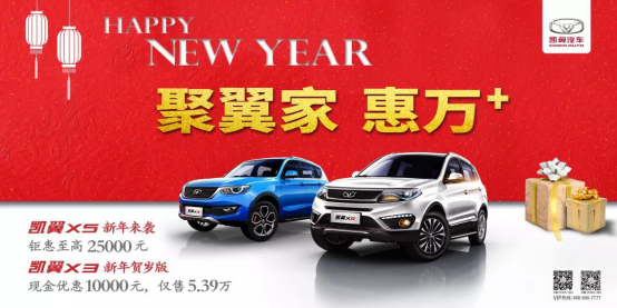 春节将至,载着家人节日团圆、走亲访友、游玩,一辆得体的车必不可少。值此促销旺季,凯翼汽车携“聚翼家,惠万+”春节钜惠火热来袭,让这个春节更添精彩。 春节钜惠,最后一波走起 凯翼汽车春节钜惠来袭!即日起,购凯翼X3新年贺岁版享现金优惠10000元,仅售5.39万元;购凯翼X5,享至高25000元综合优惠,更有4重好礼相赠,活动期间再享多重大礼: 金融礼:购凯翼全系车型提供24/36期0利息或36期超低利息,也可享受60期超长贷、无忧贷等购车贷款方案,让消费者节前购车更低息,购车更实在; 置换礼:凡到店购凯翼X3/X5的用户,即可享受X3至高3000元和X5至高4000元的置换补贴大礼包,置换无忧,震撼出击; 保养礼:活动期间购车享受终身免费保养,告别高昂的用车成本,真正全方位排除后顾之忧; 质保礼:凯翼汽车推出发动机10年/100万公里超长质保,节前购车,安心简单,放心开。 凯翼汽车,春节出行绝佳之选 春节购车狂欢季,凯翼汽车除带来超级钜惠外,更带来实实在在的卓越产品,让凯翼X3新年贺岁版和X5为您的春节增光添彩,为您和家人的春节出行保驾护航。凯翼汽车拥有时尚大气的外观、人性化的智能配置和卓越品质,实乃消费者春节出行的绝佳之选。 凯翼X3新年贺岁版采用显眼夺目的家族DNA鹰翼式前脸,犀利大气,新春出行第一眼就让你和家人倍有面子;采用7英寸TFT液晶面板仪表盘,配备10.1英寸Car pad多点高清电容屏,涵盖倒车影像、导航应用、胎压监测等诸多功能,方便您的用车;更标配博世9.0车身稳定系统,随时随地车辆保持最佳稳定性。新春出行,您和家人将拥有舒适、安全、幸福的绝佳驾乘体验。 凯翼X5也是市场中不容忽视的重量级产品。其搭载了满足国六b排放标准1.5TCI发动机,动力出色的同时也保证了环保性。同级唯一9.7英寸智能触控真彩大屏,搭载车联网功能,富有科技感和大气感,更实现简单便捷的操作;ESP电子稳定系统、TPMS胎压监测系统和ADB自适应大灯等安全配置的加入,更是如虎添翼。这个春节,坐进凯翼X5,尽情享受凯翼X5带来的全家温馨吧! 以客户为导向是凯翼汽车不变的信念。凯翼汽车坚持为消费者带来感动人心、实实在在的好产品和高性价比体验。春节将至,节前最后一波优惠,机不可失时不再来!活动正在火热进行中,详情请咨询当地经销商。 |