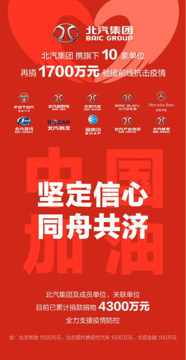 新型冠状病毒疫情时刻牵动着全国人民的心,也牵动着北汽集团13万职工的心。 疫情爆发以来,北汽集团第一时间行动起来,全力支援疫情防控前线。除紧急加班生产负压救护车外,亦积极为抗击疫情捐款。继北汽集团旗下北京奔驰捐赠1000万元、北京现代携手现代汽车捐赠1500万元、北现金融捐赠100万元之后,北汽集团再次联合旗下10家单位,共同捐款1700万元。 累计捐款4300万元 据悉,此次捐款单位包括北汽集团总部,以及北汽集团旗下10家汽车相关单位:北京汽车、北京越野、北汽新能源、北汽福田、北汽昌河、福建奔驰、海纳川、北汽鹏龙、北汽产投、北汽财务。 经多方联络,北汽集团捐款将用于购置疫区紧急救护物资,以满足救治患者的需要。这些物资将捐赠给中华慈善总会,并通过中华慈善总会,分发到目前疫情最严重的湖北、浙江、广东、河南、湖南五省及北京市。 至此,北汽集团及其成员单位、关联单位已通过不同渠道累计捐款捐物4300万元。 持续组织防疫专用车辆生产 除踊跃捐款捐物之外,北汽集团全力组织抗击疫情所需的救护车、特种运输车的生产,克服困难,保供生产、驰援前方。福建奔驰、北汽福田积极响应工信部下达的负压救护车生产任务,自大年初一起就复工以保障负压救护车生产,目前已有大批负压救护车征战前线。大量北汽福田雷萨泵车、搅拌车及起重机设备在武汉火神山工地星夜鏖战,24小时昼夜施工。据北汽车联网数据统计,目前有超过2600辆北汽福田物流运输车、工程作业车在参与武汉市的各类防疫救护工作。 负压救护车是目前疫区最急需的防疫救护设施,内部配备全套抢救设备,更配备了负压隔离担架,以及空气负压流通系统,能将车内空气无害化处理后排出,有效减少救助病人时产生的新传染,具有良好的隔离、通风、防腐、耐菌作用,能真正做到“安全隔离”,保障防疫救助细节。 北汽EV5防疫物资全封闭运输车,货舱全封闭隔离,运输途中能有效防火、防水、防盗、防污染,稍加改装可作疫苗等防疫专用物资的运输。车内还配备了紫外线消毒设施,能对空车或载运的防疫物资外包装进行消毒。 为逆行者提供出行服务 除捐款捐物之外,北汽集团还考虑到目前各重点疫区交通不便,大部分医务人员、防疫工作人员、疫区报道媒体、防疫物资运送无车可用的情况,组织所属出行企业提供相关服务。 北汽轻享出行响应号召,将在全国20个城市,为一线医护和救援人员以及参与疫情报道的媒体工作者提供1个月以上的无偿用车服务(免费用车服务热线:400-100-1666)。 北汽华夏出行响应号召,将在北京、长沙、郑州等10座城市,免费提供2000余台轻卡及中面、小面等物流车辆,无偿为政府、公益组织、行业协会及防疫配送的企业提供“摩范速运”支持,确保防疫物资配送和民生物资保障(免费用车服务热线:400-010-6116)。 由北汽股份和北汽新能源共同建设的BEIJING?品牌,则协同北京市交通委出租处、北京市交通委东城运输管理分局、北京市出租协会等部门,为北京市出租车司机配发了防疫物资。 同时,在网约车领域,BEIJING?品牌联动滴滴、首汽等企业和平台筑起第二道防疫防线。在驾培市场,BEIJING?品牌与东方时尚联合开发无人驾培模式,助推疫情防控工作开展。助力出行新生态,BEIJING?品牌与逆行英雄共筑三道钢铁长城。 关键时刻,更需彰显责任与担当!北汽集团作为中国汽车行业的骨干企业和北京市属最大的国有企业,始终坚守初心、牢记使命,积极履行社会责任,为实现人民对美好生活的向往不懈奋斗。北汽集团将切实把党中央、北京市各项决策部署落到实处,与全国人民群众一起,坚决打赢疫情防控阻击战。 |