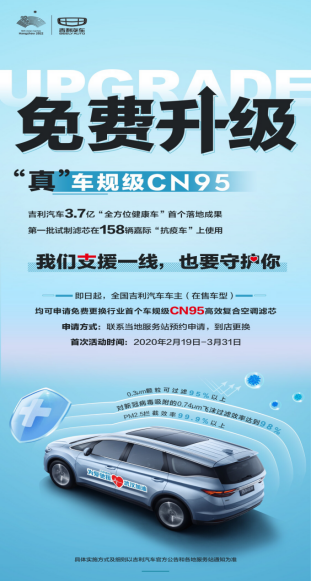 好消息!吉利汽车将为全国吉利车主免费更换“CN95空滤” 【快讯】 战“疫”关键期,人人是防线,吉利关爱再升“吉”。日前,吉利汽车宣布国内首个车规级CN95高效复合空调滤芯(以下简称“车规级CN95空滤”),不仅已试制成功,已进入批量排产中。与此同时,为回馈广大新老客户,吉利汽车今日正式推出车免费更换CN95高效复合空调滤芯”的专项服务行动。从即日起到3月31日,全国吉利汽车车主(在售车型)均可联系当地服务站预约申请,免费更换“车规级CN95空滤”,享受N95口罩级的出行安全防护。 吉利汽车不仅是首家量产“车规级CN95空滤”的汽车品牌,要此次吉利汽车首开业界先河,成为国内首家为全国车主免费更换可有效阻隔病毒的“CN95空滤”的车企。“真金白银,不计成本”,普惠数百万已购车用户,也再次彰显了吉利汽车作为中国汽车领军品牌,始终把用户的健康、安全放在首位,以实际行动践行对客户的真切关怀,对社会的责任担当为全国上下同心合力战胜疫情的贡献绵薄之力。 此次吉利汽车为车主免费升级的车规级“CN95高效复合空调滤芯”,用活性炭、高效无纺布、多层复合介质等孔径更小的新型滤芯材料,不仅可以防霉除异味,除烟雾、粉尘、花粉等易致敏物质,还能实现对直径0.3?m的颗粒过滤效率达到95%以上,对新冠病毒吸附的通常大于0.74?m飞沫的过滤效率能达到98%,并且能够有效过滤掉空气中的PM2.5颗粒,拦截效率达99.9%以上,为吉利车主疫情期间出行提供N95型口罩级的多重健康防护。 据了解,“车规级CN95空滤”除了会相续在吉利、几何和领克等车型进行前装生产外,首批量产的“车规级CN95空滤”已陆续发往吉利全国各地服务站,供用户预约免费更换,并将率先装配在158辆嘉际“抗疫车”上使用,给疫情防控一线的工作人员提供健康、安全的移动空间;同时,吉利汽车正加快量产速度,供全国各地的吉利车主都能相继实现免费更换,做到健康到岗、安全回家。 暖心同行,共克时艰。除了为已购车主免费更换“车规级CN95空滤”,早在2月初吉利汽车就针对疫情给用户用车养车造成的影响,推出了“4大关爱,12项举措”售后服务暖心行动,如微信预约维保、技术在线远程服务、上门服务、在线业务办理以及首保延期、质保延期等减少用户受疫情影响的举措,涵盖养护、救援、延保等多个领域,以更贴心、更健康、更安全的温情服务,让车主在非常时期仍能享有高品质权益。 新冠肺炎每日疫情数字公布的背后都是一个个鲜活的生命,是一户户期盼平安的家庭。作为一家有担当的中国汽车品牌,在新冠肺炎疫情爆发初期,吉利控股集团第一时间携手李书福公益基金会设立了2亿元疫情防控专项基金,捐赠了158辆嘉际、成立应急防控保障车队、协同全球资源海外采购医疗物资等举措,多维度驰援疫情严重地区,助力打赢这场没有硝烟的阻击战。 与此同时,吉利汽车还将投入3.7亿元人民币,启动研制具备病毒防范功能的“全方位健康汽车”,而研发投产“车规级CN95空滤”是改项目的头号任务,而此次吉利汽车把研发成果以免费升级的形式普惠百万车主,更是体现了吉利汽车对用户的真切关爱和责任担当。 |