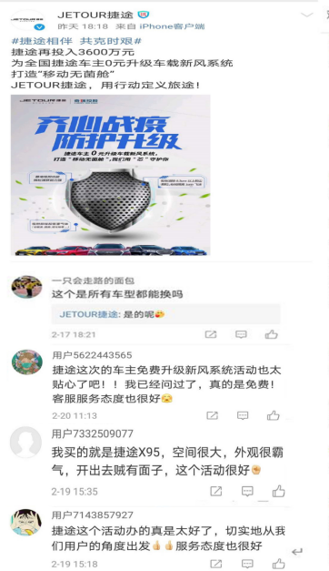 2020年春节,突如其来的新冠疫情彻底打破了节日的喜庆氛围,不仅对广大老百姓的生活出行甚至健康安全造成了影响,对于已经连续两年销量负增长的中国汽车市场而言,这样的冲击更是雪上加霜。然而当大多数企业都思考着如何生存时,奇瑞控股捷途却挺身而出,不仅向疫区提供救援物资,出台帮扶经销商政策,还推出了一系列用户关怀的暖心服务,这让我们深刻地感受到了在特殊时期中国汽车品牌的责任与担当。 1月28日,奇瑞控股集团捐赠了包括现金、专用救护车辆,以及医用防护口罩、防护服、护目镜等价值1000万元的医疗防护物资,用于支援湖北等疫情较重的地区。紧接着,2月初,奇瑞控股捷途又连续推出老客户五大关怀服务、意向客户五大服务、经销商五大政策支持、网上购车月活动、军警医护人员购车9折优惠等暖心政策,解决了用户看车、购车、用车等诸多需求;为经销商提供金融支持、考核减免、店面补贴等一系列支持政策,给了处在困境中的经销商一剂强心剂,在奇瑞控股捷途看来,携手经销商共克时艰是企业应当承担的社会责任与使命。帮助经销商亦是为了给广大用户提供更加高效、便捷、专业、贴心的用车服务,在私家车成为疫情期间的必备物资,而汽车又严重依赖终端售后服务的环境下,保障终端经销商的稳定运营,能够为广大用户在疫情之下的安全出行提供最大的保障。 0元升级车载新风系统,全面保障用户出行 随着国务院及各地政府发布保障安全、陆续复工的指导意见,越来越多的人踏上返工、上班的大潮。同时,在国家提倡尽量避免聚集出行的情况下,自驾出行就成为了目前最为稳妥的选择。但无论是自驾还是戴口罩,依然无法阻隔病毒的入侵,而这时候如果车上带有能够净化空气、杀毒灭菌的车载新风系统,无疑是给驾乘人员加上了一层全面高效的保护层。 为了进一步保障疫情期间车主出行的安全与健康,日前,奇瑞控股捷途又宣布,将投入3600万元为全国所有捷途车主免费升级车载新风系统。这一举措给了即将自驾返工而又担心疫情的广大车主的出行带来了健康安全的全面保障。 据悉,奇瑞控股捷途推出的这套全新车载新风系统不仅拥有超强的颗粒捕获能力,有效消除0.3μm以上粉尘颗粒及隔离1μm飞沫,可以吸附氨类、醛类、硫化物等异味及有害气体。全方位的防御拦截可谓将车辆打造成了一个“移动的氧吧”,能够为用户的出行及健康提供更加全面的保障。 那么捷途推出的这一波又一波的用户服务政策到底有没有兑现呢?让我们一起看看捷途的车主专属服务微信群。从捷途车主专属服务微信群小编得知,自2月20日起至4月30日期间,奇瑞控股捷途将开展“齐心战疫,防护升级”捷途车主0元升级车载新风系统活动。目前捷途各地经销商已经通过短信、微信等方式主动联系车主,并基于便捷、安全的前提下,根据车主需求制定相应的升级方案。此外,广大车主还可以在奇瑞控股捷途官网、微信、微博等官方平台主动咨询客服,详细了解免费升级车载新风系统的流程及细节。这一重磅消息一经发出,便吸引了广大车主的关注,纷纷主动咨询客服,预约升级车载新风系统的时间。而这种主动出击、多维渠道、深度沟通、全面互动的高效措施无不展现了奇瑞控股捷途与车主时刻紧密联系在一起,时刻“以用户为中心”的理念。而奇瑞控股捷途的这一系列暖心举措也的确打动了广大车主,从各大涉及平台的用户评论可以看出,“捷途太暖心了”、“买捷途果然买对了”、“一定要推荐朋友买捷途”无一不体现了车主对奇瑞控股捷途的诚意行动和“以用户为中心”理念的认可。 小编了解到,目前奇瑞控股捷途全国累计销量达190000+,仅为全国车主0元升级车载新风系统,奇瑞控股捷途就要投入至少3600万元。而自2003年起,奇瑞控股集团就将车内空气质量作为整车研发中的重点开发项目,17年间相关研发资金投入高达5.2亿元,并打造了高标准的整车空气质量管控体系及实验室,用于专项提升车内的空气环境质量,此次为用户免费升级的车载新风系统就是其中一项应用成果。什么是“以用户为中心”?在用户最需要的时候,在自身遭遇车市寒冬及疫情的双重冲击中,奇瑞控股捷途毅然决然地拿出了最硬核的产品,拿出了全国车主免费升级车载新风系统的诚意,患难时刻见真情,这便是奇瑞控股捷途对“以用户为中心”理念的最好诠释。 自2018年成立以来,奇瑞控股捷途便明确了专注“旅行+”市场,“以用户为中心”的经营理念。两年来,不忘初心,始终秉承最理解客户的需求、最贴近客户的营销以及最愉悦客户的体验“三最”营销理念,不断审视用户的迫切需求,不断迭代优化产品、不断升级服务,此次疫情特殊时期奇瑞控股捷途的这些暖心行动,也正是其践行“以用户为中心”,快速响应用户需求、满足用户需求的最佳印证。 |