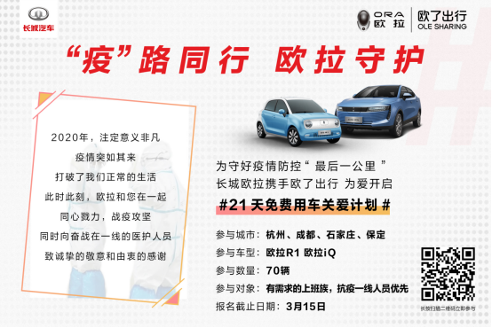 所有的岁月静好,不过是有人在替我们负重前行。 庚子年初,一场突如其来的疫情迅速传播,封锁了一座座城市的笑颜,但无数的“逆行者”,用爱坚守住我们的安心,呵护着我们的健康,成为这个非常时期最可爱的人。他们有着许多平凡的标签,医护人员、交警、协警、街道办事员、消毒卫士、快递小哥......聚光成芒,万家灯里的平凡英雄,架起疫情中的一道城市“护墙”。 这一个月注定全民难忘,也必将成为历史的记忆。经过一线医务工作者的昼夜奋斗、忘我牺牲,在全国人民的共同努力和全世界的支持帮助下,疫情终于得到有效控制,我们的生活终将回归正轨。但此时此刻仍然不能放松警惕,疫情并未根除,依然有着“最后一公里”的防疫保卫战需要坚守:城市公共交通未完全正常运转,健康便捷的出行成了最美逆行者以及复工上班族的烦恼。 长城欧拉联合欧了出行推出“21天免费用车关爱计划”为爱开启 这一次,面对特殊时期出行难的问题,长城欧拉与新能源出行平台欧了出行联合推出“21天免费用车关爱计划”,为各行各业复工的上班族提供免费用车服务。这种更私密更安全的出行解决方案,既能提高出行健康系数,也将大幅度提升通勤效率,为社会经济恢复正常运转做出一份贡献。 “免费用、低价租、优惠购”以人为本、暖心陪伴,为您全面护航,共克时艰 本次“21天免费用车关爱计划”主要面向石家庄、保定、成都、杭州四座城市,共计招募70人,幸运入选后可以在21天内享受免费使用欧拉R1或欧拉iQ车辆的特权。由于活动参与人数有限,欧了出行还为没能参与上活动的用户提供“低价租车”服务。 面对疫情对经济大环境的冲击,长城集团及旗下新能源品牌欧拉早在2月4日就启动了2000万元关爱基金,与经销商、车主用户共克时艰。最值得一提的是,值此特殊时期,长城欧拉还推出购车零首付,极大缓解消费者经济压力。此外还推出了十大关爱保障及五重大礼,包含出行无忧、养修无忧、用车无忧、续保无忧、服务无忧等尊享服务。 此外,全民战“疫”关键时刻,长城欧拉更是与车主一起和衷共济,推出“五心关爱行动”:便捷交车更安心、防疫服务更暖心、维保优惠更贴心、免费取送更省心、全面防护更用心。 致敬最美逆行者 欧拉多重礼遇回馈前线战士 在疫情肆虐期间,为了抗击病毒,保护大家的生命健康,众多医护人员、解放军、警察等不顾健康风险毅然决然奔赴抗“疫”一线,用他们的付出和汗水让春天的脚步越来越近,他们是这个初春最美的逆行者。 英雄需要礼遇。为了感谢英雄的逆行者们在非常时期的付出,长城欧拉特别为他们提供全方位购车支持和最高优惠,以欧拉的方式来温暖英雄的家庭。3月1日起, 欧拉为“逆行者”提供全方位购车支持以及3000元购车款优惠,凭军警、医护人员有效证明购车(车主仅为本人或配偶)即可直接享受。 目前,全民战“疫”正处在关键时刻,长城欧拉联合欧了出行在复工陆续开始的大环境下解决了用户出行难的问题,协助全社会做好后勤保障,让更多人在面对特殊时期的复工大潮,更从容更安心。相信在包括长城欧拉在内的众多爱心企业的助力下,我们必将早日赢得病毒阻击战的全面胜利。 |