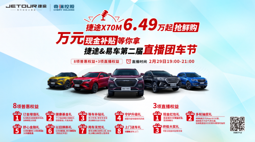 据悉,奇瑞控股捷途第二届直播团车节将于2月29日19:00-21:00火爆开启。为了给予广大用户最大的购车体验和实惠,此次直播团车节,奇瑞控股捷途一连推出了“捷途X70M 6.49万元起抢鲜购”、“8项普惠权益”、“3项直播专属权益”等十多项购车特惠,权益之多、惠及力度之大、服务之贴心,可谓史无前例。 8项普惠权益: 订金增值礼:9.9元抵1000元购车款、1999元太阳膜 健康基金礼:下订抽1000-5000元健康基金,可抵车款 等车补贴礼:先订先得,等车专享至高1000元出行补贴 守护升级礼:0元升级车载新风系统 舒心金融礼:60期0首付/24期0利息/36期超低息 以旧换新礼:旧车0折旧,原价换新车(限指定车型) 用车无忧礼:整车10年/20万公里、发动机10年/100万公里质保 上门送车礼:0接触送车上门 3项直播专享权益: 现金红包礼:看直播抢5轮现金红包,至高888元 多轮抽奖礼:4999元华为Mate30 5G版、889元华为空气净化器、528元捷途X95仿真车模限时抽奖 终极大奖礼:7万元现金补贴等你拿 为了在这样一个特殊时期给用户带来最便捷、最安全、最愉悦的用车、购车体验,奇瑞控股捷途新年过后便大力推动网上购车月、线上4S店的工作,相继推出了老客户五大关怀、意向客户五大暖心服务、经销商五大帮扶、军警医护人员购车9折优惠等政策,无论是针对老客户的延长保养、免费检测、免费车辆消毒、免费送车上门,还是针对新客户的网上看车、网上购车、贷款金融等方案,无不体现了奇瑞控股捷途“以用户为中心”的理念。 此外奇瑞控股捷途更是投入3600万元为全国所有捷途车主免费升级车载新风系统,与先期推出的“车主五项关怀”政策形成了“5+1”新服务矩阵。消息一出,奇瑞控股捷途的客户服务系统立即进入的满负荷运转的状态,车主相关咨询信息如雪片般汇集,客服人员均给予耐心解答。 自去年双十一期间成功举办了捷途首届直播团车节后,奇瑞控股捷途便立足于延展线上业务,力求为用户提供更加省心、快速的看车、购车、用车、养车通道,实现线上线下双向服务,满足不同年龄层的多样化需求。相信这种与时俱进、加速创新、言出必行、客户至上的理念必能为奇瑞控股捷途未来之路再添新风采。 |