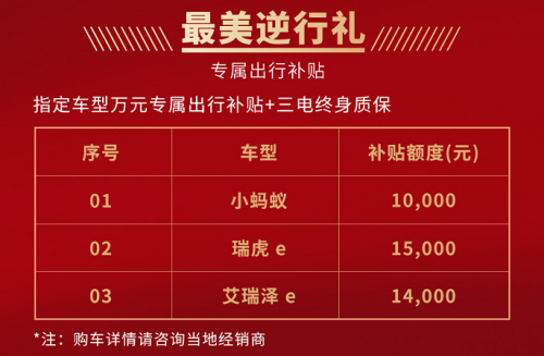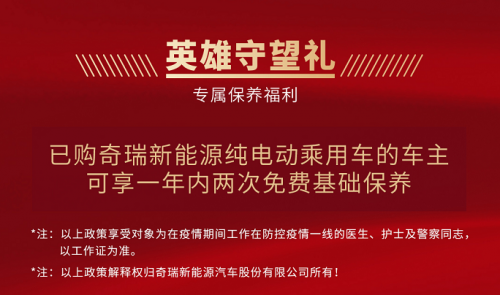 随着疫情防控工作好消息频传,“防疫”阻击战也将迎来最终的胜利。但在我们欣慰的同时,也不能忘记在疫情之下,有这样一群无畏的“逆行者”奔赴战场,他们身披白袍盔甲,用双手托起生命的希望;他们笔直挺拔,坚守一线站好每一次岗,他们用勇气和爱心,用专业和奉献,负重前行。正是他们的大爱守护,才让我们生活的更安心。 为众人抱薪者,不可使其冻毙于风雪。为致敬逆行者,奇瑞新能源此次推出“最美逆行礼”和“英雄守望礼”,针对在疫情期间工作在防控疫情一线的医生、护士及警察同志,只要选购奇瑞新能源2019款小蚂蚁、瑞虎e和艾瑞泽e三款明星车型:购买即可享受至高一万五千元的购车补贴和三电终身质保政策,同时奇瑞新能源针对已购买新能源电动乘用车的车主推出一年内二次免费基础保养的专属保养服务。这一次,换我们守护你们,成为你们坚实的后盾,共克时艰,一起迎接胜利的曙光。 最美逆行礼:专属万元出行补贴+三电终身质保 疫情当前,交通受限,减少接触,依旧是防疫狙击战的关键所在。奇瑞新能源充分考虑到用户用车需求,专门推出了价格补贴,从根本上降低购车门槛。购买今年隆重上市的2019款小蚂蚁、瑞虎e、艾瑞泽e这三款明星指定车型,即可享受10000元—15000元价格不等的购车补贴,为防疫工作者出行提供便利。 · 2019款小蚂蚁:享受补贴额度10000元 · 瑞虎e:享受补贴额度15000元 · 艾瑞泽e:享受补贴额度14000元 值得一提的是,防疫英雄们在享受本次专属感恩政策的同时享受三电终身质保政策:这三款车型的首任非营运车主,都可以享受奇瑞新能源提供的包括动力电池(电芯)、驱动电机(含电机控制器)、整车控制器终身质保服务,为用户提供优惠实在的贴心服务,从实际出发解决用户的使用焦虑,实现全生命周期的用心呵护和贴心陪伴。 英雄守望礼:专属保养福利 奇瑞新能源始终把用户摆在第一位,始终以客户的需求为导向。不忘初心,为了感恩老用户对奇瑞新能源的支持,更是提供了专属的保养政策。针对已经购买奇瑞新能源纯电动乘用车的英雄们在一年内提供两次免费基础保养,定期检查用户的爱车零件,有效的保障用车安全。 国难当前,人人都在贡献自己的一份力量。奇瑞新能源在积极参与抗疫工作之际,为用户推出专属的购车补贴,减轻了用户的购车压力,保障用户的安全出行。同时,奇瑞新能源还坚持“客户至上”理念,致力于打造品质产品和优质服务,以满足用户多场景用车需求。值得一提的是,为了避免大家外出造成交叉感染的情况出现,针对疫情的特殊时刻,奇瑞新能源在疫情期间提供24小时全天候线上便捷服务,实现用户足不出户就可完成看车、订车。 最后: 疫情的苦痛终将过去,春暖花开也必将到来。而我们在迎接胜利之际,不能忘记“最美逆行者”的伟大奉献。这场全民抗“疫”战斗,奇瑞新能源也义不容辞,积极承担起社会责任,以实际行动致敬英雄,切实保障奋战一线的防疫工作者能拥有更优质的出行生活。共克时艰,共同打赢这场疫情防控战。 |