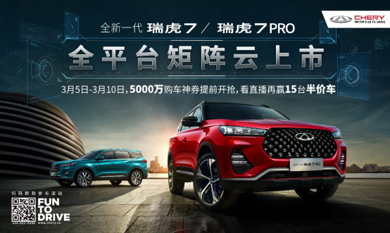 3月9日,奇瑞旗下全新一代瑞虎7/瑞虎7 PRO将以全平台矩阵云发布的形式正式上市。重磅新品,千万豪礼,为回馈消费者一直以来的支持与关注,奇瑞汽车将在官方商城、大咖直播间等多平台进行超级秒杀活动。15台半价车!5000万购车神劵!硬核福利在线发放! 五折抢购准爆款SUV 5000万神劵限时发放 3月5日-3月9日,消费者登录奇瑞官方商城(mall.chery.cn)即可参与5折抢购活动。每天一台半价车,每天21:00准时开抢。同时,观看全网上市直播也有机会赢取相同福利。不止五折!3月5日-3月10日,官方商城、天猫以及拼多多旗舰店还将限时限量发放5000万购车神劵,幸运值满点的消费者最高可赢7777元大额神劵。 成功抢到购车神劵的幸运消费者,登陆官方商城下订99元即可激活优惠劵。购车时,优惠券可直接抵扣车款,也可与经销商店内其他优惠叠加享受。 全平台矩阵直播上市 1000+位当红主播与你云聊车 积极响应疫情之中国家的号召,拥抱互联网环境下的营销新方式,全新一代瑞虎7/瑞虎7 PRO将通过全平台矩阵直播上市。突破传统车型上市单一的视频直播模式和固化的直播流程,此次上市,奇瑞汽车整合头部媒体、电商、科技等多平台渠道,以千人千面场景化的直播形式,向消费者全方位展现全新一代瑞虎7/瑞虎7 PRO这款全优力作。 同时,为解决疫情期间的看车购车等问题,奇瑞汽车还为消费者们提供了线上购车渠道。消费者可通过经销商线上展厅进行在线赏车、信息咨询。线上下订后,奇瑞汽车还可提供上门安全试驾服务。如果消费者到店提车,将由销售顾问一对一专属服务,快速办理交车。此外,奇瑞汽车还携手全国经销商,为已购车客户提供上门保养、免费取送车、在线办理保险购买以及24小时救援热线等五大售后服务。 凭借着全新峰格设计、豪华驾享座舱、标杆级智能配置以及丰富、高效的动力总成,全新一代瑞虎7/瑞虎7 PRO自亮相以来便备受行业及消费者的关注与青睐。用千万福利,回馈用万千期待心。全新一代瑞虎7/瑞虎7 PRO超级秒杀活动即将开始,锁定奇瑞汽车官方商城,以超优惠福利入手准爆款好车! |