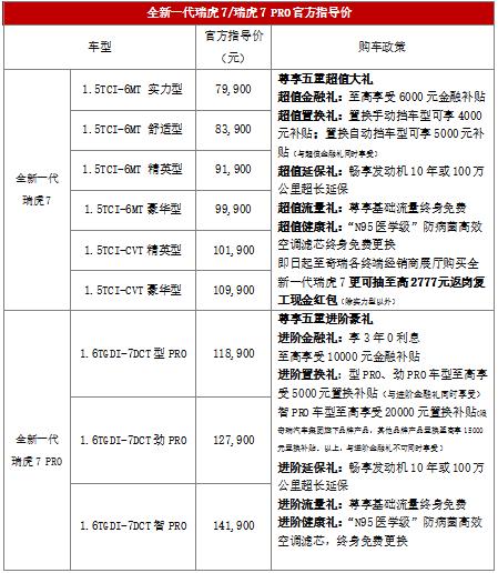 3月9日,奇瑞汽车旗下全新一代瑞虎7/瑞虎7 PRO以全平台矩阵云发布的形式正式上市。新车推出1.5T+CVT/6MT、1.6T+7DCT三种动力总成共9款车型,并提供碧玉蓝、烈焰红等7款全新潮流车色以及运动峰格双色车身可选,官方售价区间为7.99-14.19万元。 为了让用户更轻松的拥有全新一代瑞虎7/瑞虎7 PRO,奇瑞汽车特推出五重超值大礼/五重进阶豪礼购车政策,同时,即日起至奇瑞各终端经销商展厅购买全新一代瑞虎7更可抽至高2777元返岗复工现金红包(除实力型以外)。针对疫情期间消费者无法自由出门看车、买车的问题,奇瑞汽车还开通了线上选购车服务,包括线上看车、信息咨询、线上订车、上门安全试驾服务等。 作为奇瑞汽车2020年强大产品攻势的启新力作,全新一代瑞虎7/瑞虎7 PRO集全新峰格设计、豪华驾享座舱、标杆级智能配置以及高效动力总成于一身,是一款相当契合当下消费者主流审美和生活方式的“新感观真实力SUV”。全面超越同级价值标准,全新一代瑞虎7/瑞虎7 PRO将为消费者提供更健康、更新潮、更智能、更极致的全新用车体验。 “N95级”智能健康生态座舱 守护用户出行每一步 在全民抗疫的特殊时期,奇瑞汽车聚焦用户健康,全力打造全新一代瑞虎7/瑞虎7 PRO“N95级”智能健康生态座舱,以六大健康防护,全面保障用户健康出行。 全新一代瑞虎7/瑞虎7 PRO采用国内首批“N95医学级”防病菌空调滤芯,并支持终身免费更换。该滤芯对≥0.3?m颗粒/病菌等的过滤效率能达到95%以上,可有效阻隔、吸附病毒载体并脱水,降低病菌存活时间。在防病菌空调滤芯的基础上,新车配备智能微正压隔离罩,让空调滤芯成为外界空气进入车内的唯一途径,进一步保证车内空气的清新、洁净。同时,新车配备的生态负离子杀菌系统能够进行有效的除尘、杀菌以及清新空气,为用户打造更健康安全的驾驶环境。 为了时刻保持车内清新空气和健康生态,新车不仅配备AQS空气质量管理系统和RICSCS远程主动式座舱自洁系统,还拥有远程启动空调功能,零接触操控更安全、更便利。 全新一代家族式峰格设计 全方位挑动你的驾驭感官 动则锋芒毕露,静则优雅隽永,全新一代瑞虎7/瑞虎7 PRO将“峰格设计”这一全新设计理念展现得淋漓尽致。采用日曜星河全新家族前脸造型,新车独特的钻石高亮设计赋予前格栅更深邃的立体感;侧面而视,苍劲的腰线、天穹悬浮式车顶、流光红翼行李架,兼收遒劲优雅,营造出极佳的视觉效果;车身尾部,贯穿式祥瑞回纹LED尾灯与高位刹车灯悦目呼应,极具未来感。此外,新车融入19吋超大运动铝合金轮毂、高能流水式动态LED转向灯等诸多潮流设计元素,从不同角度展现出犀利张扬的越级动感。 内饰方面,全新一代瑞虎7/瑞虎7 PRO采用潮酷、抢眼的的三屏交互设计,并提供米黑、红黑、纯黑三种内饰配色可选,营造出科技、奢华的驾乘氛围。巧妙融入细节品质与运动个性,新车采用豪华触感软包缝线和运动缝线双缝线设计,精良选材与精湛工艺相得益彰,带来多重感官享受。同时,全新一代瑞虎7/瑞虎7 PRO还配备智能电子换档、全包覆人体工程学豪华皮座椅以及冠绝同级的1.1m?超大全景天窗,包罗尊贵体验。空间方面,新车车身尺寸为4500/1842/1746mm,宽适的驾乘空间以及475L的宽大后备箱,轻松HOLD家庭的日常出行需求。 越级丰富的智能配置 轻松解锁未来智能车生活 出色的造型设计之外,超丰富的前瞻性智能配置,更是为全新一代瑞虎7/瑞虎7 PRO带来领先同级的高能驾乘表现。 新车搭载支持19项ADAS领先功能的智驾辅助系统,可实现L2+级智能驾驶。新车配备ACC(TJA/ICA)全速域全场景自动巡航辅助系统,并加持LKA车道保持系统、BSD全天候高精盲点监测等十数项辅助装备,全方位提高驾驶的便捷性与安全性。此外,新车还拥有带车辆、行人及自行车保护的AEB自动紧急刹车系统以及DOW开门盲区碰撞预警等精良的安全配置,为驾驶者提供更全面的提醒和保护。首次搭载的APA全自动泊车系统配合360°鸟瞰式全景超清倒车影像,仅需一键操作可轻松实现全场景泊车,让用户远离停车困境。 智能互联方面,全新一代瑞虎7/瑞虎7 PRO 也充分考虑了年轻用户对于娱乐性和实用性的双重需求,雄狮智云智能网联系统将高速4G-WiFi、在线音乐、远程车辆控制以及人脸识别安全控车等多项功能融入日常用车场景,让智能出行与日常生活无缝衔接。配备的AI增强型语音交互支持46种方言识别,新增声源定位和上下文理解功能,识别更精准,交流更简单,让用户彻底告别“听不懂、不明白”的操作窘境,享受更智能、更高效的车载智联体验。 此外,新车配备诸多领先的人性化、超便捷智能配置,包括手机无线充电、前排座椅电加热、快捷开启儿童锁以及同级独有的手机智能蓝牙钥匙和双区恒温自动空调+自动除雾等,完全能满足用户多场景下的各种用车需求。 超强高效动力总成 更高效率更低油耗更多选择 动力方面,全新一代瑞虎7提供1.5T+CVT/6MT两套动力,全新一代瑞虎7 PRO则搭载第三代ACTECO 1.6TGDI发动机,匹配7速湿式双离合变速箱。丰富的动力组合将带给用户更多选择。 其中,1.5T动总的涡轮增压引擎采用豪华品牌发动机的领先集成技术,拥有可媲美豪华品牌的37.1%热效率,最大功率115kW,峰值扭矩230N?m。传动方面,全新一代瑞虎7搭载获得“龙蟠杯”世界十佳变速器荣誉的9CVT无级变速箱。1.5T+9CVT白金高效动力总成的