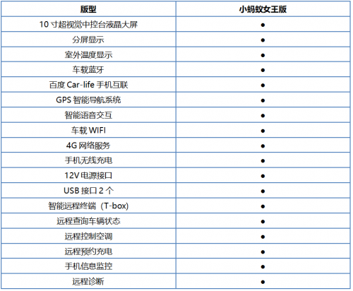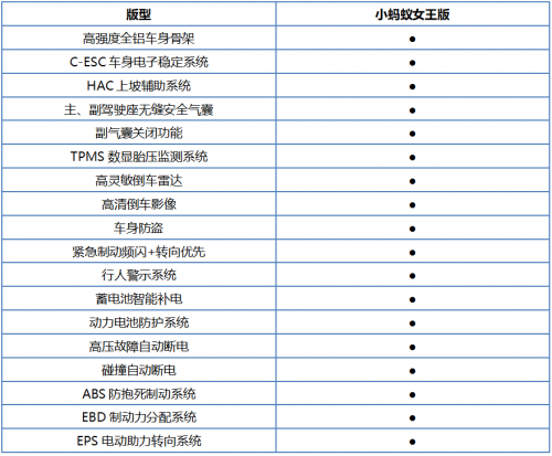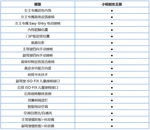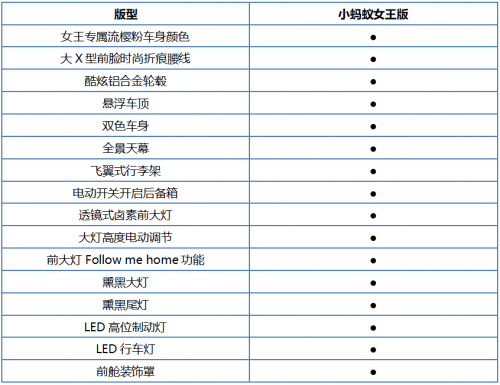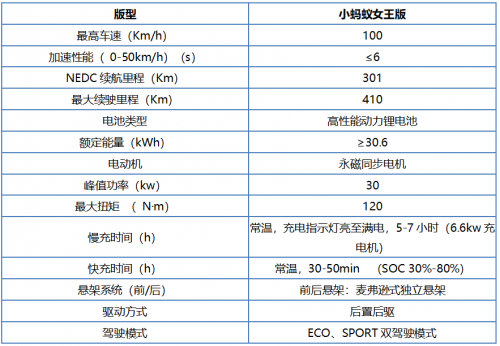 阳春三月,每一朵樱花都没有错过花期,如约绽放;散发着春天气息的小蚂蚁女王版也随着春的脚步于3月25日正式上市。作为奇瑞新能源旗下的明星车型,小蚂蚁女王版不仅是对城市潮流新物种的新色诠释,更是全国人民对春日“焕彩”、万物“新生”的美好愿景。值此小蚂蚁女王版上市高光时刻,又恰逢奇瑞新能源小蚂蚁上市三周年,多重好礼和优惠购车政策钜惠。这对于消费者来说,俨然是不可错过的购车好时机。 此次焕彩上市的小蚂蚁女王版,进行了全新配色升级,采用了极具春天感染力的流樱粉配色为用户带来至臻宠爱,粉米双色内饰搭配让座舱更显浪漫优雅,女王专属Easy-Entry电动座椅、女王专属高级皮质座椅等女王专属配置包带来不一样的驾控体验,是当下城市潮流心动座驾首选。无论是配置还是售价都极具性价优势,尤为值得广大年轻消费者购买。 流樱粉外观: 外观方面, X型前脸设计时尚耀目,熏黑车灯炫酷个性;流行的时尚折痕式腰线以及悬浮车顶设计,同样潮流动感。同级独有的全景天幕,更让小蚂蚁女王版能感受到春天阳光的沐浴,夜晚出行抬头就可仰望星空。而且此次小蚂蚁女王版采用了全新流樱粉车身配色给用户带来至臻宠爱的同时,也为Q萌的外观增添了一丝浪漫气息,和这个春意盎然的季节高度契合,是郊外春游的不二之选。 浪漫内饰: 内饰方面,粉米双色内饰配色,彰显出了别样的浪漫和优雅。此外,软质材质包裹的中控台以及一体化的女王专属高级皮质座椅,乐享精良品质。新车配备的女王专属的Easy-Entry电动座椅,可一键快速移位+翻折、复位,为后排乘客的进出提供了更便捷、舒适的方式。而前排座椅中间位置搭载有同级独有的中央扶手,保证了驾驶时的舒适从容。主副驾驶遮阳板+化妆镜等的贴心化人性设计,也再次凸显小蚂蚁女王版的专属身份与享受。 需要特别提及的是,小蚂蚁女王版搭载的智能空调,还具有同级独有的自清洁/自通风功能,同时采用PTC加热技术可有效灭毒杀菌,时刻保证车内空气清新健康,保护驾乘者的安心出行。 空间上,小蚂蚁女王版采用两门四座设计,独有的2+2自由空间布局,跟同级车相比有着更丰富的空间驾乘优势。后排座椅放倒后,还可瞬间变成非常可观的储物空间,周末姐妹出游野炊、商场购物等场景都能轻松满足。 智能配置: 在智能配置方面,小蚂蚁女王版实现了4GWiFi时刻在线,能实时体验在线音乐、导航等功能;全新的百度Carlife手机互联系统,可实现手机与车内智能大屏的切换互联。同时,AI智能语音,还能进行娱乐、导航等多种功能,真正做到了解放双手。值得一提的是,小蚂蚁女王版还搭载了同级独有的手机无线充电功能,避免驾乘者的电量焦虑,随时保持手机活力满电状态。 此外,远程控制系统同样方便舒心,能进行远程开启空调、预约充电、车辆定位等操作,在同级车型中表现最优。 续航驾控: 续航里程一直都是用户们选购电动汽车最关注的问题之一。小蚂蚁女王版搭载了高性能动力锂电池,其NEDC综合工况续航为301km,最大续航高达410km,在同级车型中续航表现突出,能轻松满足一周的上下班通勤,真正做到了“充电一次,畅行一周”。充电方面,快充30分钟即可充电至80%电量,充电时间同样均优于同级,真正做到了充电、续航方便便捷。同时,小蚂蚁女王版拥有七档智能动能回收功能,用户可以体验到高效能量回收带来的续航提升和出色的节能表现。 在驾控体验方面,小蚂蚁女王版同级独有后置后驱真正纯电,轴荷比例1:1、四轮独立悬架等配置令其底盘极为扎实,带来了平稳、顺畅的道路驾控体验。智能高端的电子手刹搭配自动驻车功能,极大方便了车辆的启停;自动驻车,安全起步等驾控操作也更加平稳。动力方面,搭载一台高性能永磁同步电机,最大扭矩达120N·m,最高时速可达100km/h,0-50km 加速仅需 6 秒,让用户在出行过程中拥有驾乘畅快、自由的体验。 安全防护: 在安全方面,小蚂蚁女王版同样进行了精心设计,从主被动安全层面以及三电安全层面,为用户带来了全面的安全呵护。 小蚂蚁女王版采用五星安全标准设计,同级唯一的航空级全铝构架和3R-BODY环状高强度车身骨架,带来了更优的车身碰撞高效吸能表现,为驾乘人员提供了钢筋铁骨般的防护。主动安全上,小蚂蚁女王版全面搭载了同级独有的C-ESC车身电子稳定系统,以及TPMS胎压监测系统、HAC上坡辅助系统等多项主动安全配置,能将危险最大化的扼杀在摇篮中,为驾乘人员提供了全面、可靠的品质安全保障。 三电安全对新能源汽车来说同样是安全的重点。而小蚂蚁女王版基于第三代纯电动技术平台,确保了三电系统在技术层面的可靠品质。也正是基于对自身产品品质的自信,奇瑞新能源小蚂蚁率行业之先推出三电终身质保,凡购买奇瑞新能源小蚂蚁首任非营运车主,都可以享受由奇瑞新能源提供的包括动力电池(电芯)、驱动电机(含电机控制器)、整车控制器在内的三电终身质保,从根本上解决用户用车忧虑。 除此之外,小蚂蚁女王版配备的电池组具备有高压断电保护功能,在碰撞发生时会自动断电保护车内驾乘者安全;同时,该电池防水等级达到了IP67级别,能从容、安全的涉水前行,不必担心连电等安全问题。 推荐车型:小蚂蚁女王版 补贴后售价:7.88万元起 (另,2019款小蚂蚁4座智享版、4座智炫版均可选配女王专属配置包,流樱粉小蚂蚁补贴后售价