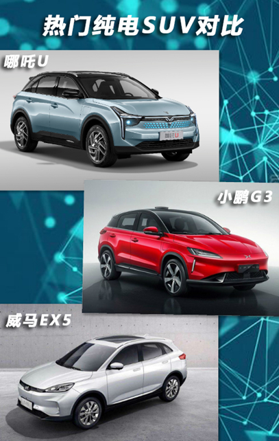 众所周知,新能源汽车正逐渐成为汽车行业的新宠,一方面它们固有的经济、节能、环保属性,符合大众消费趋势以及汽车产业的长期可持续发展;另一方面相较于传统燃油车,新能源汽车拥有更灵活宽敞的空间、更智能的配置、更舒适的驾驶。在竞争激烈的纯电SUV市场,自然不缺表现优异的车型,尤其是15-20万元细分市场。他们售价更加亲民,性能也更为接近。今天,我们就来对比三款市场关注度比较高的车型:哪吒U、小鹏G3和威马EX5,看看谁能更好地满足用户需求。 为公平起见,我们选取了三款最新上市、指导售价接近,均在18万元上下的车型进行对比,分别为哪吒U 520U创版,指导价格为17.98万元;小鹏G3 520智享版,指导价格为17.98万元;威马EX5 创新版520,指导价格为18.98万元。 外观风格迥异 尺寸各有所长 颜值虽然不是决定一款车能否成功吸引消费者的唯一因素,但却是非常重要的敲门砖。三款车都采用了最新的家族风格,而且设计愈发年轻化,吸引更多年轻消费者的青睐。相比之下,哪吒U时尚新潮、小鹏G3相对前卫动感、威马EX5看上去更加具有科技感,可谓各有风格,各有所长。 从整体设计风格来看,小鹏G3采用了无中网设计,标志性向下俯冲的车头前卫动感;威马EX5凸显科技属性的发光LOGO、贯穿式LED尾灯设计十分惹眼;而哪吒U的设计在这三款车中绝对可以算得上颜值担当,与时下互联网消费人群的价值主张和审美需求不谋而合。整车比例匀称、曲面凹凸有致,极具“锋刃感”,每一个曲面的发起、延展和收敛都恰到好处。全车采用名为“极地之光”的LED灯组,包含LED前大灯及LED日间行车灯、IME互动呼吸灯,贯穿式LED后尾灯。据了解,哪吒U由国庆阅兵车红旗L5的主设计师常冰先生设计,这在一定程度上,为产品设计的成熟度和美誉度加分不少。