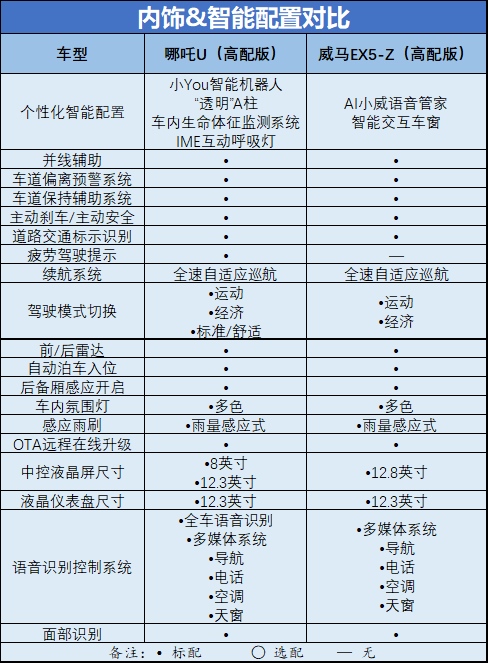 年轻的消费者正在加入购车的大军之中,相比前辈们,他们对于车型的要求,变得更加严苛。为了能更好的迎合年轻用户的购车需要,很多车企就把全新的车型推出来,而且它们非常注重颜值、配置、动力方面的表现。而就在昨天(5月10日),威马发布了全新的车型威马EX5-Z,其实,相比此前的威马EX5,此次推出的EX5-Z在新车的动力系统、续航能力以及智能配置上都没有太大的变化,因此倒不如说EX5-Z是EX5的改款车型。不过,从售价和市场定位来看,威马EX5-Z都和刚刚上市的哪吒U不差上下、针锋相对。不少准备购车的朋友问笔者,这两款车有什么区别,哪款更合适入手?今天,笔者就带大家看看,谁更受青睐! 外观各异 符合当下年轻消费者审美需求 了解一款车,最开始也最直观的体验莫过于外观造型和车身尺寸。 从整体设计风格来看,新上市的EX5-Z继续延续了家族式的设计风格,变化并不大,依旧采用具有层次性的前脸和贯穿式LED尾灯设计。前脸中央搭配亮黑色装饰线条,同时点缀着凸显科技属性的发光LOGO。车身侧面轮廓看起来比较简约,而在门把手上的设计上,威马EX5采用的是隐藏式门把手,融入侧面流体低风阻车身,整体造型较为简洁流畅。 哪吒U是基于Eureka 01概念车的整体设计而打造,不仅运动感和科技感十足,也更显潮流和档次。新车整车比例匀称、曲面凹凸有致,极具“锋刃感”,每一个曲面的发起、延展和收敛都恰到好处。全车采用名为“极地之光”的LED灯组,包含LED前大灯及LED日间行车灯、IME互动呼吸灯,贯穿式LED后尾灯。据了解,哪吒U由国庆阅兵车红旗L5的主设计师常冰先生设计,这在一定程度上,为产品设计的成熟度和美誉度加分不少。 虽说“萝卜青菜各有所爱”,但在笔者看来,一款年轻个性、极具运动感的造型设计,恐怕更符合当今年轻人追求个性的审美。 再来看尺寸,两款车的长宽高略有差异,而真正的差距在轴距。哪吒U的轴距更长,达2770mm,这也为内部空间利用的最大化提供了基础。因为威马EX5-Z刚刚上市,笔者还没来得及亲身体验,所以难以评价,但就目前网上针对哪吒U与此前的威马EX5创新版520(与威马EX5-Z尺寸相同)的空间测评来看,哪吒U的空间更有优势。对于具体体验如何,还需要消费者亲自去感受。 智能科技配置 哪吒U拥有绝对的话语权 在内饰和智能配置方面,两车都带来了足够的诚意。不过,就个性化及配置前瞻性而言,笔者认为,哪吒U恐怕有绝对的话语权,做到了“人有我优,人无我有”。 先来看智能控制的入口——最直观的中控大屏。威马EX5-Z,配备了12.8英寸悬浮式智能旋转屏,搭载包括爱奇艺、QQ音乐、喜马拉雅等车机娱乐影音系统,在享受娱乐的同时,让用户一目了然地了解车辆信息。而哪吒U采用的是双12.3寸+8寸一体式三联屏设计,搭载了当下最热门的抖音、在线音乐等多款车机娱乐影音系统。此外,三联屏的设计一方面带给用户以全新的视觉冲击;另一方面,哪吒U的中控大屏可以启用副驾模式,将一半屏幕的操作交给副驾驶,控制车内的空调、娱乐等智能交互。这不仅降低了驾驶员分心的风险,同时也给副驾驶带来参与感和娱乐体验。 再看个性化的智能配置。威马EX5-Z的AI小威语音管家、智能交互车窗以及哪吒U的“透明”A柱、小You智能机器人、车内生命体征监测系统,都是新创车企在智能交互、智能安全上的突破之举。就智能语音交互功能而言,两车分别搭载的AI小威语音管家、小You智能机器人都可以实现了电话通讯、地图导航、音乐娱乐等功能的语音控制。其最大的区别在于,哪吒U的小You智能机器人是一个可以提供主动式AI情感服务的智能交互系统,基于生物识别、智能语音、大数据分析和深度学习能力,小You智能机器人可实现情感互动和人性化自然语音交流,具备疲劳驾驶提醒、全车AI语音控制、智能家居控制、eCall主动救援服务等实时主动交互功能。在主动记忆模式下,小You会变身随身秘书,主动提醒主人当天的行程安排,非常贴心。 另外,哪吒U是全球首款搭载的“透明”A柱的量产车,这也为这款车的整体优势增色不少。“透明”A柱是通过将OLED柔性屏安装在A柱内侧,无缝链接A柱内饰,配合自主研发的智能软件算法和外部高清摄像头,实现A柱透明可视化,并可根据驾驶者头部移动自动调整画面视角,彻底解决盲点问题。 在主动安全技术和驾驶辅助功能上,威马EX5-Z搭载了L2级Living Pilot智行驾驶辅助系统,哪吒U搭载了L2+级自动驾驶辅助系统。虽然叫法不同,但所搭载的功能不差上下,应有尽有,都具备主动刹车、并线辅助、车道保持/偏离预警、交通标识识别、疲劳驾驶提醒、全速自适应巡航、自动泊车等功能。不过,威马EX5-Z在疲劳驾驶提示方面有所欠缺,对于实现智能驾驶的安全性有一定的影响。哪吒U搭载Mobileye EyeQ4顶级视觉芯片,包含14个计算核心、22个传感器、千万行代码,在功能性和安全性上更胜一筹。另外,哪吒U的APA一键式自动泊车,在安全性和准确率上也占有优势,其性能甚至超过了奔驰等豪华车型。 续航不相上下 三电技术略有不同 在动力性能表现上,两款车的NEDC综合工况续航里程都达到了500km以上,足以媲美传统燃油车,里程焦虑不再是问题。 与威马EX5-Z相比,哪吒U在功率和扭矩上略显逊色,但加速性能却强很多,威马EX5-Z百公里加速在8秒以上,而哪吒U仅不到7秒。这主要是因为哪吒U是业内首款搭载S-EDS“三合一”高性能集