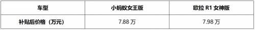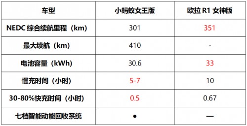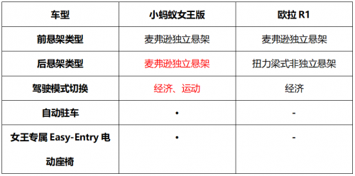 疫情过后,城市又逐渐恢复往常车水马龙。交通拥堵,车位难寻的现象也逐渐增多,尤其对驾驶技术不过硬的新手司机而言,有时因为停车技术差,白白错失了一个车位,再加上日益严格的排放标准,一台小巧、灵活的新能源代步小车逐渐成为更多消费者的选择目标。随着越来越多具备高颜值、长续航以及舒适驾控体验的优质小车出现,着实让人眼花缭乱。今天就为大家挑选奇瑞新能源小蚂蚁和欧拉R1两款热门车型,通过对比分析来看看究竟谁更具性价比,也希望能为广大买车一族带来一些启发。公平起见,我们选取小蚂蚁女王版和欧拉R1女神版进行对比。 (小蚂蚁女王版和欧拉R1女神版) 单从价格来看,小蚂蚁女王版补贴后价格比欧拉R1女神版略低,具有一定的价格优势。 颜值考量:小蚂蚁女王版更灵动潮流 俗话说,看人先看脸,而对于汽车而言同样如此,高颜值的外观设计势必会更先夺人眼球。采用全新流樱粉配色的小蚂蚁女王版,灵巧萌动的外观可谓是吸“晴”十足。时尚耀目的“X”前脸设计和炫酷个性的熏黑大灯,对年轻的男孩女孩都极具吸引力。而兼具潮流与动感的悬浮车顶配备同级独有的655*768mm采光面积的超大全景天幕,抬头即可仰望星空,让年轻人的夜晚约会更加浪漫,也令很多用户更加难以拒绝。 (小蚂蚁女王版外观图) 定位于女性专属车的欧拉R1女神版则可以说是萌系代表车,两个圆形的大车灯就像卡通人物小黄人,有一双萌萌的大眼,而且其前脸采用双圆灯+封闭式前格栅的设计,下部进气口和LED日行灯也都是圆角矩形的元素,圆润风格令它看上去非常可爱,但这种可爱风也导致其用户群体偏小众了些。 (欧拉R1女神版正面图) 从整体颜值来看,两款车都各有千秋:小蚂蚁女王版看起来更加灵动潮流,欧拉R1女王版则更显呆萌圆润,想要什么style还要看个人选择~ 空间对比:2+2灵活空间自由组合 随着二孩时代到来,年轻用户家庭选车时越来越看重空间。而在空间表现方面,小蚂蚁女王版可谓“别有洞天”,1670mm的宽体车身及1590mm的车高,不仅保证前排座椅为腿部、肩部、头部预留充足的活动间隙,而且后排的座椅也同样舒适,即便是身高在1米8左右,坐在后排也不会觉得空间拥挤。对比其他品牌的同级别车型,小蚂蚁女王版同级独有的2+2灵活自由的组合拥有显著优点,非常全面地考虑了用户对驾乘空间的需求。 (小蚂蚁女王版空间) 再看欧拉R1女神版,整体尺寸为3495mm×1660mm×1560mm,基本可以满足日常需求。虽然车身长度和轴距略超小蚂蚁女王版,但小蚂蚁女王版的宽体车身及高度保证了驾驶的舒适感,尤其是车身高度。欧拉R1女神版相较于小蚂蚁女王版车身高度矮了整整30mm,坐上一个稍微高一些的人就会显得空间十分狭隘。 (欧拉R1女神版空间) 总体而言,作为微型小车中两款热销车型,空间表现可以说可圈可点,而且都支持后排座椅放倒,拉人载物都十分轻松。但是从整体数据对比来看,小蚂蚁女王版空间表现力略优于欧拉R1女神版,而且同级独有的中央扶手设计不仅保证驾驶从容,也为新车增加了不少储物空间,可谓一举两得。 续航PK:能跑还能充,才能走的更远 作为一款纯电动车,拥有出色的续航能力才是最重要的,毕竟续航焦虑问题一直都是大家不变的关注焦点。小蚂蚁女王版配备高于30.6kWh的高性能动力锂电池,NEDC综合续航里程为301km,最大续航里程达410km。同时,在快充模式下,30分钟可从30%充电至80%,慢充模式下也仅需要5~7小时,充电一次通勤一周,快捷更方便。不仅如此,小蚂蚁女王版搭载七档智能动能回收系统,使之在节能性能上也有着更加出色的表现。 (小蚂蚁女王版续航表现) 而欧拉R1的综合续航里程达到了351km,也能满足年轻人日常上班出行需求。但是在充电方面,欧拉R1女神版快充模式下达到电量80%需要40分钟,慢充模式满电则需要10小时,相较于小蚂蚁女王版充电时间更长,用户时间成本消耗更高。 (欧拉R1女神版续航表现) 在续航表现上,小蚂蚁女王版和欧拉R1女神版续航里程均超300km,基本满足用户日常用车需求。但是,小蚂蚁女王版快速的充电模式和七档智能能量回收系统,为用户带来更卓越续航体验。 驾控体验:麦弗逊独立悬架,驾控操作更平稳 驾控体验决定了一款车的舒适与否,通过对比可以明显看出小蚂蚁女王版在考虑用户需求这方面还是颇具诚意。小蚂蚁女王版配置同级独有的前/后麦弗逊式独立悬架、并搭配后置后驱的驱动系统,平衡了车辆的舒适性和操纵的稳定性需求。而小蚂蚁女王版电子手刹、自动驻车等黑科技加入让用户驾控更方便和安全。尤为一提的是,小蚂蚁女王版还配备了双驾驶模式切换,用户可以根据路况不同,进行运动与经济双模式自由切换,自在享受驾驶乐趣。 (小蚂蚁女王版驾控体验) 而在底盘方面,欧拉R1女神版前悬架类型采用麦弗逊式独立悬架,后悬架类型则为扭力梁式非独立悬架,与小蚂蚁女王版的同级独有后麦弗逊式独立悬架相比,在驾控的顺畅度与稳定性方面稍有不足。在操控配置方面,除了搭载与小蚂蚁女王版相同的上坡辅助以外,自动驻车等智能驾控系统并没有体现,稍显逊色。 (欧拉R1女神版驾控体验) 微型小车之所以广受追捧,一部分原因就在于其灵巧轻便的可操控性。不难发现,在驾控体验这方面,小蚂蚁女王版凭借着出色的底盘调教和智能驾控配置占据上风,具有一定的产品优势。此外,新车还配备了女王