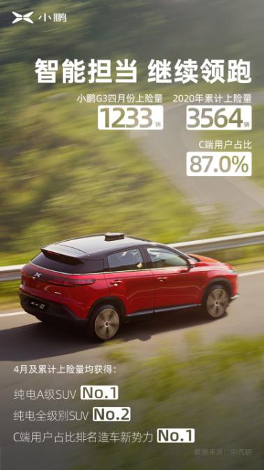 【5月14日】根据中国汽车研究中心(简称:中汽研)数据,2020年4月小鹏G3上险量达到1233台,1-4月总上险量达到3564台,在2020年4月汽车行业销量呈“V”字反弹上涨趋势下,小鹏G3凭智能实力继续发力领跑,在4月、1-4月均获得纯电A级车SUV市场第一名、纯电全级别SUV市场第二名的佳绩。值得一提的是,小鹏G3个人用户占1-4月上险量的87 %,成为造车新势力中C端用户排名第一的企业,而配备智能版本的车型占总体上险量的90.4%,充分证明了消费者对小鹏G3高智能的认可与青睐。 (小鹏G3 4月上险量) 软、硬件皆可进化的智能汽车 小鹏G3作为一款真正意义的智能汽车,拥有更适合中国路况的自动驾驶辅助和全场景自动泊车能力,其中自动驾驶辅助能力能够在高速或者市区路况解放驾驶者的右脚,让出行舒适性倍增。而自动泊车能力则可实现两步泊车,帮助驾驶者迅速找到和判断合适的停车位,高效便捷,轻松将车辆停入横向或纵向车位,解决在夜间视线不良、泊车位狭小、生手泊车等情况下泊车的麻烦。除此之外,小鹏G3还拥有“你好小P”AI语音助手功能,只需语音即可随心所欲控制车内各项功能。 最重要的是小鹏G3拥有软、硬件皆可进化的能力,软件进化即OTA能力,只需要官方推送,车主通过车机端或手机App上就可以完成整车的OTA升级,让车主随时随地享受整车升级的便利和高效。而硬件升级是小鹏汽车在4月刚推出的行业领先的智能能力,区别于其他传统车企,能够在不换新车的前提下更换全新的智能网联硬件,能够让原款G3车主拥有小鹏汽车最新的Xmart OS 2.0系统,为用户带来更流畅、更智能的驾控体验。 (小鹏G3 外观) 拥有高安全、长续航能力终结纯电车用户焦虑症 小鹏G3拥有高安全标准,2020年1月,小鹏G3参与中保研安全碰撞测试获得4项“优秀”及2项“良好”的成绩,这是造车新势力甚至在纯电动车在中保研的首次碰撞测试,真正的定义了G3在汽车行业的安全地位。而在此之前,小鹏G3参与2019年第二批中国 <https://baike.baidu.com/item/%E4%B8%AD%E5%9B%BD>新车评价规程(C-NCAP)测试,以综合得分率92.2%获得C-NCAP 测试五星评价,成为2018版C-NCAP 测试规则发布后,首批参与测试并获得五星评价的纯电动车型之一。这份成绩的背后,是小鹏G3车身比例达到70%的高强钢,是轻量化高强度铝合金材料的前舱盖,是高强度框架式的车身结构,这些都是小鹏G3为用户安全考虑的诚意,打造更安全的防护让驾乘人员如同置身于钢筋铁骨打造的笼形座舱之中,出行倍感安心。 续航能力是消费者驾驶纯电车最大的焦虑点,小鹏G3 520在NEDC综合工况下,续驶里程为520公里。该工况测定标准由3个市区路况和1个市郊路况组成,家庭出行一周充一次电足矣。同时,小鹏G3 520还使用了宁德时代品牌提供的三元锂电池,其工艺成熟,可靠性好,安全性高,环境适应性强,工作温度范围为-30至55℃,无论是夏天、还是冬天都不用担心电池安全问题。 (小鹏G3 520装配的宁德时代电池) 2020年已经过三分之一,小鹏汽车坚持通过自主研发、智能智造,为用户创造更加美好的出行生活的理念,不断的在智能汽车这条赛道上奋进前行,在动荡的车市中表现出了企业强劲的韧性。未来,小鹏汽车将继续通过“电动+智能”双引擎驱动,以可靠的品质和领先的智能为差异优势,为消费者进化更多的可能。 ## 关于小鹏汽车 小鹏汽车是中国领先的智能电动汽车设计及制造商,也是融合前沿互联网和人工智能创新的科技公司。我们致力于通过自主研发、智能智造,为用户创造更美好的出行生活。 2014年中,毕业于清华大学汽车工程系的夏珩与何涛等共同创办了小鹏汽车。创办小鹏汽车前,两人分别为广汽新能源控制系统开发负责人和广汽智能汽车和无人驾驶负责人。小鹏汽车初创投资者主要为UC优视联合创始人及前阿里巴巴移动事业群总裁何小鹏,于2017年8月正式加入小鹏汽车。2018年3月,摩根大通亚太区投行主席顾宏地博士加盟小鹏汽车,与何小鹏、夏珩、何涛形成小鹏汽车核心管理团队,来自互联网、汽车制造和战略融资富有差异的管理团队塑造了小鹏汽车独特的DNA。 小鹏汽车获得了阿里巴巴集团、小米集团、IDG资本、晨兴资本、GGV纪源资本、春华资本等顶级中国及国际投资者的支持。公司研发总部位于广州,并在北京、上海、广东肇庆、郑州和美国硅谷、圣地亚哥设有研发、生产与营销机构。获取更多信息请登陆小鹏汽车官方网站:<https://www.xiaopeng.com>,或关注: |