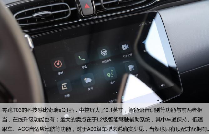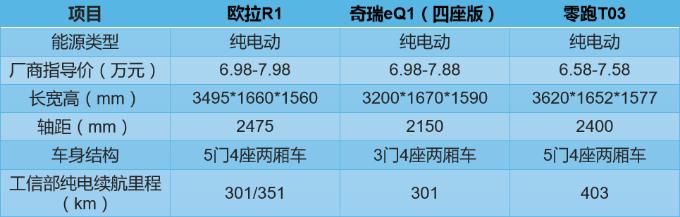 此外,欧拉R1前圆后方的大灯颇具MINI的经典复古神韵,小巧精致的犀牛角天线,8幅16寸铝合金轮毂,以及拼色车身设计,整体时尚动感,青春气息十足。 最早上市的奇瑞eQ1则体现了早期A00级电动汽车的设计语言,身材短小而折面繁多,风格上与不少老年代步车异曲同工,颇为小巧,但谈不上有个性。 刚刚上市的零跑T03,外观设计见仁见智,“吊梢眼”的前大灯与smart有些相似。 综合来看,欧拉R1符合主流“上品”的时尚感,奇瑞eQ1作为分时租赁的代步小车已成为城市街头的熟悉风景,而零跑T03作为“新势力”选择了更稳妥的传统风格。对于“后浪”们来说,显然欧拉R1的外观设计更能满足个性化选择。 宝藏空间,是自由的味道 “房子是租的,而生活不是。”比起遥不可及的房子,汽车是年轻人努力可及的专属私人空间,甚至比租来的房子更亲密。不再畏惧雨雪天,不必担心凌晨后的回家路,疫情之下安心出行,那不只是一辆车,而是自由的味道。 欧拉R1采用四轮四角设计,“把20%的空间留给机器,80%的空间留给人和行李”。三款车型中,欧拉R1轴距达到了同级最长的2475mm,轴距与车长占比超过70%,以A00级车身达到了A0级空间,后排双座上下人完全不局促。后排座椅折叠后,还能释放更多装载容积,对于接送亲友、搬家扫货都够用。 除了实用空间,欧拉R1还注重营造内饰的舒适性,诠释生活品质感。 车长仅3米2的奇瑞eQ1在三款车中最短,为了改善空间实用性而推出了4座版,不过2150mm的轴距发挥余地不大,新增的后排两个座位很难兼顾舒适性,载物功能要优于坐人。 零跑T03在三款车中车长表现较优,但高度、宽度和轴距都不占优势。储物空间还算够用,也在储物细节方面下了些功夫。内饰采用大量的硬塑料,较为简洁,但没什么亮点。 三款车比较来看,欧拉R1的空间优势和品质感最为显著,奇瑞eQ1的空间更适合一个人,而零跑T03亮点较少。 科技ICON,是潮流的密码 信息时代的生活在加速,如果说原生家庭、行业壁垒造成的差异难以撼动,那么科技成为大多数“后浪”能够获得的、追赶时代潮流的借力之一。好在,曾经BBA或中高级汽车才搭载的智能科技,已经出现在入门级的小型车身上,普惠经济条件并不那么优越的年轻人。 欧拉R1的智能便捷配置相当丰富,通过科大讯飞系统能进行相当准确的语音控制。“你好,小欧”唤醒系统后,可语音控制导航、空调、蓝牙电话、音乐播放,以及查询天气、日程、航班、新闻等常用信息,FOTA系统远程在线升级更是早就实现了。 欧拉R1的智能安全配置既有低速行人警告系统、前碰撞预警、自动紧急刹车等“前沿”黑科技,也有上坡辅助、胎压监测等常用关键配置,安全守护很全面。 奇瑞eQ1的10寸大屏幕最为“吸睛”,提升了科技感。 零跑T03刚上市就大打“智能”牌,最大的噱头莫过于人脸识别启动。