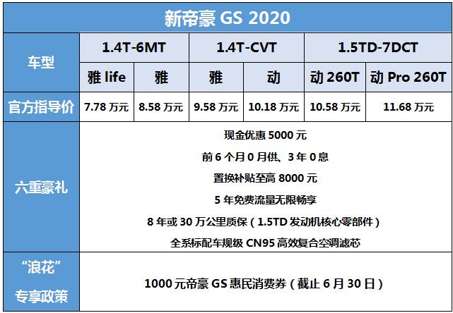 6月13日,吉利汽车在“OMG,浪来了!—2020吉利好车节暨新帝豪GS 2020上市直播”活动中宣布新帝豪GS 2020正式上市,推出“动”和“雅”双版造型,1.5TD-7DCT黄金动力和1.4T-CVT高效动力等共六款车型,全系满足国六b排放标准,官方指导价为7.78-11.68万元。据悉,新车在造型设计、智能科技、生态安全等方面进行全面升级,实现了“有颜、有料、有趣”多维品质进阶。 同时,新帝豪GS 2020在上市直播中还针对动静青年推出“浪花”专享政策,6月30日前购车即可享“1000元帝豪GS惠民消费券”,同时还可享受“现金优惠5000元,前6个月0月供、3年0息,置换补贴至高8000元,5年免费流量无限畅享,8年或30万公里质保(1.5TD发动机核心零部件),全系标配车规级CN95高效复合空调滤芯”等六重豪礼。 颜值UP:动&雅双版造型,全新红黑撞色内饰,更加年轻动感 外观上,新帝豪GS 2020延续了“新运动拟态美学”设计理念,推出“动”版和“雅”版两款造型,分别呈现运动凌厉和时尚优雅两种不同设计风格,为不同用户提供更多元的个性化选择。其中,“雅”版在造型细节上进行了升级,新增耀目拟态组件,在车头雾灯区新加入了亮红色的灵动镀铬环设计,动静结合,更显时尚动感;车尾保险杠区增加红色悦目尾饰设计,宛如体操运动员手中挥动的彩带,横向拉伸连接两边的运动时尚镀铬双排气管,优雅中又不失灵动,提升了整个车尾视觉效果和辨识度。 “动”版车型仍延续了动感、凌厉的造型风格,曜石黑动感双色车身,匹配下保两侧“L”型镀铬装饰、远近光一体锐利LED大灯、环岛视觉LED熏黑尾灯等,尽显潮酷、运动气质,整车设计感与品质感显著提升。 内饰上,新帝豪GS 2020采用全新焕醒运动座舱,内饰全系升级为时尚运动的红黑撞色设计,魅力运动座椅和时尚双色安全带均加入红色元素,犹如颜值与实力碰撞的火花,尽情释放跨界激情,令人耳目一新。在材质与工艺选择上,新车也充分考虑年轻人的喜好,中控面板采用天际流光INS装饰套件,简约而不缺层次,犹如天际划过流光,唤醒视觉感官;副仪表台则新采用钢琴烤漆设计元素,触觉上犹如琴键滑过指尖,细节处彰显优雅品质。此外,新帝豪GS 2020还配备了1.52㎡的全景星空天幕,无论前后排,均能享受远超同级的通透视野与采光。 智能UP:双屏升级,搭载GKUI 19智能生态系统和L2级智能驾驶辅助系统,更加智能有趣 在智能科技上,新帝豪GS 2020双屏分别升级为7英寸全液晶仪表屏和10.25英寸时尚灵动超清屏,无论是软硬件还是功能性均达到行业领先水准。值得一提的是,新车搭载了GKUI 19吉客智能生态系统,采用前沿云数据及人机交互技术,可支持8台设备同时联网的WIFI功能,畅享5年免费流量,还集成了高德实时在线导航、“你好吉利”智能语音交互系统、海量免费在线音乐与电台、生活服务资讯等丰富功能,以更全能的AI技术和更敏捷的反应速度,构建全新智慧行车的移动智能空间。 同时,GKUI 19联合打通京东智能生态,可接入500+品牌和2000+智能产品,实现无边界的车家互联智能汽车生活;并支持手机APP远程控制功能,可通过手机APP实时掌控车辆状态,远程控制开闭发动机、空调,升降车窗,开关车门、后备箱等多种功能,大幅提升车辆的智能、便捷和实用性。 在智能出行方面,新帝豪GS 2020搭载了领先同级的L2级智能驾驶辅助系统,集成ICC智能领航系统、LKA车道辅助保持系统、AEB-P预碰撞安全系统(带行人识别保护)、SLIF交通限速标识智能识别系统和IHBC智能远近光控制系统,能够实现智能跟车、转弯、刹车等多元化功能,智能安全实时在线。 实力UP:全系标配“CN95”空调滤芯,满足国六b标准,更加安全环保 除了颜值和智能双向升级,新帝豪GS 2020在车内生态安全上也进行了优化提升,打造360°环抱式一体生态净化舱,全系标配中汽研最高等级认证的“真车规级CN95高效复合空调滤芯”,不仅可以防霉除异味,除烟雾、粉尘、花粉等易致敏物质,还能实现对直径0.3µm的颗粒过滤效率达到95%以上,对大于0.74µm的飞沫过滤效率能达到98%,并且能够有效过滤掉空气中的PM2.5颗粒,拦截效率达99.9%以上,达到N95型口罩级别的过滤效果。 并且,新车通过健康环保VOC等级内饰材料、AQS空气质量管理系统、负离子空气净化系统等配备,实现从源头消除污染、智能阻隔污染、空气质量内外监测及高效空气净化于一体的生态安全防护体系,为用户营造更健康、更安全、更舒适的驾乘出行空间。 此外,在主被动安全上,新车不仅拥有65%高强度钢笼式安全车身和6安全气囊等被动安全配置,还全系标配了先进的博世9.3版ESP车身稳定控制系统、TPMS智能胎温胎压监测系统、HBA制动辅助系统、HHC坡道辅助系统、倒车雷达+倒车影像带动态引导线等主动安全配置,为驾乘人员带来全方位的智能安全保障。 动力系统上,新帝豪GS 2020主要搭载了1.5TD-7DCT黄金动力组合和1.4T-CVT高效动力组合,均满足国六b排放标准。其中,1.5TD涡轮增压缸内直喷发动机最高功率可达130kW,最大扭矩255N·m,百公里综合油耗仅为6.1L;匹配7DCT湿式双离合变速器,最高传动效率达97%,换挡响应仅0.2s,兼顾动力强、传动效率高、油耗低等综合优势。再加上底盘经由LeanNova优化调校,在侧倾角、侧倾速度、侧倾线等重要指标上,均保持在人体最舒适的1-2Hz,整车在保持优秀操控性的同时,大幅提升了驾控舒适性。 作为“有颜有料有趣”的跨界SUV引领者,帝豪GS四年来累积销