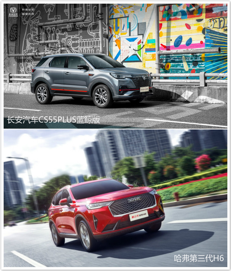 不知从何时起,SUV成了国内家庭的首选。面对极大的市场热情,从合资到自主,大家纷纷参与其中。不过随着近年来自主品牌的强势崛起,尤其在十万元级别SUV这个细分市场上,自主品牌凭借极高的配置、亲民的售价以及突出的实用性独领风骚,力压合资品牌成为大家关注的焦点。最近,长安汽车和长城汽车都推出两款新品——全新CS55PLUS蓝鲸版和第三代哈弗H6。面对焕新上市的产品,人们在表示高兴的同时也有点犯难,面对两个极具实力的品牌和车型,到底选择谁真的很难抉择。面对疑惑,下面不妨来一次比较,看看哪款车更胜一筹。 颜值篇:或科幻或时尚,谁才是最靓的仔? 随着90后、00后逐渐成为汽车市场消费的主力军,他们对汽车的要求也不再局限于三大件。外观设计是否亮眼,颜值是否在线成为他们选车的第一步。全新CS55PLUS蓝鲸版和第三代哈弗H6都是全新设计而来,两者风格不同,不知你会更倾心于哪一款? 全新CS55PLUS蓝鲸版的设计理念源自长安汽车“御岳”概念车,从火山喷发后天然形成的黑曜石中汲取灵感,犹如能量在岩石中蓄势待发,力量感十足,激情四溢。整车采用深灰色车漆,再以红色线条点缀,整体风格更为科幻、更为激进。而它最亮眼的设计来自车头,线条勾勒、镀铬点缀,再加造型夸张的菱形格栅和犀利的大灯组,共同打造出极具张力的前脸造型。 车尾与车头一样精雕细琢而来,同样以浓浓的运动气息示人,与整车设计达到高度默契。双边四出的尾排设计充满战斗力,贯穿式尾灯兼顾时尚气息,车尾造型完美诠释了整辆车的时尚动感风格。同时,全新CS55PLUS蓝鲸版的轮辋与后护板均采用了单色喷涂处理工艺,轮拱造型力量感十足,搭配18寸深灰色轮毂,满满的肌肉感,刺激着消费者的驾驶欲望。 看过CS55PLUS蓝鲸版再看这边,第三代哈弗H6同样焕新而来,新车依旧保留了浓浓的气势感。前脸采用了大面积的六边形进气格栅,内部是交织的网状镀铬装饰。此外,车头修长的LED大灯看上去十分犀利,配合上造型夸张的运动包围,整体看起来非常凶悍,辨识度极高。同时尾部的造型也十分饱满,与CS55PLUS蓝鲸版一样采用了贯穿式的尾灯,时尚亮眼。不过隐藏式排气管稍显内敛,比起全新CS55PLUS蓝鲸版,少了几分战斗的意思。 动力篇:同为1.5T,全新CS55PLUS蓝鲸版能量更足 外观设计见仁见智,其实全新CS55PLUS蓝鲸版和第三代哈弗H6的外观都很有料,战斗、运动是他们共同的标签。不过当真正驾驶起来谁更战斗?就需要在动力层面一较高下了。全新CS55PLUS蓝鲸版和第三代哈弗H6均采用了1.5T涡轮增压发动机匹配7速双离合变速箱的动力总成,不过在数据方面,全新CS55PLUS蓝鲸版更胜一筹。 搭载在全新CS55PLUS蓝鲸版上的这款蓝鲸1.5T高压直喷发动机是长安汽车蓝鲸动力品牌旗下的一款全新产品,以“劲”、“净”、“静”三大亮点为消费者称道。 蓝鲸NE 1.5T高压直喷发动机能够迸发出132kW的最大额定功率,在1250转输出300N·m峰值扭矩,比哈弗1.5T发动机等同排量的发动机更为亮眼。同时,这台发动机拥有AGILE敏捷燃烧(空气引导、缸内直喷、超低排放燃烧)技术、可变排量机油泵、可控PCJ、低粘度机油设计等多项技术加成,使得全新CS55PLUS蓝鲸版百公里油耗仅6.4L,远超同级。不仅如此,在静音正时链条、无间隙的液压挺柱、TVD及双质量飞轮等先进技术的加持下,这台发动机怠速声压仅为60.8dB,静谧的驾乘环境令乘员如在图书馆一般。 第三代哈弗H6虽然也搭载了一套1.5T涡轮增压发动机,但其账面数据却不够亮眼,最大功率仅为124kW,与全新CS55PLUS蓝鲸版相比自然有些力不从心。所以综合来看,在动力层面全新CS55PLUS蓝鲸版无疑性价比更高,也更适合家用。