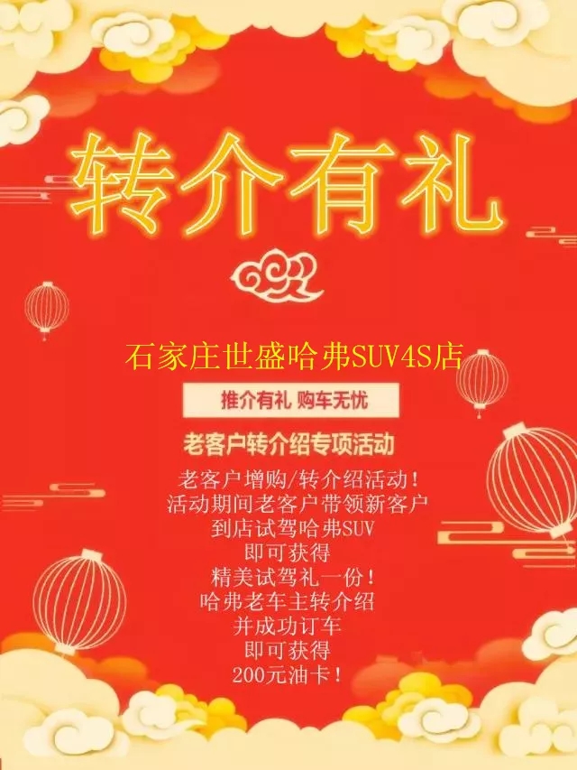 尊贵的哈弗车主朋友们,哈弗汽车石家庄世盛店,重磅推出:老客户增购/转介绍活动! 即日起,任意哈弗车主朋友,参加老客户增购/转介绍活动。带领新客户到店试驾,即可参与领取1元抵50元购物券活动!哈弗车主介绍新客户成功提新车,即可获赠200元加油卡一张! 具体活动详情,请咨询: 公司:石家庄市世盛汽车销售有限公司 地址:北二环建华大街交口(汽车园区内) 电话:0311-85616081 |
