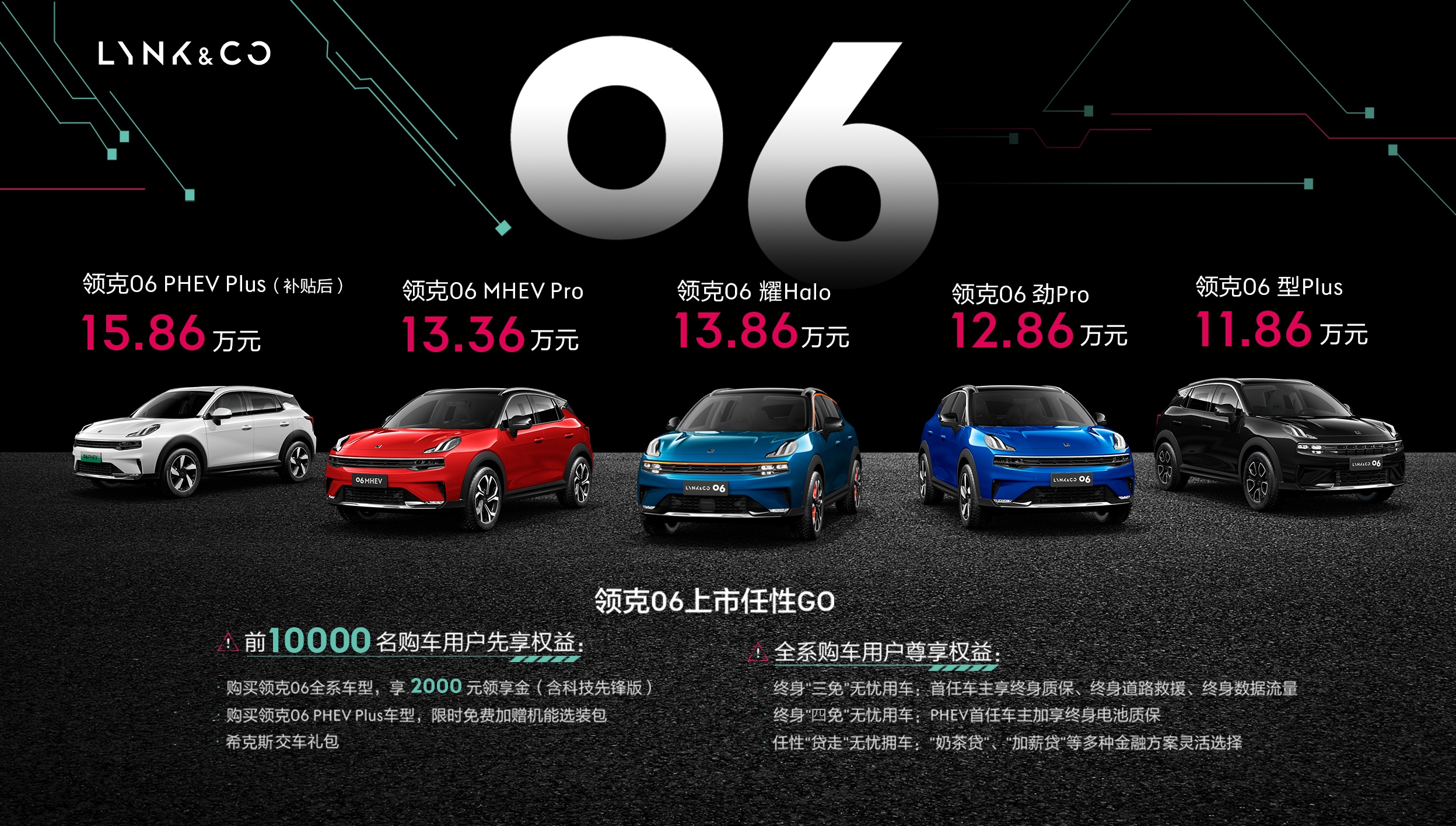 9月6日,全球新高端品牌领克汽车旗下“新都市机能SUV”领克06正式上市,新车发布了三款动力版本共计五款车型,分别为型Plus、劲Pro、耀Halo、MHEV Pro、PHEV Plus,售价区间为11.86-15.86万元,领克06以起步即豪华的硬核机能实力,为全球年轻都市族群带来更高价值的用车体验。 领克06上市车型价格及购车政策 上市同时,领克06推出“任性GO”购车权益。前10000名购车用户获先享权益:购买领克06全系车型,享2000元领享金(含科技先锋版)、希克斯交车礼包;若购买车型为领克06 PHEV Plus,限时免费加赠机能选装包。全系购车用户获尊享权益,包括终身“三免”无忧用车:首任车主享终身质保、终身道路救援、终身数据流量;终身“四免”无忧用车:PHEV首任车主加享终身电池质保;任性“贷走”无忧拥车:“奶茶贷”、“加薪贷”等多种金融方案灵活选择。 围绕“无惧翻滚的后浪,任性有理”主题,领克06上市发布会创设06机能之城,发布会采用“无品牌方领导出席”的任性方式,跨界联合美妆、美食、科技、健身四大领域KOL,以“用户思维”发布“后浪生活方式解决方案”,开辟汽车上市发布全新方向;重构“人、场、货”传统直播模式,创新发布会形态,助力Z世代构建理想中的未来生活;融合全新XR技术,打造机甲希克斯,并由知名主持人李晨联手视觉艺术家、高达设计师河森正治,以及机能主理人们,共同探索设计、健康、科技背后的社交新生态。领克06上市发布会通过场景化、沉浸式的体验形式,创造“不止于车”的品牌体验,传递“任性有理”的价值主张。
