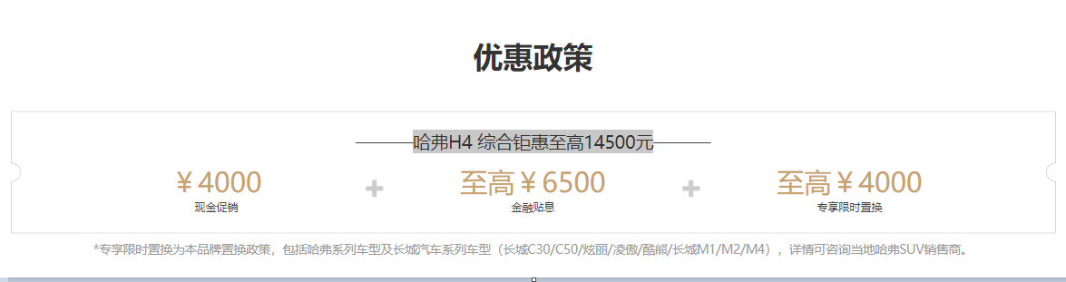 而在金九银十的消费旺季,哈弗品牌也在持续造势回馈消费者的支持与肯定。哈弗H4的起售指导价仅为7.39万元,现在购买还可享受包括专项置换补贴至高4000元、金融贴息至高6500元以及现金优惠4000元在内的至高14500元综合钜惠。超低的入手门槛加上超值钜惠,更加凸显了哈弗H4极高的品价比。