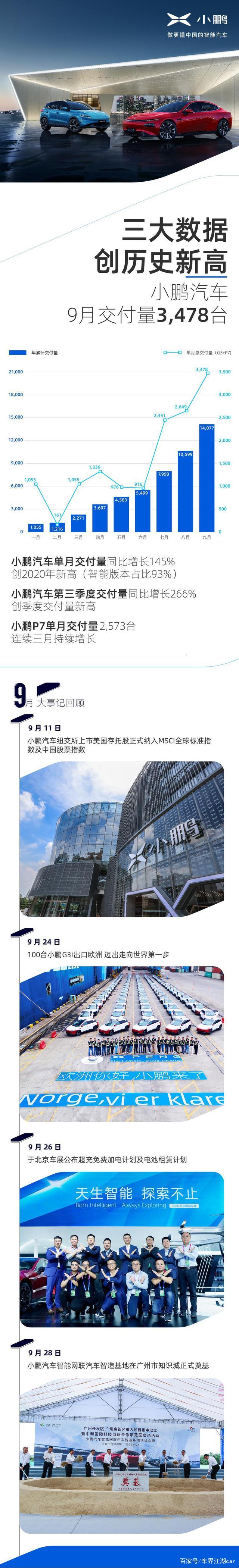 【2020年10月5日】今日,小鹏汽车公布了9月交付成绩,其三大数据创历史新高:小鹏汽车单月总交付量达到3,478台,同比增长145%,创2020年单月交付量新高;2020年第三季度交付量8,578台,同比增长266%,创季度交付量新高;小鹏P7单月交付2,573台,创单月交付量新高,自其6月底启动规模交付以来,已实现连续三个月的稳定增长。 值得一提的是,在小鹏汽车所有交付车辆中,超过93%的用户选择了搭载XPILOT智能驾驶辅助系统的智能版车型,充分说明其智能化标签已深入人心,并深受欢迎。小鹏汽车凭借其端到端的数据闭环,通过自研,在自动驾驶、智能交互等各个方面持续升级和迭代,已成为中国智能汽车的领军品牌。 在9月,小鹏汽车也迎来了多个里程碑事件:11日,小鹏汽车纽交所上市美国存托股正式纳入了MSCI全球标准指数及中国股票指数;24日,100台小鹏G3i在广州新沙港发运至欧洲挪威,正式迈出了走向世界市场的第一步,也宣告了小鹏汽车在欧洲市场获得了第一批订单;在刚刚过去的北京车展上,小鹏汽车公布“超充免费加电计划”及“电池租赁计划” 两大购车及用车政策,让消费者可以更早享受一台智能汽车完全不同的出行体验;9月28日,小鹏汽车智能网联汽车智造基地在广州市知识城智能装备区正式奠基,并同时获得广州开发区管委会的全资企业广州凯得投资控股有限公司40亿人民币融资。企业、产品及服务的稳健发展,将进一步提升小鹏汽车的用户体验,为“做更懂中国的智能汽车”打下越发坚实的基础。 一图读懂小鹏汽车九月交付成绩—— |