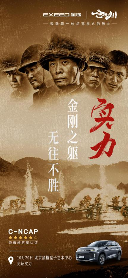 | 以勇气凝聚力量,用信念铸就坚强!EXEED星途全新一代TXL将于10月20日正式上市,并携手即将上映的抗美援朝主题电影巨作《金刚川》,以钢铁意志奏响热血战歌。 EXEED星途全新一代TXL将携手电影《金刚川》热血启幕 敢亮剑 热血集结塑时代风骨 博全力 精进锤炼造实力底蕴 正如《金刚川》海报所示——“没有退路”。顾往思今,正是中国人民坚忍不拔的信念和一往无前的勇气,铸就了今日民族复兴的大国实力。《金刚川》作为一部铭刻历史、致敬英雄的热血影片,将充分展现志愿军战士坚毅无畏的英雄精神和风骨气节,是对中国精神、中国力量的完美演绎。 长久以来,国际品牌占据着中国汽车市场大壁江山,中国品牌向上的每一步都充满艰辛与挑战。而奇瑞深谙技术创新是国家富强和民族振兴的灵魂,打造出完全具有自主知识产权的高端品牌——EXEED星途。 作为中国力量的坚守者和探索者,EXEED星途在这场“突围战”中敢于亮剑,以勇气实现品牌不断超越、以坚守构建自主研发体系、以实力刻画赶超国际一流蓝图,在这片坚实的土地上,为产品工艺每一分的精进,博出全力。 全新一代TXL以民族精品再续中国品牌辉煌 敢超越 砥砺前行铸时代辉煌 超五星 中国力量助进阶新生 随着中国品牌自主研发能力的提升,“中国质造”力量已然崛起。作为奇瑞高端品牌,EXEED星途“不断探索,超越自我”,以正向研发体系和全球化视野,基于世界级M3X火星架构打造出全场景超五星SUV全新一代TXL,用超越合资、媲美豪华的技术实力,实现全方位进阶新生。 全新一代TXL实现高品质全方位向上突破 全新一代TXL凭借78%高强度钢笼式车身结构、36.5米超短制动距离,实现超越国际一线豪华品牌的C-NCAP 5星+超五星安全;22项ADAS功能,可实现L2.5级自动驾驶;Lion4.0雄狮智云系统,人车交互体验更优,实现超五星智能。 全新一代TXL突破现有五座SUV空间格局,为每一位乘客打 造VIP级享受 全新一代TXL拥有2,800毫米超长轴距,确保每一位乘客都拥有VIP级的超五星空间享受;同时,全新一代TXL突破以视觉衡量的传统套路,以智感美学2.0设计理念,打造出将视觉冲击与功能巧思完美融合的“无边界”超五星颜值;而本特勒大师级底盘、博格华纳智能四驱系统、双12.3吋高清液晶显示屏和行政级静音座舱,更将超五星品质展现的淋漓尽致。全新一代TXL在带给消费者触手可及“五星+”价值体验的同时,更让民族精品再续中国品牌辉煌。 无论世界时局如何变幻,中国品牌将披荆斩棘、一往无前。EXEED星途将以怎样的勇气、坚守与实力,谱写中国力量不断向上的英雄篇章,10月20日19:30,北京黑糖盒子艺术中心,热血即将启幕。届时《金刚川》电影主创团队及神秘军事大咖将共同亮相发布会现场,让我们共同期待! 【星途品牌】 EXEED星途是奇瑞旗下高端品牌。EXEED的名字源于“EXCEED(超越)”。“星途”:星,代表星空,一片始终渴望探索的未知领域;途,代表征途,一段不断超越的历程。EXEED星途由国际化团队研发、设计与营销,全球同步上市。以一流的设计和领先的技术为基础,以人工智能为差异化,以客户为尊的服务为理念,打造全新、领先的中国汽车高端品牌。 【星途品牌精神】 EXEED星途,敢超越。所谓超越,不是超越别人,也不是超越世界,而是学会如何超越自我。 将“EXCEED(超越)” 定义为一种自我超越,在自己熟知的领域里, 保持一颗超越向前的心,对自己的未来充满渴望,勇于探索未知, 挑战尝试。不断超越自我,遇见更惊喜的生活和未来。 【M3X火星架构】 基于“不断探索、超越自我”的品牌精神、23年的成熟造车经验和五大研发中心的全球布局,EXEED星途携手全球顶级供应商麦格纳打造出具有世界级水准的M3X火星架构。“M”,意指火星Mars,见证着人类对未知的无尽探索;“3”生万物,代表星途产品的多元衍生性;“X”则预示无限可能。M3X火星架构,是EXEED星途孕育中国智能新高端产品的智慧载体,象征着EXEED星途不断向“无限可能”探索的勇气与决心。 【星途产品】 目前,EXEED星途产品包括10万级极智SUV星途LX、全境智驾SUV星途TX系列、全场景超五星SUV全新一代TXL、给家人的礼宾级SUV星途VX。 |