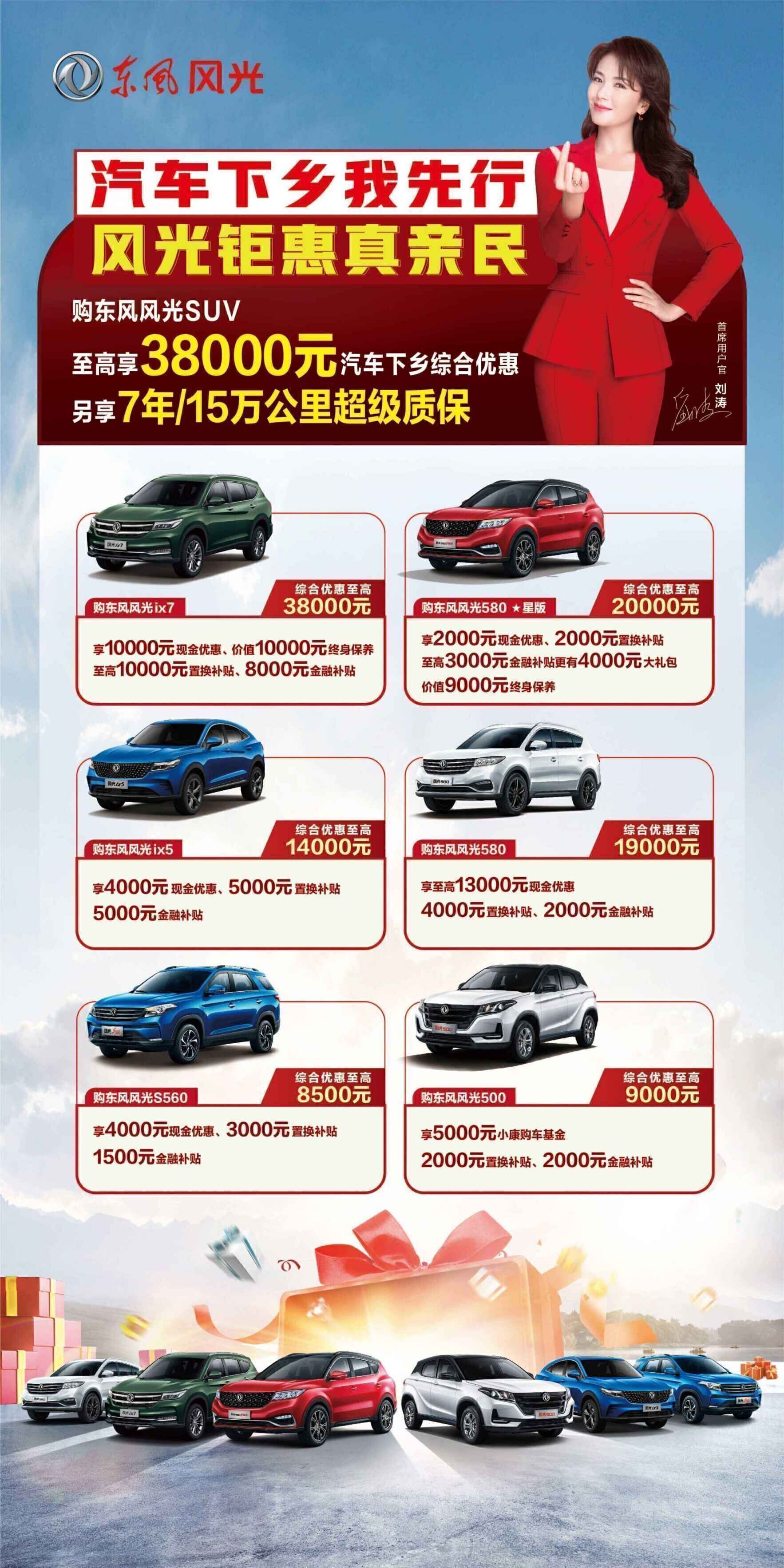 11月18日,在国务院常务会议上,新一轮汽车下乡和以旧换新再次成为提振大宗消费和促进释放农村消费潜力的重点。始终坚持“亲民车”品牌定位的东风风光积极响应国家号召,并率先发力勇做新一轮汽车下乡的先行者,重磅推出了“汽车下乡我先行 风光钜惠真亲民”的普惠举措。即日起,在全国范围内,购东风风光SUV至高享38000元汽车下乡综合优惠,并享受7年/15万公里超级质保,补贴范围覆盖风光500、风光580★星版等全新车型及风光ix7、风光ix5、风光580、风光S560等现有主力车型,以实际行动践行国家新政,并进一步推动中国车市进入全民SUV时代。