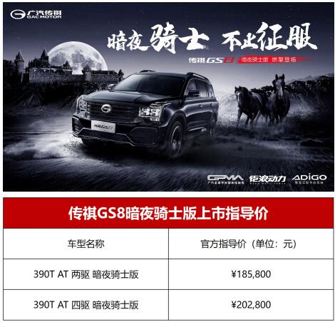 在刚刚结束的2020广州国际车展上,广汽传祺展台热闹非凡,传祺GPMA架构首款运动轿车传祺EMPOW55首次亮相,备受关注。此外,以一袭黑色战衣登场的传祺GS8暗夜骑士版,虽然还未上市,也吸引众多消费者驻足围观。 今天,颜值与内涵兼具的传祺GS8带着它的新皮肤来了,传祺GS8暗夜骑士版于今日正式上市。硬核豪华再升级,传祺GS8暗夜骑士版新增熏黑外观打造魅黑造型,以更时尚个性的魅黑造型满足年轻消费群体的需求,并提供两驱版本和四驱版本车型供消费者选择,其中暗夜骑士两个版本的售价与豪华智联版车型保持一致。同等价格同等配置,加上如此酷炫的外观,你被它迷惑了吗?