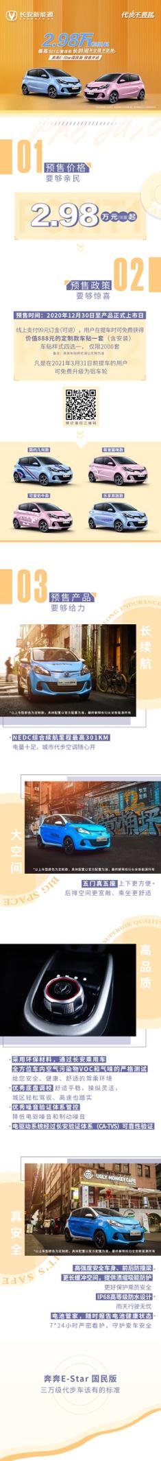 近年来,在代步出行市场新能源汽车凭借较低的购车、用车成本越来越受欢迎,成为新能源汽车的一个热门品类。12月30日,长安新能源重磅切入3万元级市场,正式开启奔奔E-Star国民版预售活动。新车预售价格为2.98万(限量)起,为国民代步出行带来新选择。此次预售活动时间为2020年12月30日至产品正式上市日。线上支付99元订金,用户在提车时可免费获得价值888元的定制款车贴一套(含安装),车贴样式四选一, 仅限2000套。(备注:具体车贴样式请以实物为准)。凡是在2021年3月31日前提车的用户,可免费升级为铝车轮。此外,在预售期内,用户在到店提车核销前,若需取消订单,可以发起退款流程,退还相关订金;用户到店提车核销后,订金不可退还。而获得定制款车贴的用户,到店提车时,凭订单信息进行车贴安装。
