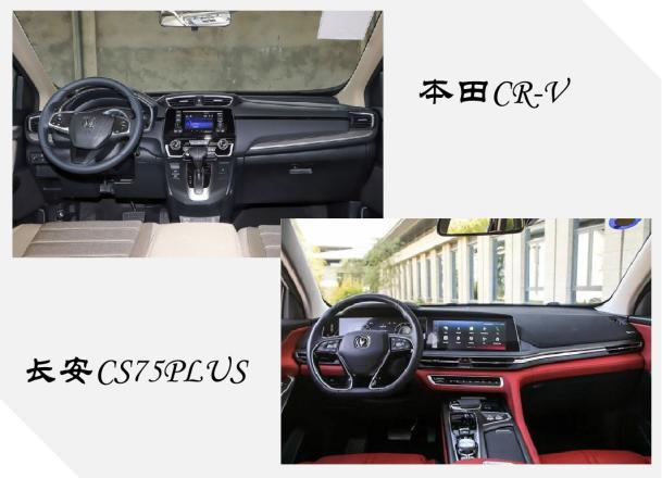 空间内饰PK 本田CR-V长宽高分别为4585×1855×1678mm,轴距2660mm。这个尺寸在紧凑级SUV中不算拥挤,但是也不算宽敞。内饰设计上,本田CR-V保持了日系应有的做工水平,但设计上却比较保守,仍采用对称式中控台,没采用任何时下流行的风格,且中控液晶屏只有5英寸,更是令人感觉脱离了时代。此外,本田CR-V次低配车型的仪表盘依然是传统机械式指针,中间的液晶显示屏也是单色。如此一来,无论视觉体验还是使用体验,都只能说刚刚够用。座椅方面,次低配的本田CR-V依然没有什么惊喜,无论主副座椅都不具备电动调节、电加热等功能,且座椅面料也是织物。好在座椅舒适度还可以,久坐也不觉疲劳。 长安CS75PLUS长宽高分别为4700×1865×1710mm,轴距2710mm。相比本田CR-V无论是外形尺寸,还是内部空间都大了一圈。对于长途驾驶而言,更宽敞的空间无疑是舒适性最好的保证。在内饰设计上,长安CS75PLUS充满了未来感。双12.3英寸全高清液晶屏与触控屏连为一体构成三联屏,借助高性能3D图像处理引擎的搭载,画面异常细腻。此外,长安CS75PLUS的方向盘也采用D字型设计,与一体化运动座椅,及红黑车内配色相结合,营造出强烈的运动感。同时,座椅表面还包裹了高档NAPPA皮纹材质,主副驾座椅都具备电动调节和电加热功能。并且后排座椅完全放倒后,还能与后备箱地板形成一个纯平面。所以论是体验感还是舒适性,长安CS75PLUS都更令人满意。