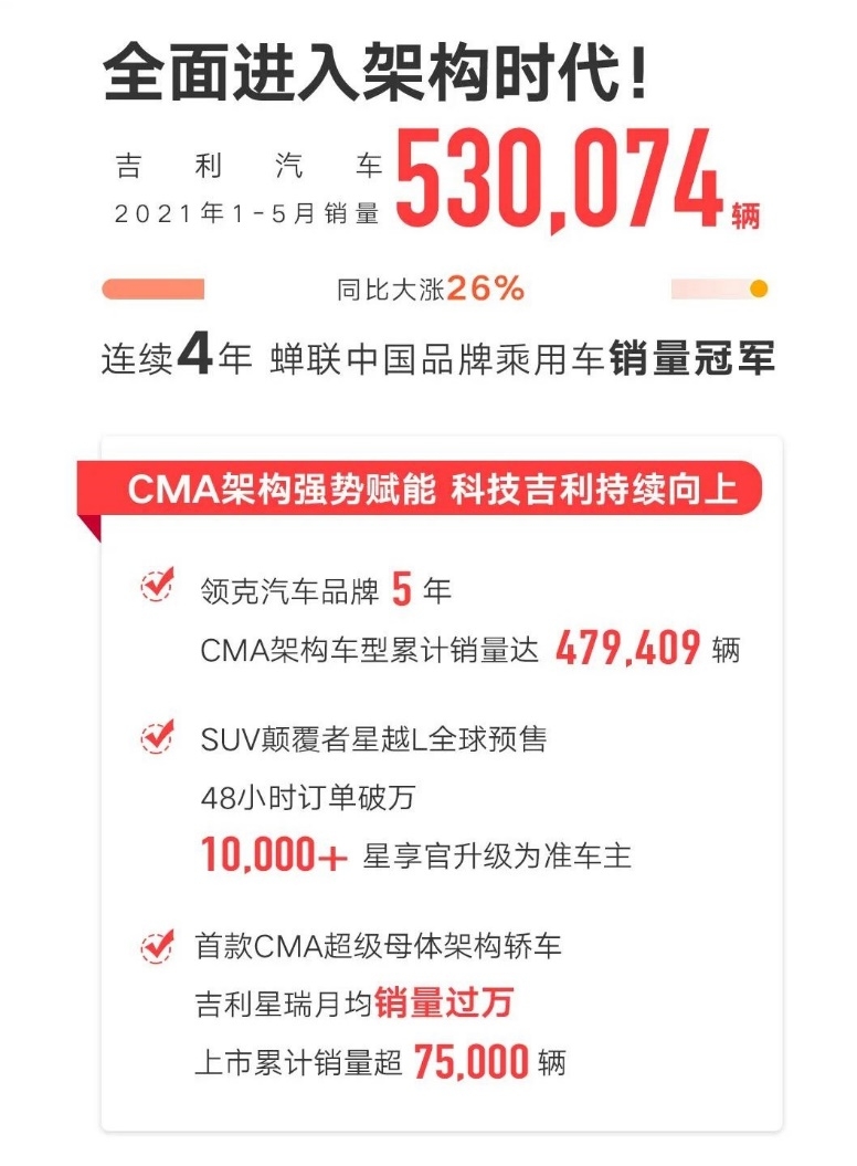 | 6月7日,吉利汽车控股有限公司(HK.0175)公布2021年5月销量数据:5月销量96167辆,1-5月总销量530074辆,同比增长约26%。其中,全球新高端品牌领克汽车5月销量为18059辆,同比增长约39%,领克全系车型累计销量达520744辆。同时,在架构造车赋能下,吉利汽车集团CMA家族总销量成功突破600000辆,引领科技吉利持续向上。 在新能源领域,几何A、几何C、帝豪EV、帝豪GSe等新能源及电气化产品,5月总销量为6284辆。海外出口方面,5月出口量为10384辆,同比增长约235%。吉利汽车持续拓展海外市场,COOLRAY(缤越)相继在尼日利亚、巴拉圭、安哥拉上市,为当地消费者带来超越期待的用车体验。 CMA架构强势赋能 “星系列”成吉利销量新担当 当前,吉利汽车正迈入科技吉利4.0时代全新发展阶段,架构造车持续发力,科技吉利持续向上。截至目前,吉利汽车集团CMA家族累计总销量已突破600000辆,其中由星瑞、星越、星越L组成的“星系列”高端产品,充分发挥了CMA架构在品质、性能、技术方面的领先性,“家轿颠覆者”吉利星瑞5月销量10056辆,上市7个月累计销量达75332辆;6月5日,星瑞时空版开启盲订,限量1000辆,秒售罄,平均每秒售出2.4辆。 星越L作为吉利高质量发展代表车型,继承了CMA架构“安全、健康、智能、性能、节能”五大全球基因,于5月25日开启预售,预售价14.8万-18.8万元,预售48小时订单即破万,展现了SUV颠覆者的实力与底气。星瑞+星越L组成的“颠覆者CP”成为紧凑型轿车和SUV的品质天花板,并逐渐成为吉利的销量担当。 主销车型全面换代升级 吉利帝豪进入架构造车时代 5月,吉利汽车旗下轿车销量为36639辆,SUV销量为57961辆。其中,博越家族和帝豪家族依然表现强劲,由博越亚运版、博越PRO和博越百万款组成的博越家族5月销量18047辆,累计销量突破122万辆。 帝豪家族5月销量18986辆,累计销量已超过319万辆。诞生于BMA架构的首款轿车——第4代帝豪5月30日首次亮相,继承前3代帝豪“冠军基因”的同时,也将为帝豪家族打开迎接下一个300万用户、走向下一个冠军的新开端。第4代帝豪还是2022年杭州亚运会官方指定用车和“亚运走十城 吉利伴你行”亚运巡游车,同时也是“科技吉利悦行亚运”的亚运战略载体,展现了吉利全新造车科技和卓越品质。 用户品牌“我们”正式发布 与用户共创美好吉利生活 6月6日,吉利汽车用户品牌“我们”正式发布,由用户共创的“我们”品牌LOGO、运营机制同步发布,新上线的吉利汽车App将成为“我们”共创的品牌阵地。此次活动不仅是吉利对“以用户为中心”、“开门造车”理念的践行,也是吉利构建“平台开放、用户共创”全新生态的开端,将促成吉利与用户不断探索实践“开放、共创、探索、快乐”的用户品牌价值。同时,活动当天一款集成用户idea的示意——Vision Starburst首次亮相,其所展示的“能量风暴”造型风格,将很快应用在吉利的新款车型上。 领克05插电混动版高光上市 持续深耕全球市场布局 全球新高端品牌领克汽车旗下极能运动SUV插电混动版——领克05 PHEV Halo已上市,官方指导售价为22.77万元。全新领克05 PHEV搭载Drive-E“双引擎”科技,提供电动模式、混动模式、动力模式、经济模式、电量保持模式共4+1种驾驶模式。为解决用户充电焦虑,领克05 PHEV拥有高效快充模式,交流电快充3小时内即可完成,为用户带来新能源品质生活,畅行绿色节能体验。 今年领克发展进入第五年,在中国销量突破50万辆的同时,领克持续深耕全球市场布局。2020年,领克 “欧洲计划”落地;2021年起,已有多批次全新领克01 PHEV整车出口欧洲,实现了常态化的整车出口,证明领克的“欧洲计划”已驶入快车道。同时,领克在欧洲开启了由汽车制造商向出行服务商的角色转变。截至今年5月,领克在欧洲已经收获了15000位“订阅制”的会员。 |