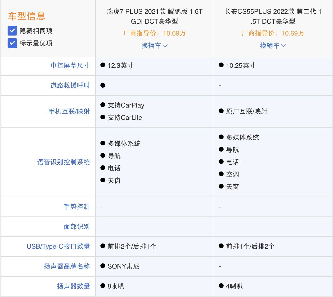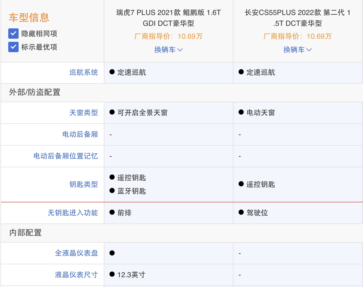 配置都很丰富 瑞虎7 PLUS更高级 在车载配置方面,瑞虎7 PLUS、长安CS55 PLUS都非常丰富。我们选取了市场价同为10.69万元的瑞虎7 PLUS 2021款 鲲鹏版 1.6TGDI DCT豪华型和长安CS55 PLUS 2022款 第二代1.5T DCT豪华型进行对比。 具体来看,像一些非常实用的配置,比如定速巡航、全景天窗、倒车影像、自动驻车、上坡辅助、陡坡缓降等,两款车都应有尽有。而相比后者,瑞虎7 PLUS 24.6英寸超大双联屏设计,显得科技感满满。作为一款售价10万以上的紧凑型SUV,液晶数字仪表的缺失让长安CS55 PLUS显得缺少诚意。