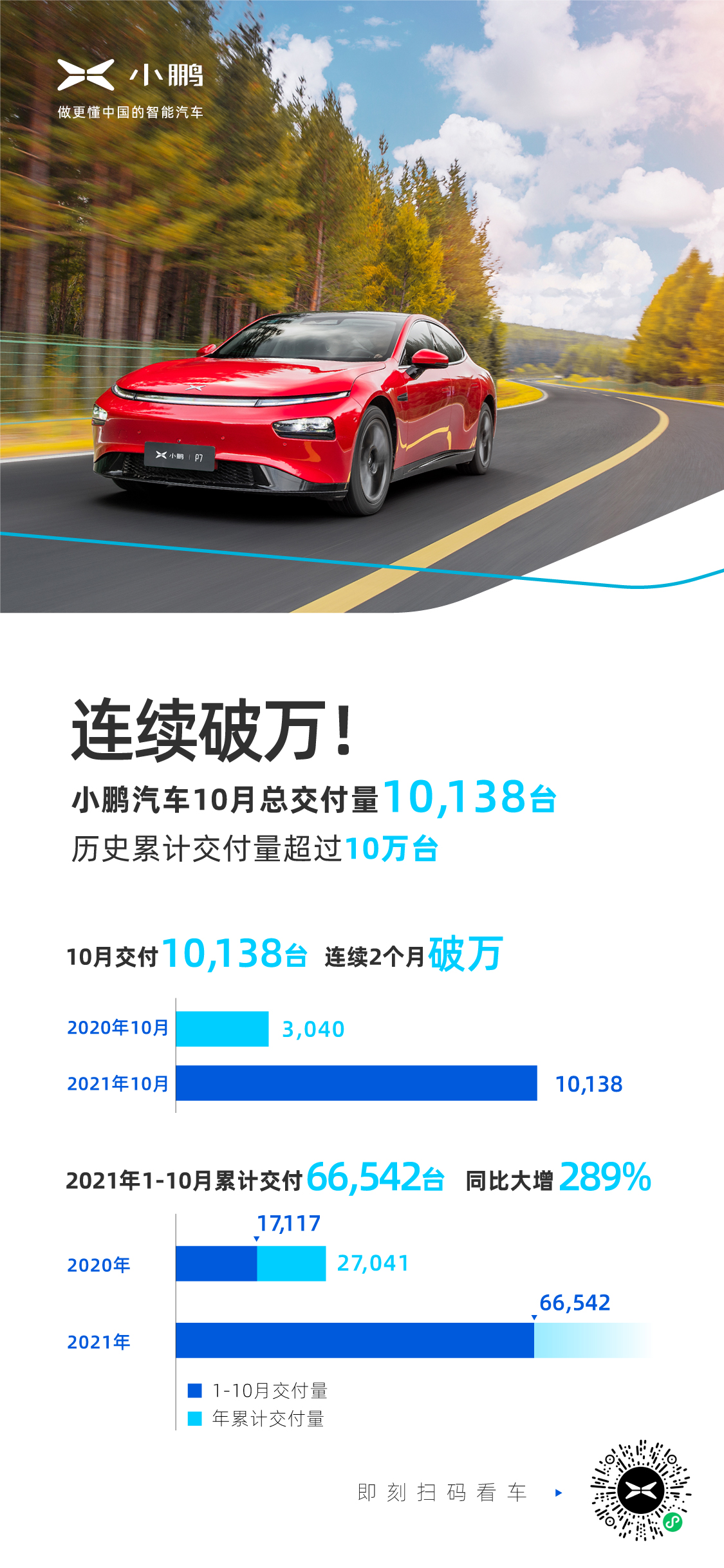 【2021年11月1日】今日,小鹏汽车公布最新交付成绩。10月小鹏汽车总交付量10,138台,同比大增233%,克服行业性芯片供应挑战,连续两个月交付突破万台。截至今年10月底,小鹏汽车历史累计交付量已突破十万。 单车型交付方面,10月P7交付6,044台,同比增长187%;G3的中期改款车型G3i自今年9月启动规模交付以来,一路走高,本月G3系列产品交付3,657台,创下此款车型自2018年面市以来的最佳月交付成绩。在9月15日上市的第三款量产车型P5市场反应踊跃,在手订单充裕,并在10月交付437台。今年前10个月,小鹏汽车已累计交付66,542台,是去年同期的接近4倍。 为了进一步降低用户用车门槛,解决用户的补能痛点,小鹏汽车持续加速积极布局城市通勤、高速出行等场景下的超充网络。截至9月底,小鹏汽车已于全国铺开439座小鹏品牌超充站,覆盖121个城市。同时,小鹏汽车采用优选第三方场站的模式,在全国221个城市,铺开1648座优质免费充电站,为用户提供极致的充电服务。在四季度,小鹏将继续提升充电、销售和服务网络的覆盖面,以迎接不断加速扩大的市场需求。 |