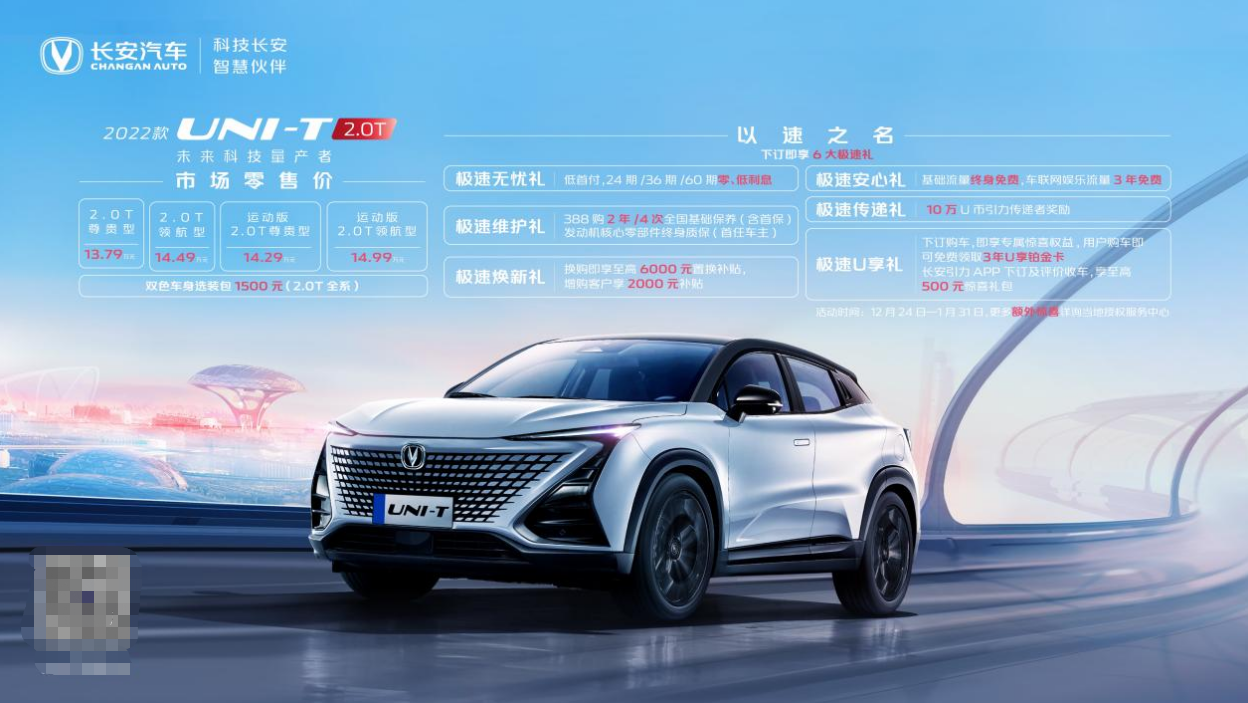 街跑风潮,属T闪耀。12月24日,长安汽车高端产品序列UNI,在厦门国际赛车场开启创趣玩法,特邀多名“大神”赛车手与用户组队PK,在燃擎赛场中,上演极速对飙,澎湃激情一触即发。与此同时,在全国百家汽车媒体的相约见证下,“未来街跑SUV”长安2022款UNI-T 2.0T高燃上市,全系推出4款车型,官方售价13.79-14.99万元。彰显个性美学,强化运动观感,长安UNI-T 2.0T新增售价1500元的双色车身选装包。 不枉“性能玩咖”用户期待,与长安2022款UNI-T 2.0T官方售价一同发布的,还有六项“极速”惊喜政策。低首付,24期/36期/60期零、低利息;388购2年/4次全国基础保养(含首保)发动机核心零部件终身质保(首任车主);换购即享至高6000元置换补贴,增购客户享2000元补贴;基础流量终身免费,车联网娱乐流量3年免费;10万U币引力传递者奖励;下订购车,即享专属惊喜权益,用户购车即可免费领取3年U享铂金卡,长安引力APP下订及评价收车,享至高500元惊喜礼包。 领潮出道,福利来袭!长安UNI用诚意打动“性能玩咖”用户,也更坚定了长安2022款UNI-T 2.0T这一街跑座驾之选。 探索澎湃驾趣,是年轻运动座驾不变的进化宗旨。始终以用户为中心的长安UNI,为满足“性能玩咖”进阶驾驶需求,推出搭载“2.0T+8AT”动力组合的UNI-T,注入澎湃动力,高能传递街跑魅力。 激情升级 蓝鲸2.0T迸发澎湃动力 标榜运动的产品,不仅要有颜值,更要体现实力。动力方面,长安2022款UNI-T 2.0T带给“性能玩咖”用户更多驾趣激情,其搭载蓝鲸新一代D系列2.0T发动机,拥有最大233匹马力,峰值扭矩390N·m的动力储备,发动机抵达1500r/min时,即可输出350N·m扭矩,澎湃动力随叫随到。 爱信8速自动变速器为进阶驾趣助力,拥有更高传动效率,以及更低锁止转速,换挡迅捷柔和,无论赛道激烈驾驶,或是应对日常拥堵,长安2022款UNI-T 2.0T实现随心驾驭,在捍卫驾驶愉悦感的同时,兼顾乘坐者的舒适。 长安2022款UNI-T 2.0T全系标配激情弹射起步模式,通过油门及刹车的配合,提升发动机起步转速,以最大加速度提升车速,在全力起跑时,长安2022款UNI-T 2.0T澎湃动力实现顷刻迸发,点燃逐速本能,潇洒领先一个车身。 运动颜值 长安UNI-T 2.0T崭露锋芒 身为街跑SUV,颜值一定要飒。长安2022款UNI-T 2.0T沿用UNI家族创新无边界格栅,犀利的分体式大灯组,激发运动感与科技感。全新离子蓝车身配色,时刻散发着优雅、运动魅力。2.0T专属红色T标,绽放运动锋芒。 黑色悬浮车顶设计更为“性能玩咖”用户带来个性化选择,长安2022款UNI-T 2.0T运动版车型,保留个性套件、炫酷造型轮毂,丰富“性能玩咖”用户选择,强化运动观感,上街即是焦点。 在万众瞩目中,长安2022款UNI-T 2.0T高燃上市。作为“未来街跑SUV”新选手,动力澎湃升级的长安2022款UNI-T 2.0T,将驾趣体验提升到全新高度,满足“性能玩咖”用户需求。13.79-14.99万元合理的售价区间,以及多项福利政策加持,持续增强着UNI-T系列的核心竞争力,更不断为“性能玩咖”用户带来惊喜。 |