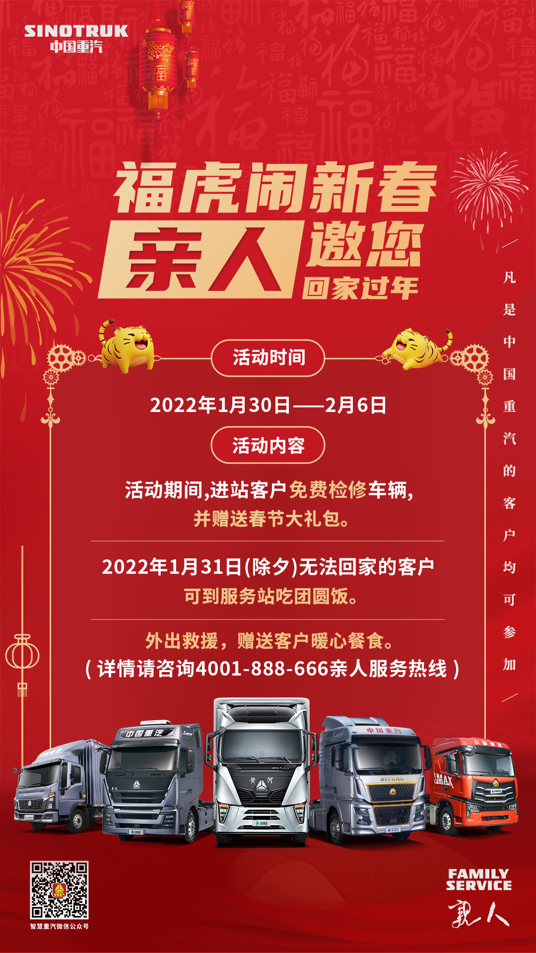 随着春节临近,各行各业的人们陆续返乡过年。常年奔波在路上的卡友们,本应趁着过年好好休息一下,但事实上,他们中的很多人即便过年也仍在路上。由于春节期间运费高,很多司机想要多跑跑,有的则是由于疫情原地过年而选择继续工作,他们为缓解春节期间的货运压力做出了不可忽视的贡献。 司机和车在路上,车辆的保障也必须如影随形,作为卡友们的“亲人”,中国重汽将于春节期间,推出“福虎闹新春,亲人邀您回家过年”服务活动,以诚意致敬在春节期间仍奋战在路上的卡友,以卡车界硬核服务为用户提供有力保障,携手卡友一同走入虎虎生威的壬寅虎年! 在2022年春节活动期间(2022年1月30日-2月6日),凡中国重汽的进站客户可享受车辆免费检修服务,并获赠春节大礼包。2022年1月31日(除夕)无法回家与家人团聚的客户,可到中国重汽服务站吃顿团圆饭,和志同道合的卡友们一起辞旧迎新,共话来年。对于需要外出救援服务的客户,中国重汽在快速响应、高效服务的同时,将为客户赠送暖心餐食,让等候更加值得。 春节期间各地路况复杂,加之数九寒天,在路上的卡友们面对的是更多的未知情况。中国重汽郑重承诺,将在春节期间以高质量服务、全天候守护确保用户在路上安心无忧:中国重汽400热线将在春节期间保持24小时畅通,随时守候,及时服务;各调度单位及中心库值班人员手机全天候24小时保持通讯畅通,确保车辆所需配件能够即时提报发运,随时为紧急维修、救援做好预案,争分夺秒为车辆提供保障;当车辆故障无法即时修复时,中国重汽将立即为客户启动代用车方案,确保货物的安全性和时效性,司机和货主的利益均不受损。一系列致力于提升客户体验的贴心考量,可见中国重汽想客户所想,与卡友同行的这份诚挚。 一直以来,作为老牌车企的中国重汽,在专注于打造世界一流的全系列商用车集团的同时,时刻不忘关注客户经营的全过程,于1999年正式成立的“亲人服务”,成为在重卡行业首创的服务品牌。目前,中国重汽“亲人服务”的网络已覆盖重卡1268家,轻卡935家,实现了400热线派单接通率97%,平均维修时效1.78个小时,24小时完工率98%,自备件满足率98.73%的高标准。二十多年来,中国重汽的“亲人服务”不断刷新商用车行业服务标杆,惠及每一位用户,每一辆车。 过年不止一种模式,团聚不止一种形式,平安吉祥才是过年的第一要义,“亲人服务”让客户与中国重汽的每一次相遇都无限温馨,只要卡友在路上,中国重汽的守护就无处不在。这个春节,中国重汽不打烊的春节服务,将给客户亲人般的陪伴,只要有亲人在身边,在哪里过都是团圆年! |