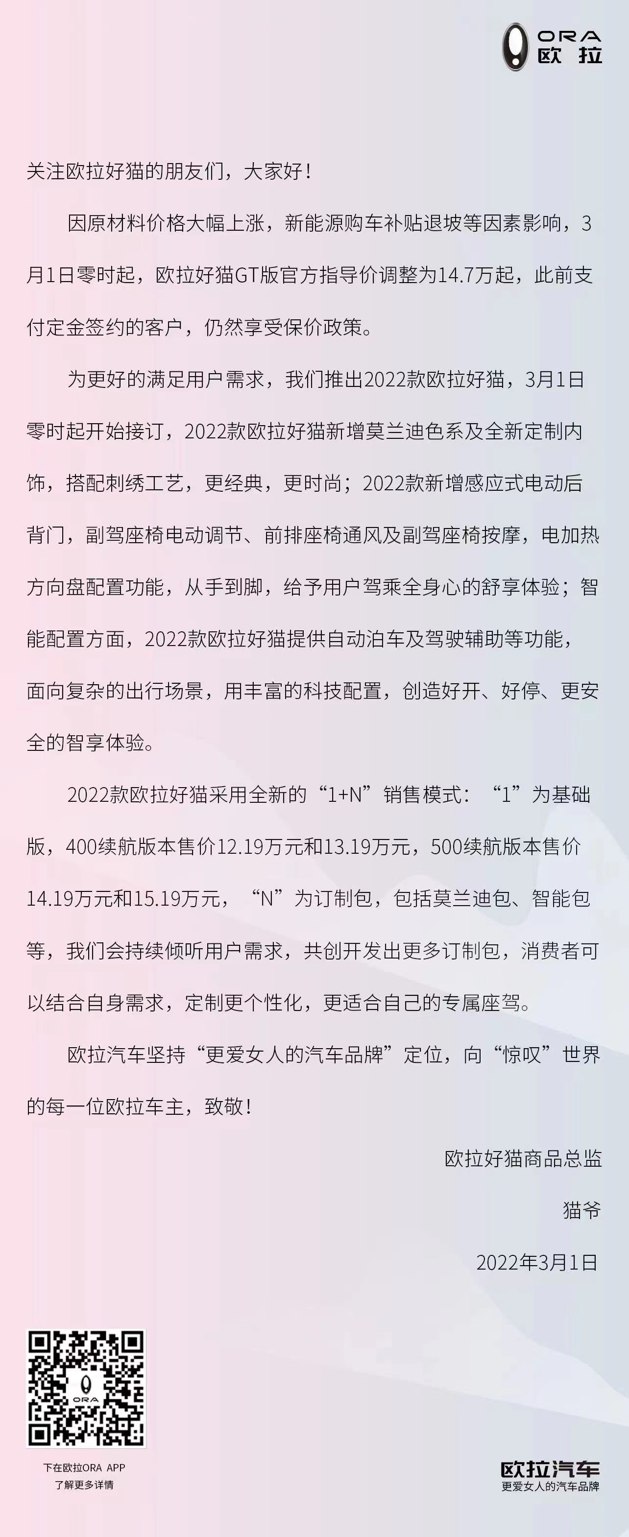 3月1日,欧拉APP发布”3月1日起,2022款欧拉好猫开始接订,好猫GT版价格调整”的消息。据悉,2022款欧拉好猫售价12.19万-15.19万元。采用“1+N”订制模式:其中,“1”代表400km和500km续航的好猫基础版车型,每个续航又根据配置不同分为两种配置版本;“N”为订制包,包括智能驾驶辅助和莫兰迪色选装包。不管购买哪个版本,用户都可根据自身实际用车需求及喜好订制选装包。 2022款欧拉好猫,舒适性配置全面升级 洞察新世代用户的消费需求,2022款欧拉好猫创新推出“1+N”订制模式,把选择权真正交到用户手中。 具体来看,2022款欧拉好猫提供400km和500km两个续航版本,共4款车型。每个续航版本又根据配置不同,分别推出两款车型,分别为400km续航豪华型12.19万、400km续航尊贵型13.19万、500km续航豪华型14.19万、500km续航尊贵型15.19万。此外,2022款欧拉好猫GT的售价调整为14.7万元。 作为基于市场需求升级而来的全新车型,2022款欧拉好猫最大变化之一就是舒适性配置的全面升级。在4款新车上,诸如18英寸铝合金轮毂、车身稳定控制系统、定速续航、360°全景融合影像、无钥匙进入系统等用户需求度更高的功能配置均为标配;在此基础上,400km和500km续航尊贵型,又分别增加了全景天窗、感应式电动后尾门、舒享模式,及带通风、加热、按摩功能的前排电动座椅等高阶配置,进一步体现出对女性用户的关爱和体贴。